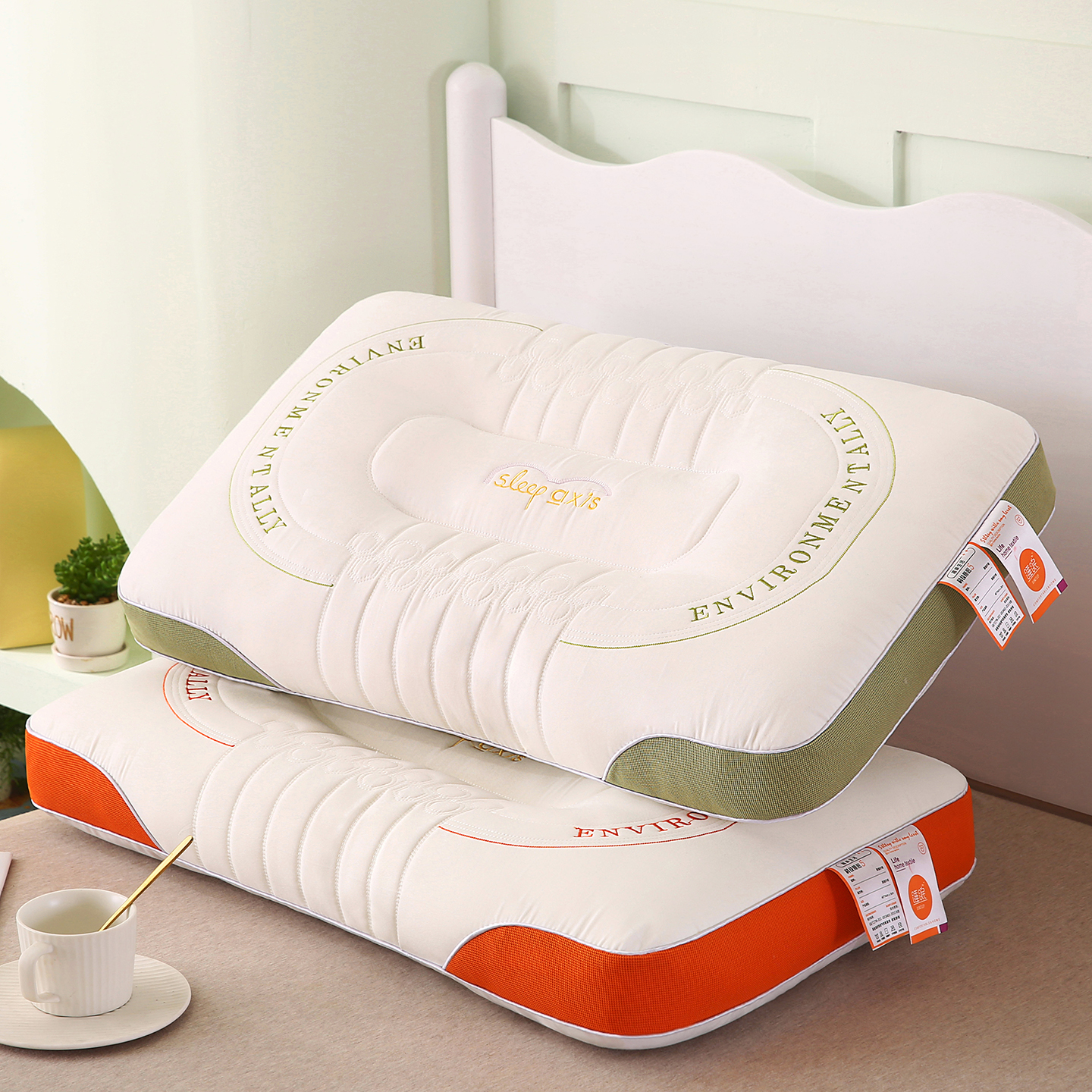 (总)爱来伊家纺 2026新款英文刺绣按摩枕枕头枕芯,英文刺绣按摩枕-绿色,英文刺绣按摩枕-橙色