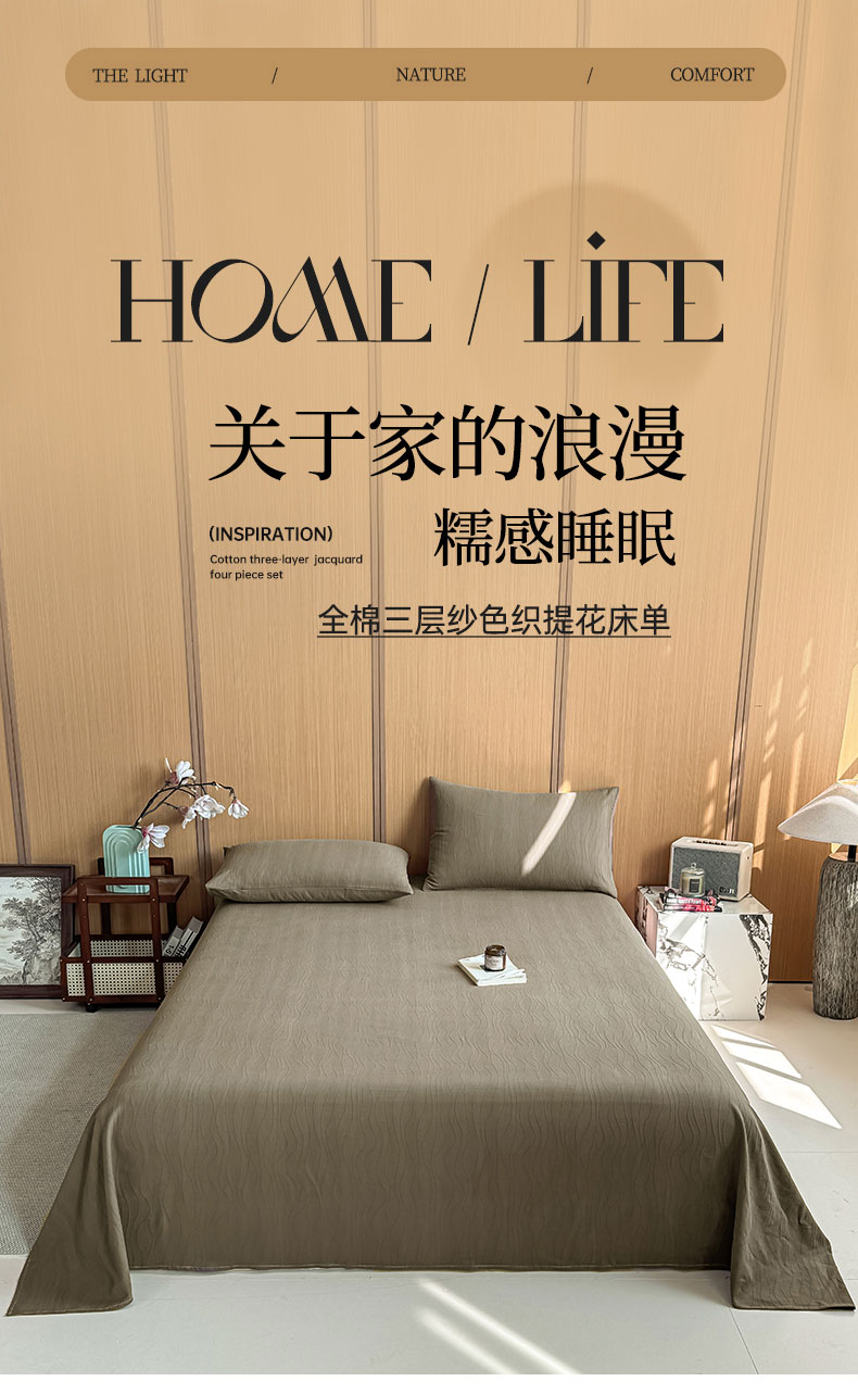 • 91家纺网 家纺一手货源 找家纺 灰鲸 2026新款全棉简约三层纱色织提花单品床单 浅忆-摩卡