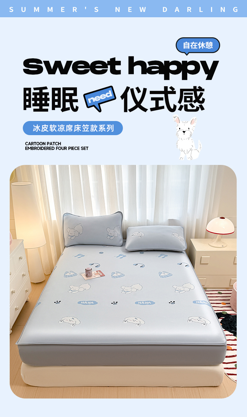• 91家纺网 家纺一手货源 找家纺 (总)布柔 2026新款冰皮凉席床笠冰丝小清新卡通印花软席可机洗,哈哈狗,初夏,哈基米,花语,蓝莓,礼物熊,铃兰兔,摩登时代,圣诞树,素叶,泰迪熊,条纹狗,晚安狗,小熊猫,绣球花,郁金香