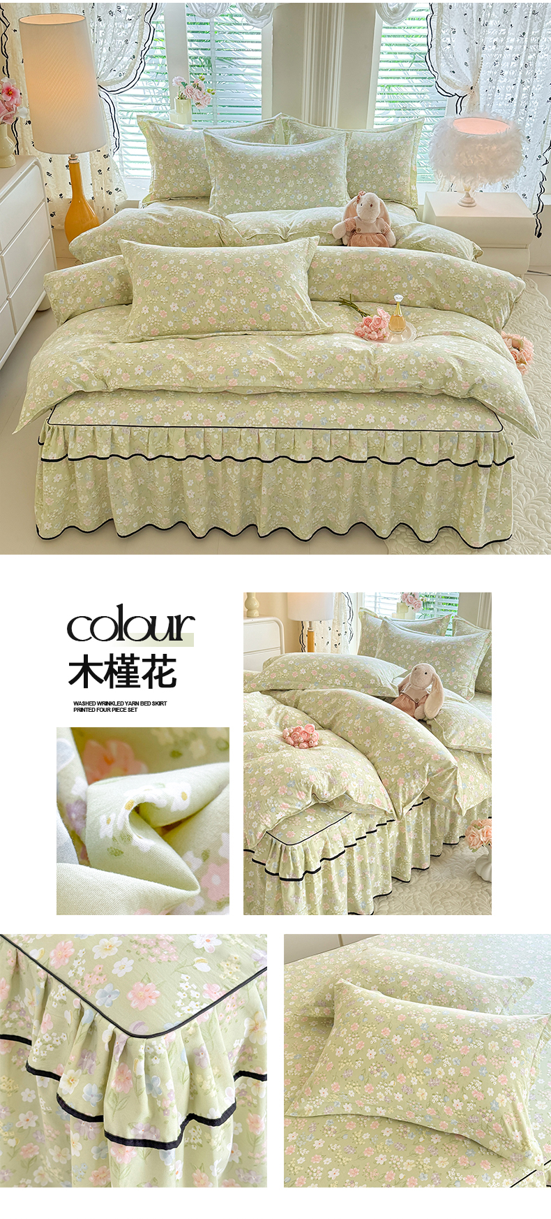 当前位置: 91家纺网 > 商品网购 > 床品套件 > 四件套 > 化纤普通四件套 > 优家居 2026新款A类水洗棉床裙四件套皱皱纱韩版公主风花边床罩直播爆款外贸定制 陌上花开