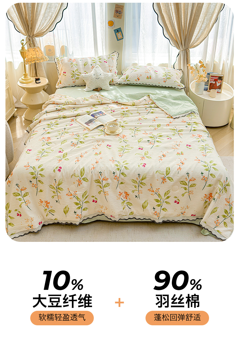招财星家纺 2026新款A类全棉花边云感双层纱大豆纤维夏被四件套夏被夏凉被空调被(带质检报告买家秀) 花边款-金枝玉叶