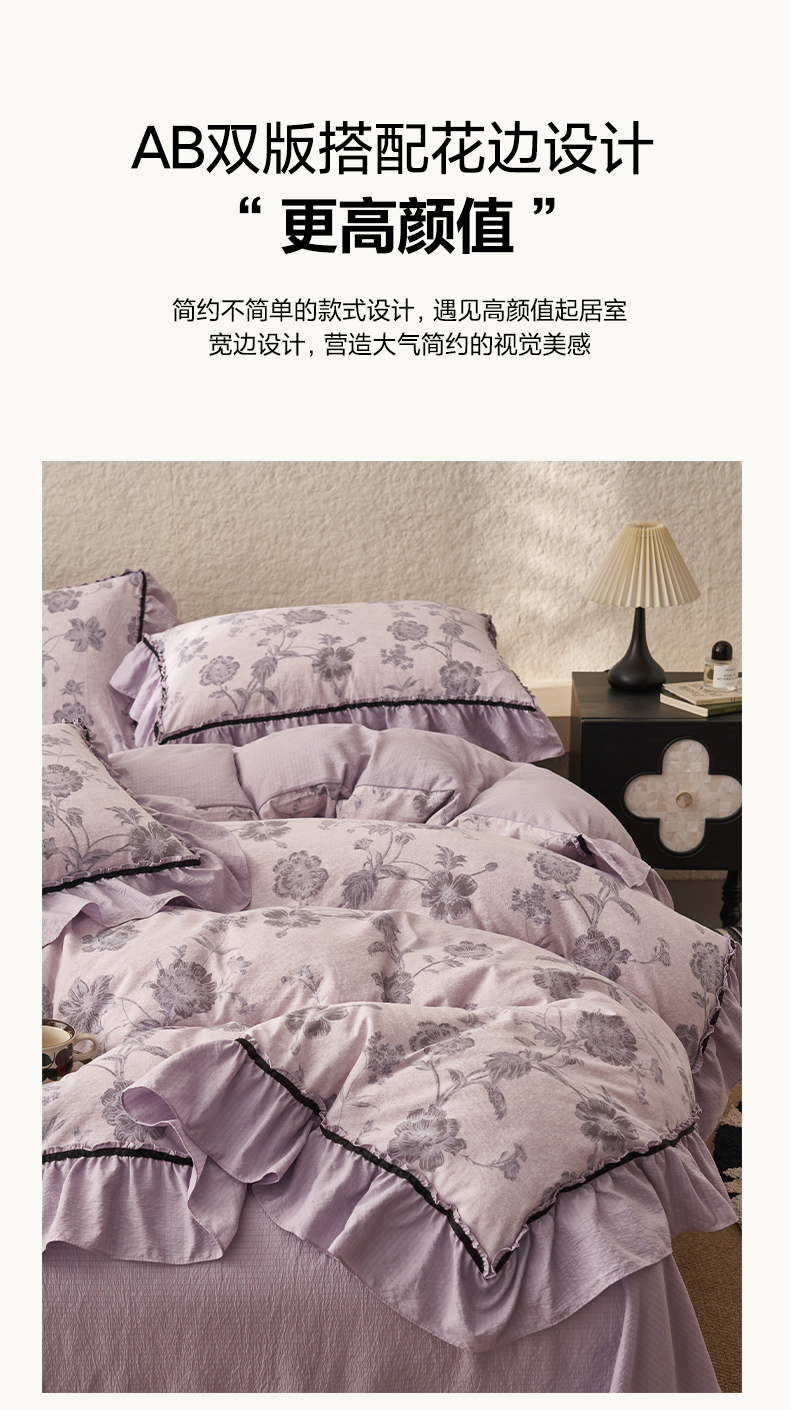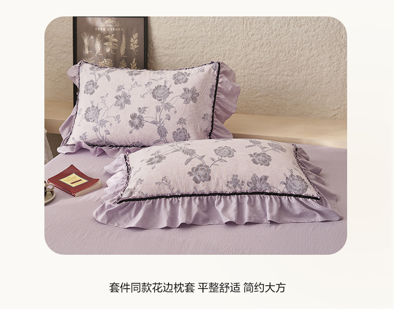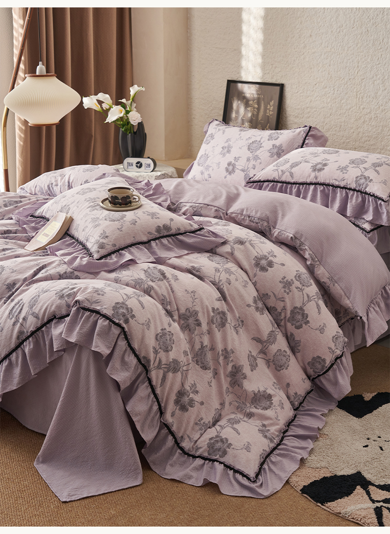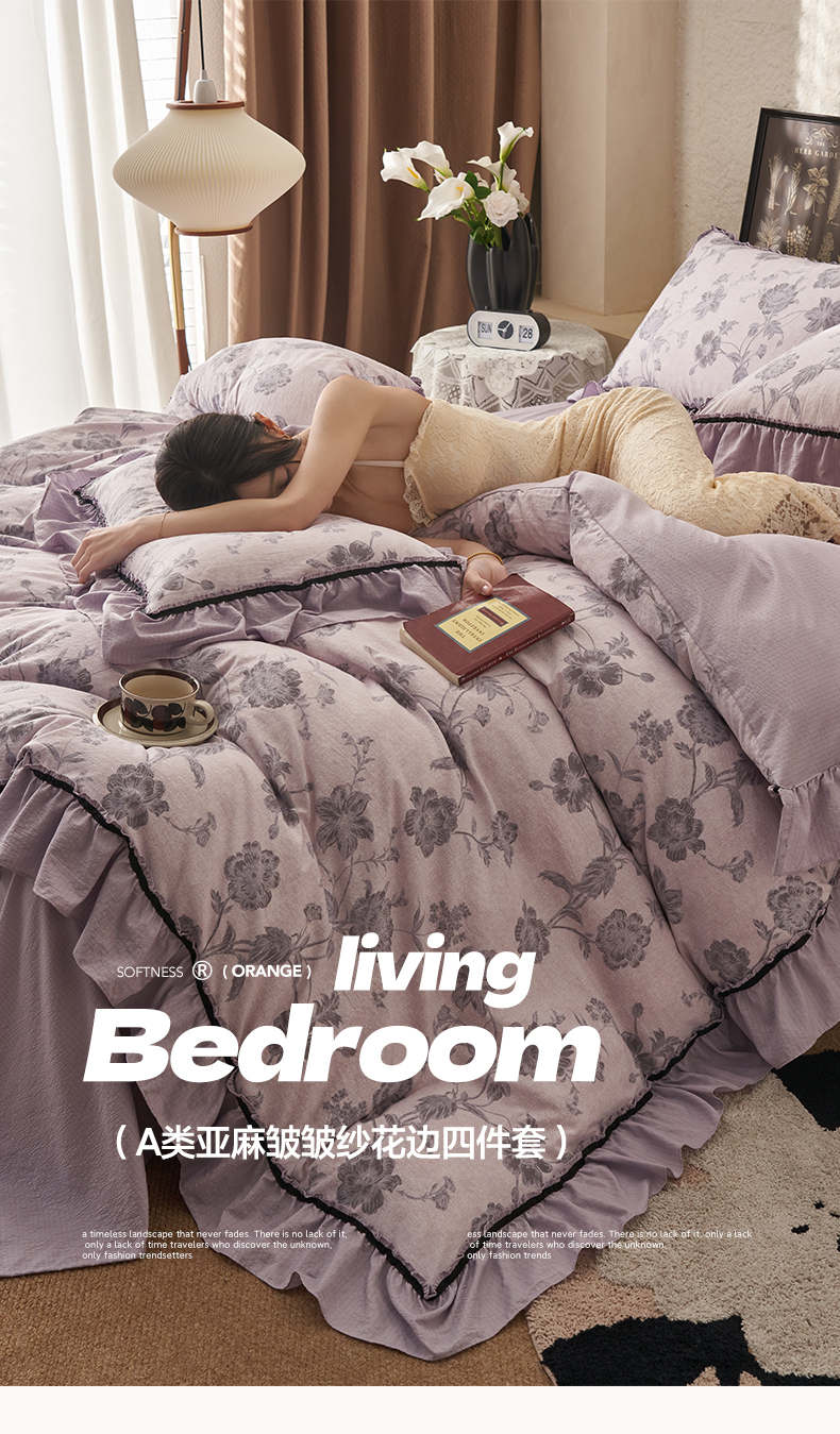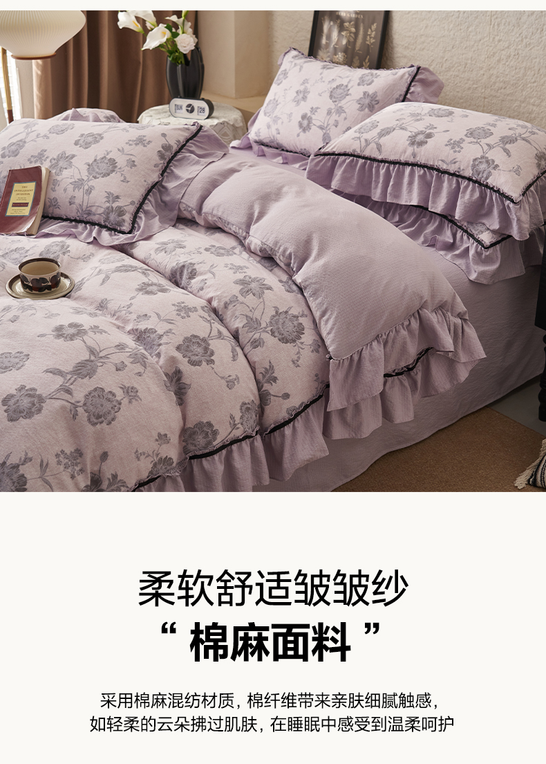 当前位置: 91家纺网 > 商品网购 > 床品套件 > 四件套 > 其它四件套 > 晨曦家纺 2026春夏新款复古博主风A类亚麻皱皱纱花边四件套 烟紫花语