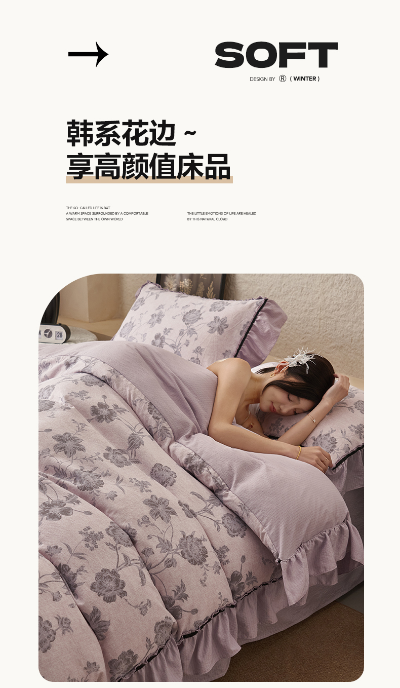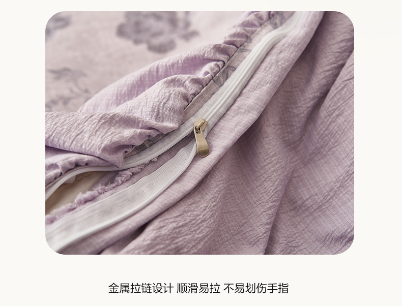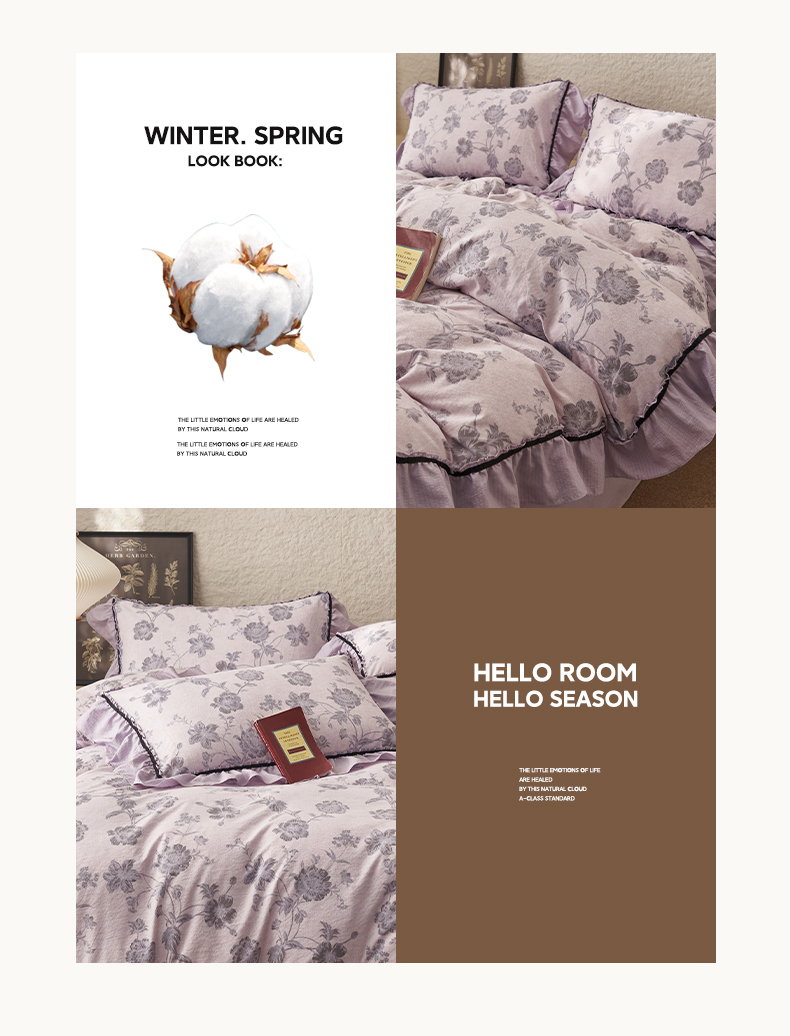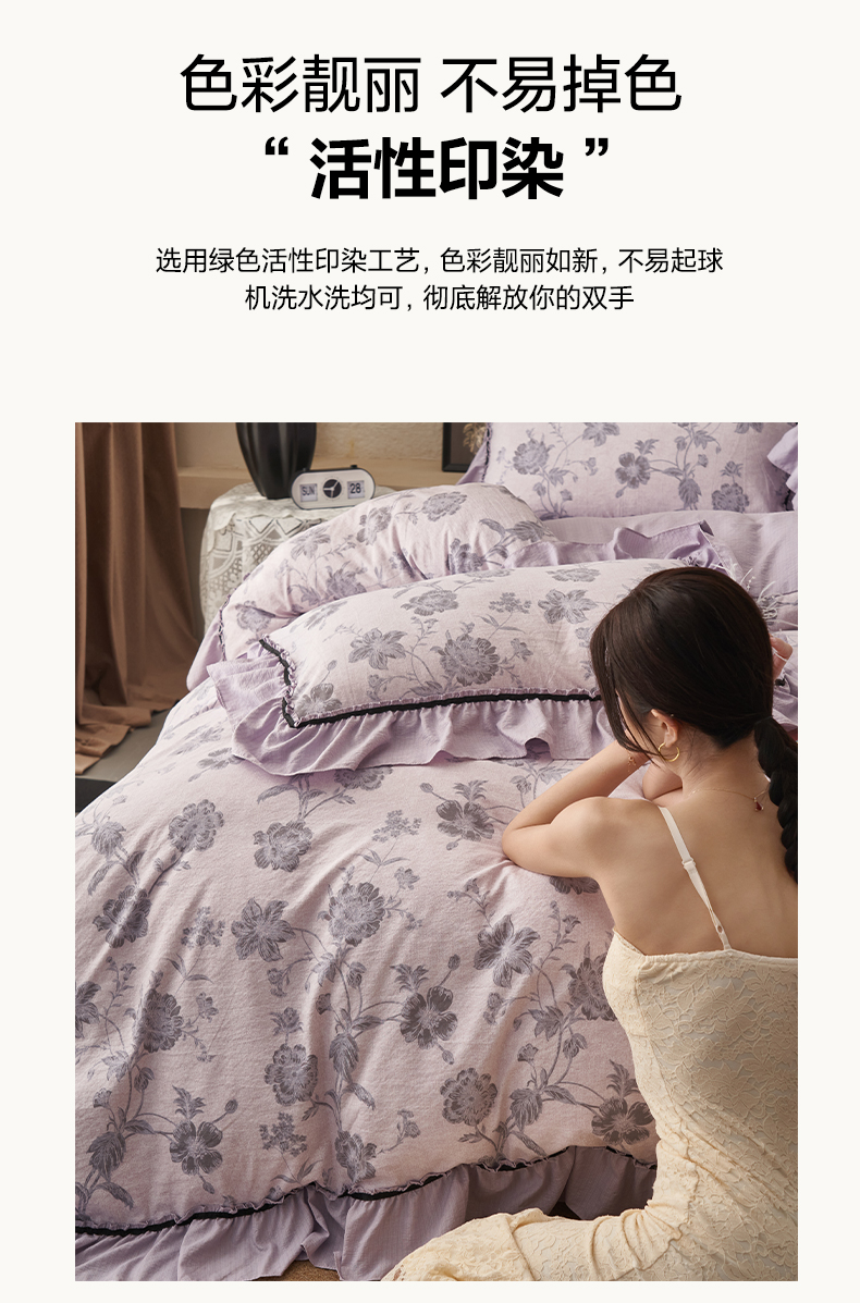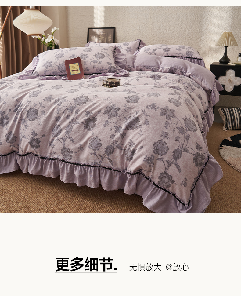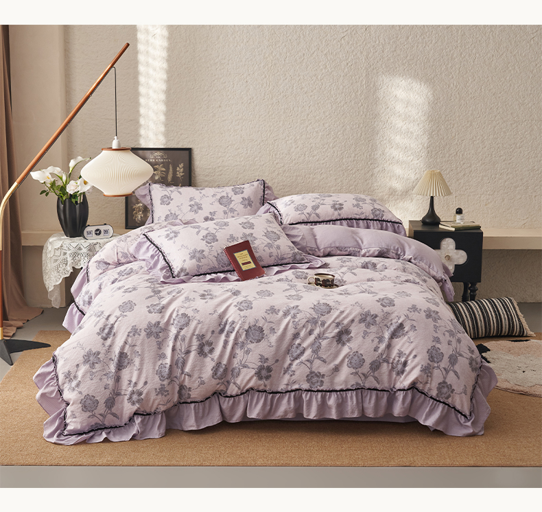 当前位置: 91家纺网 > 商品网购 > 床品套件 > 四件套 > 其它四件套 > 晨曦家纺 2026春夏新款复古博主风A类亚麻皱皱纱花边四件套 烟紫花语
