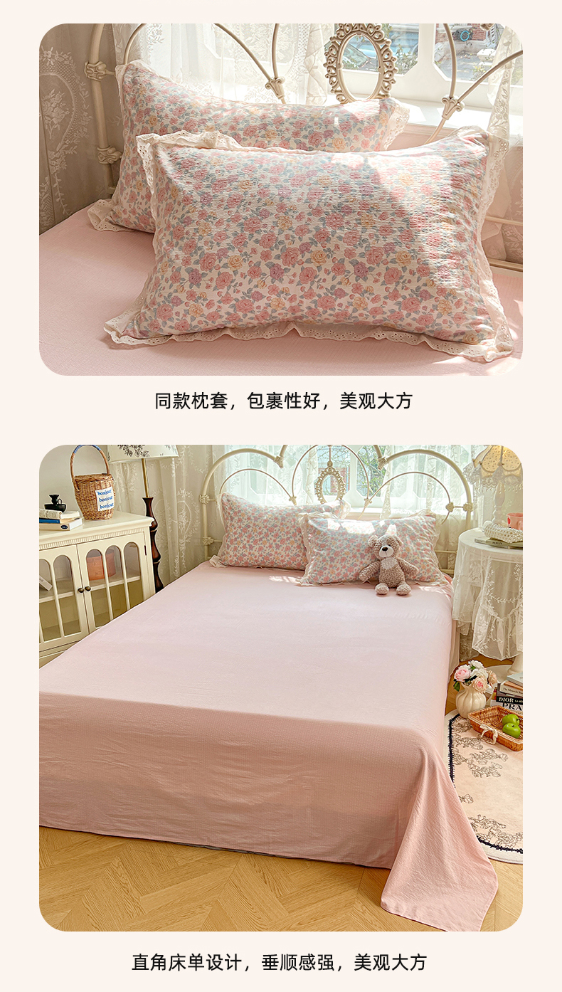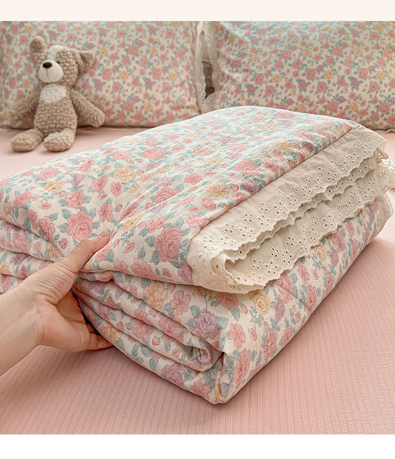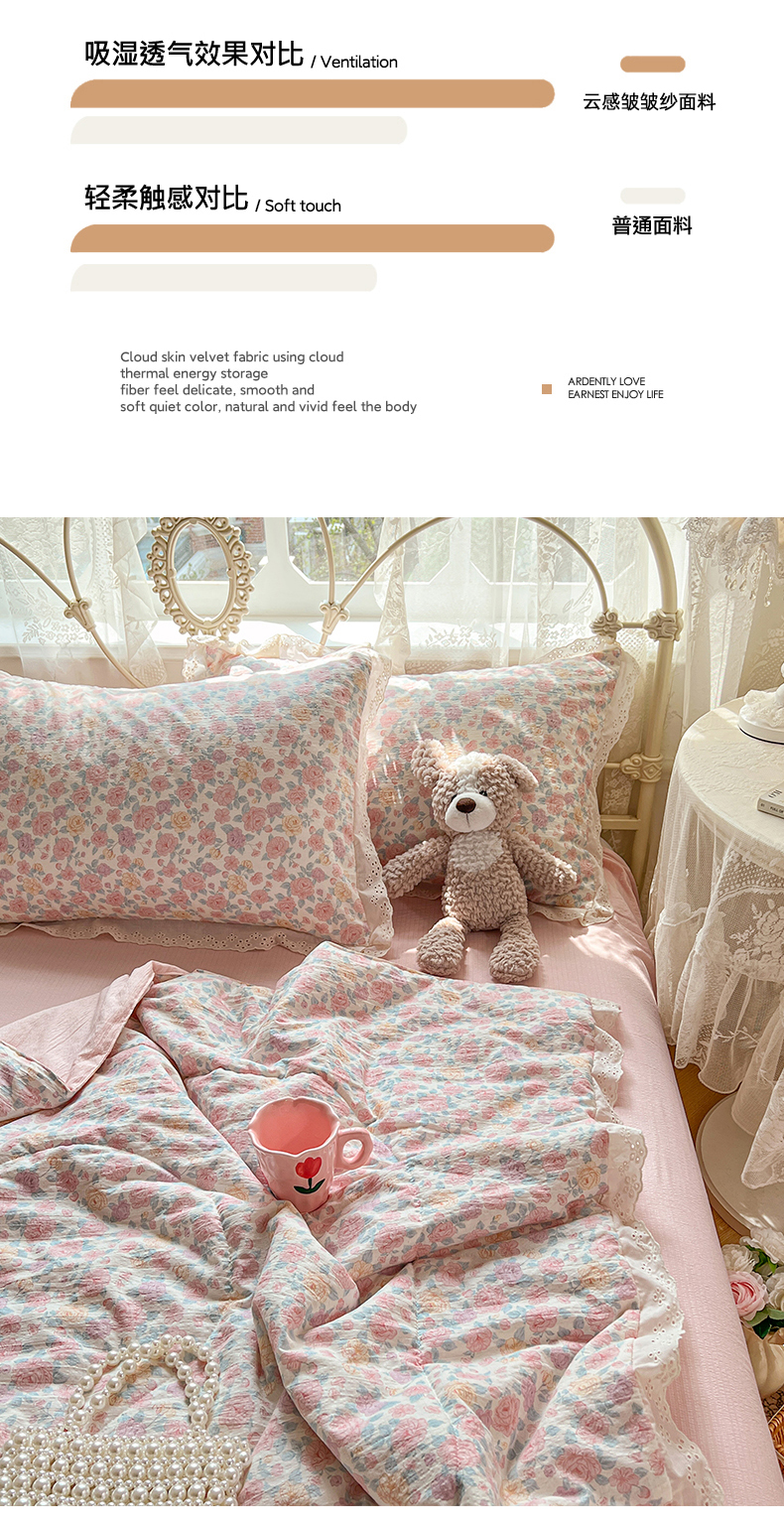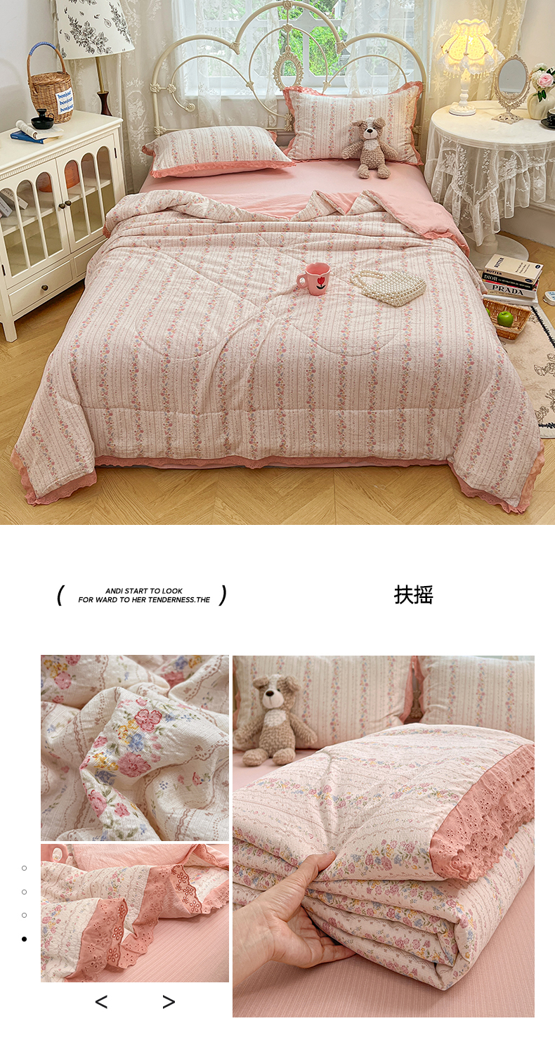 商品名称:优尚佳生活馆 2026新款云感皱皱纱全棉花边款夏被四件套 粉糯