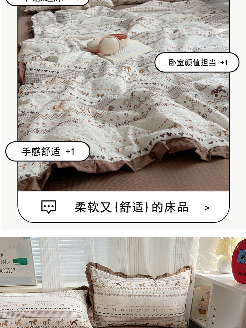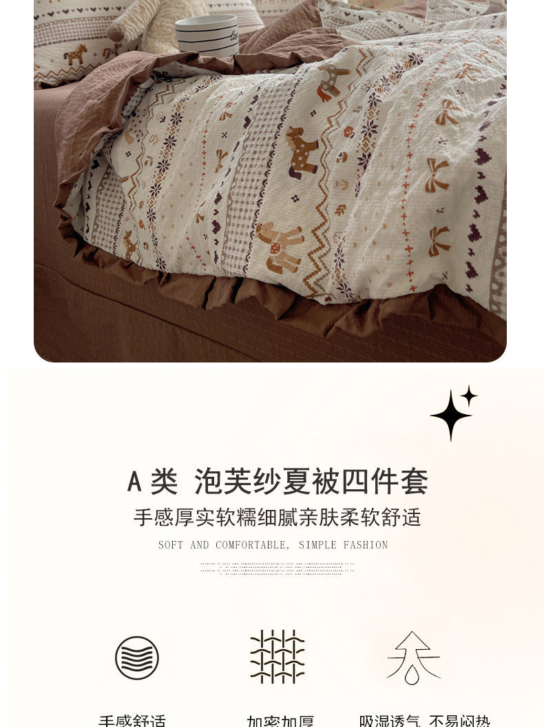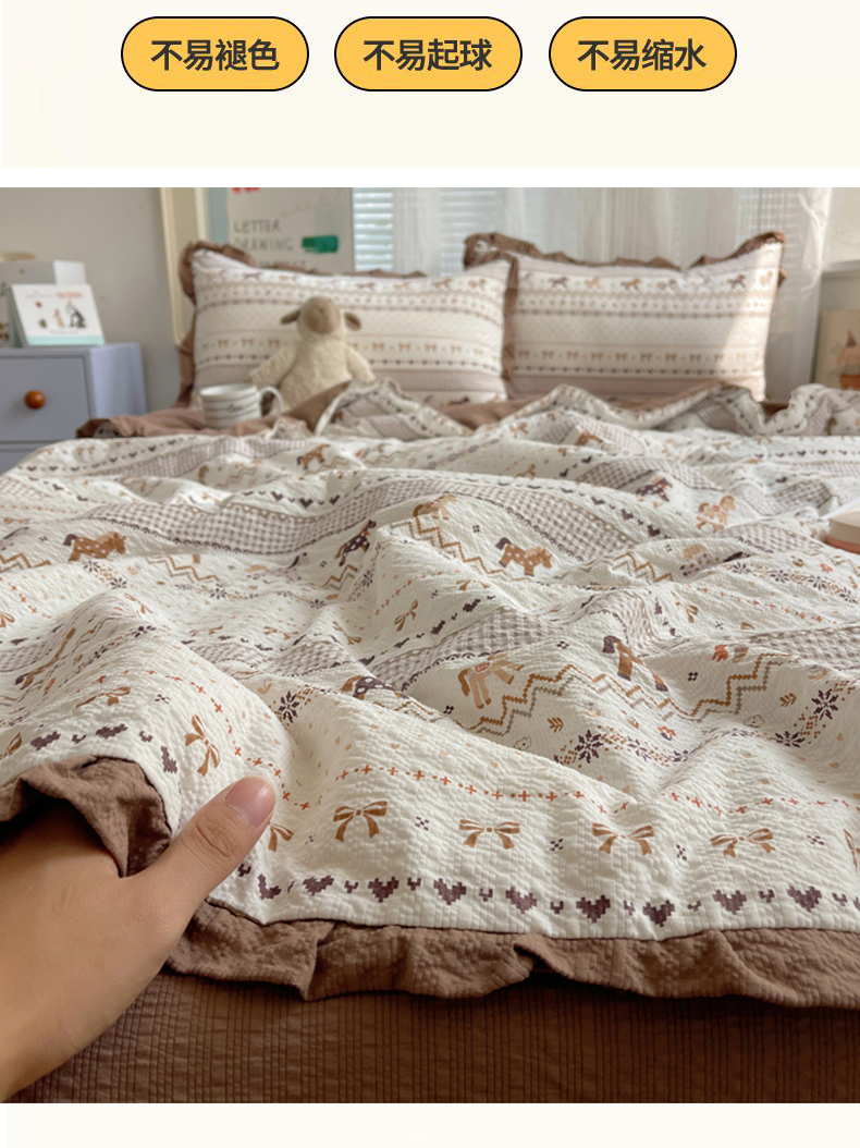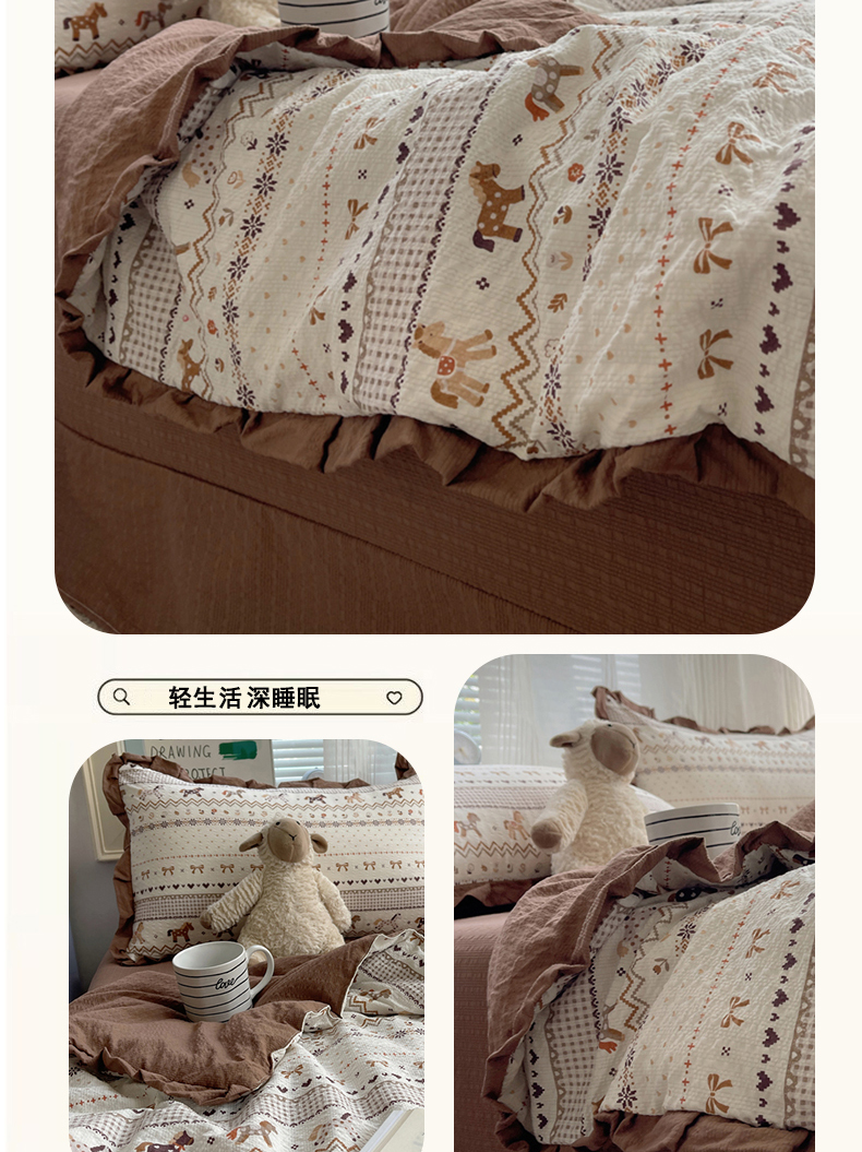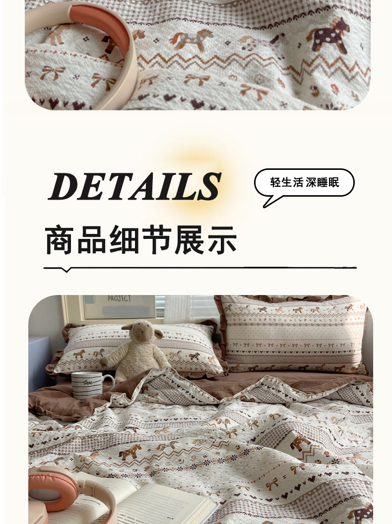 商品名称:迪梦姿家纺 2026新款泡芙纱花边款夏被四件套 栗色木马纹