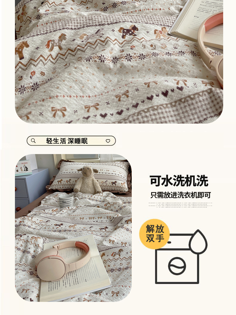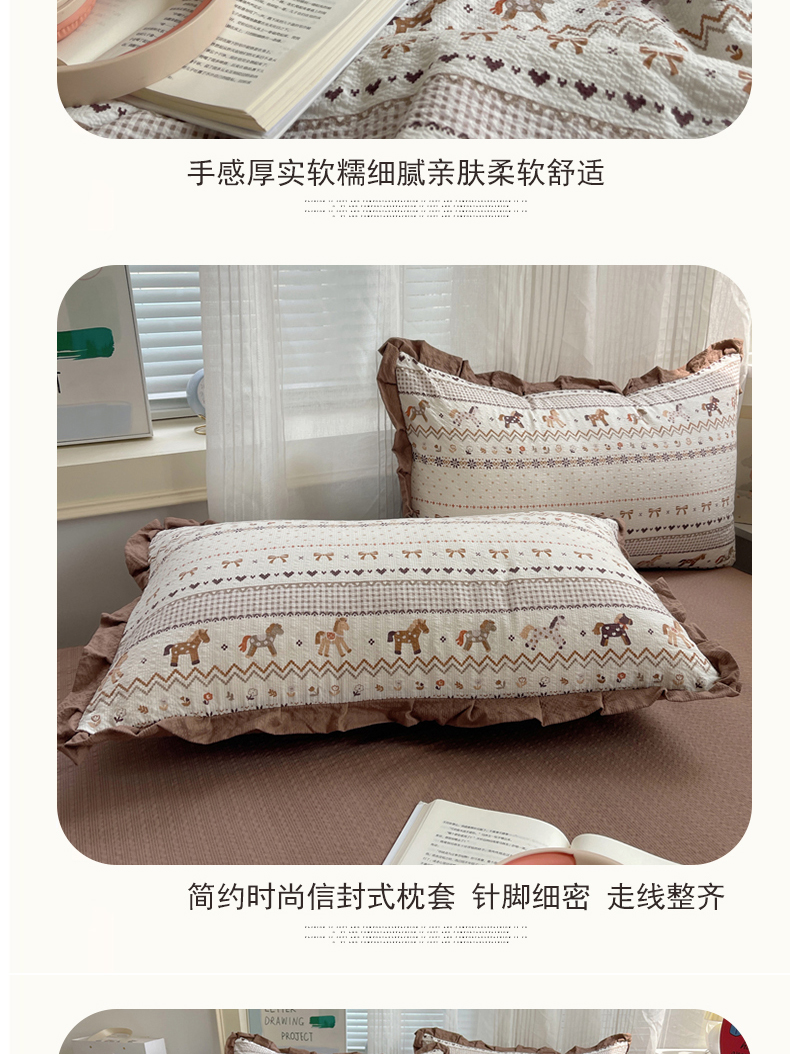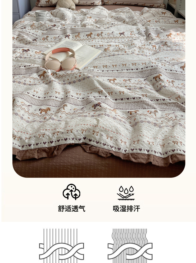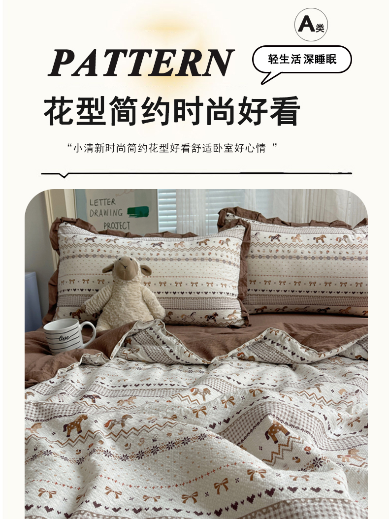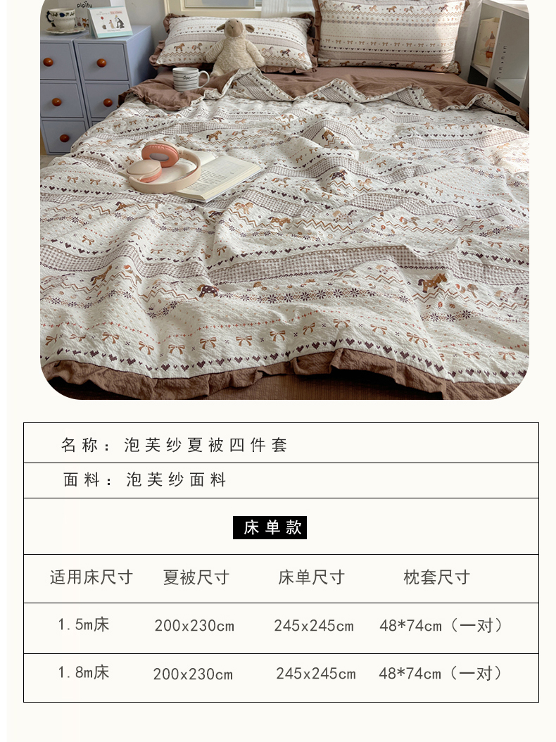 商品名称:迪梦姿家纺 2026新款泡芙纱花边款夏被四件套 栗色木马纹