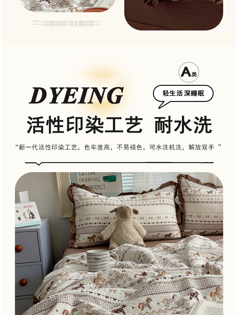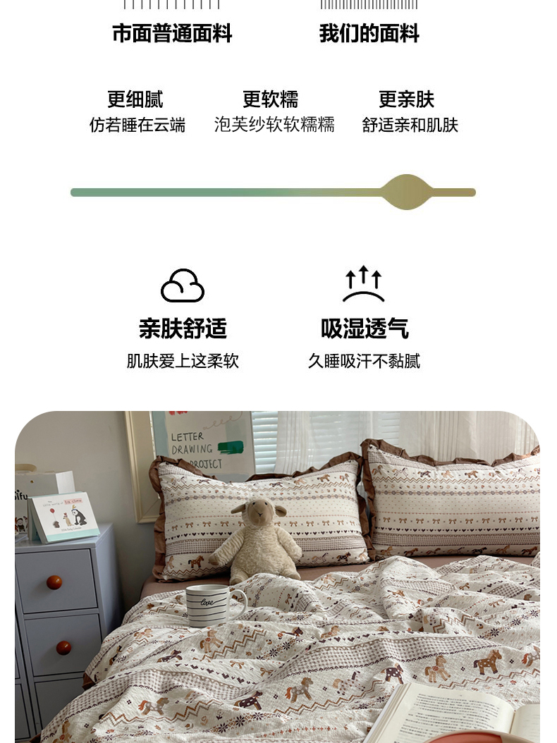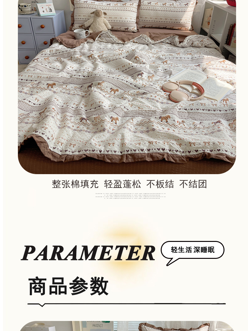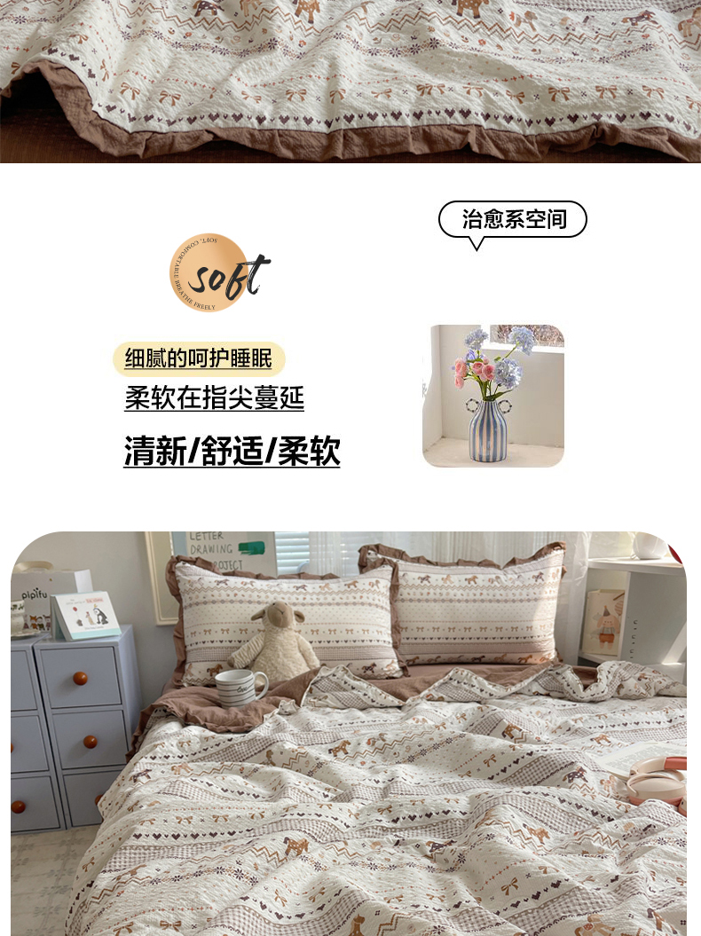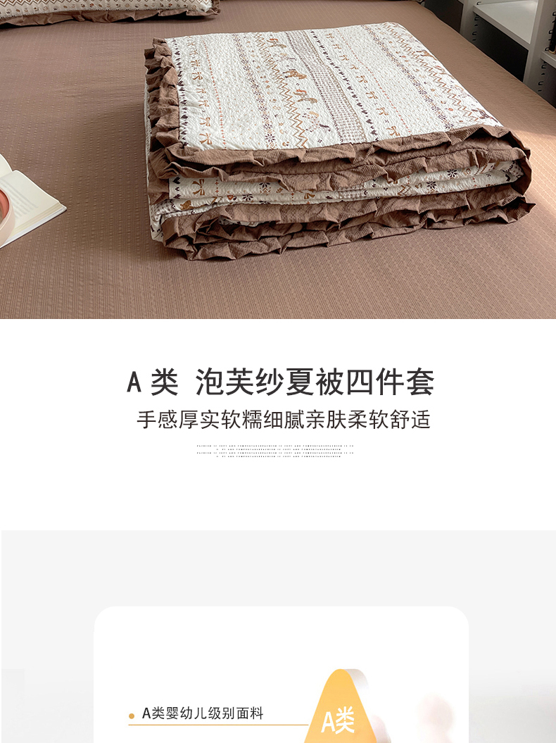 商品名称:迪梦姿家纺 2026新款泡芙纱花边款夏被四件套 栗色木马纹