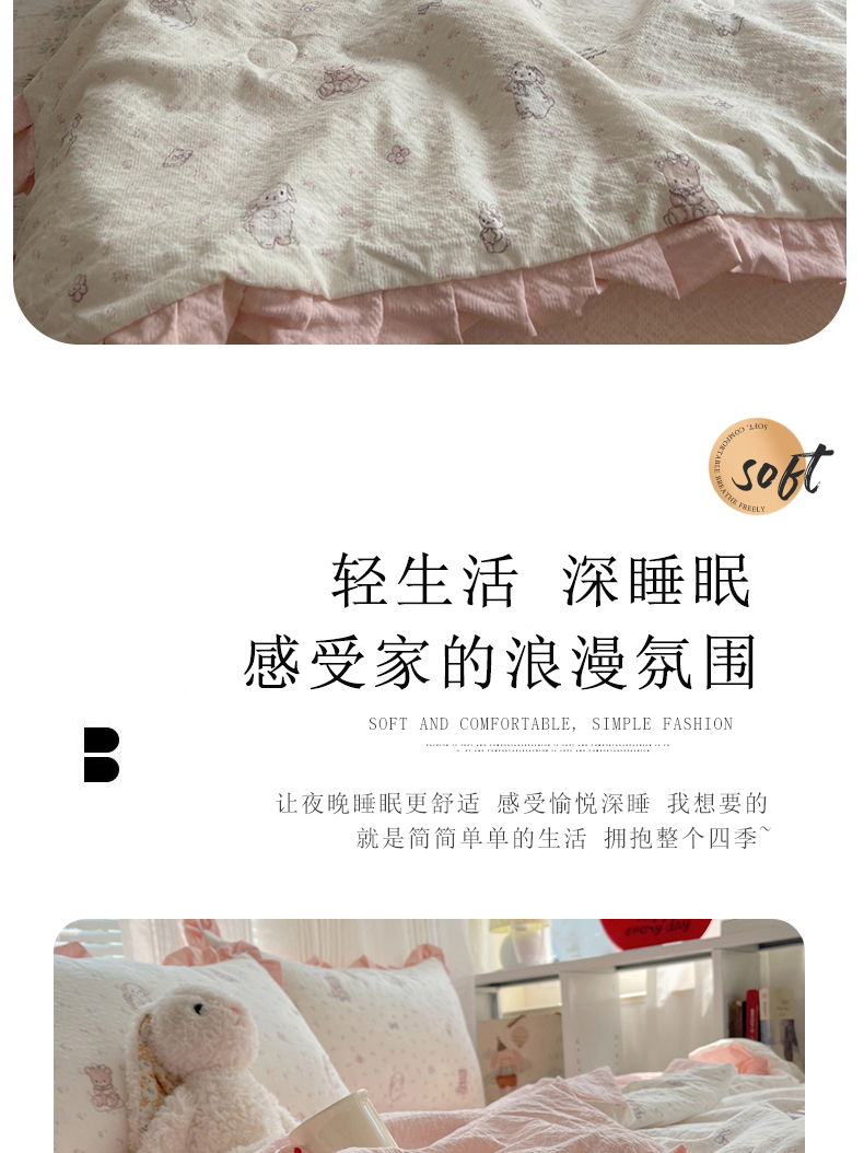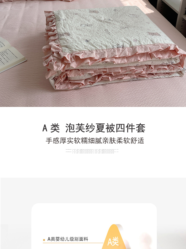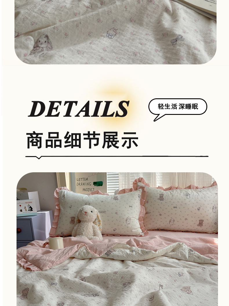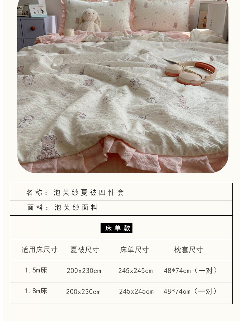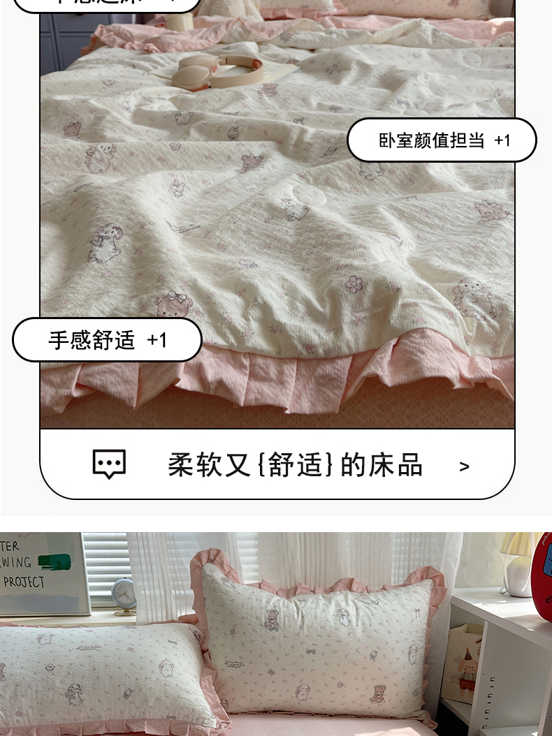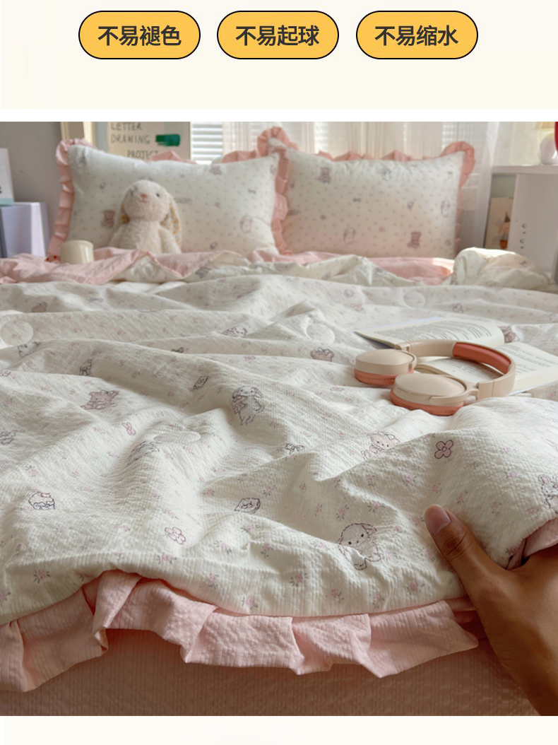 商品名称:迪梦姿家纺 2026新款泡芙纱花边款夏被四件套 悦悦小兔