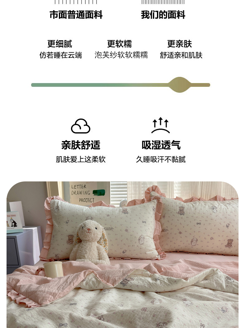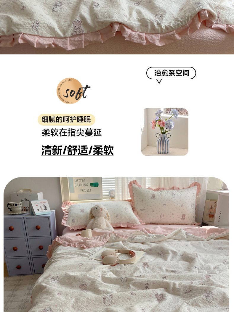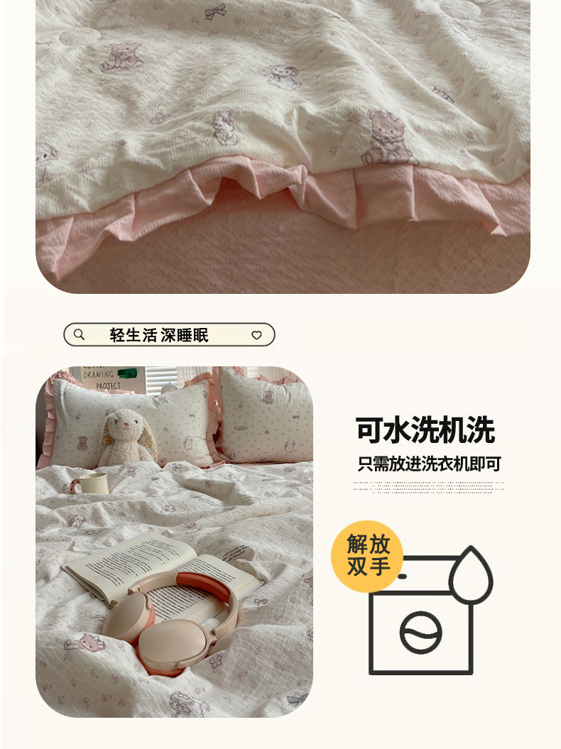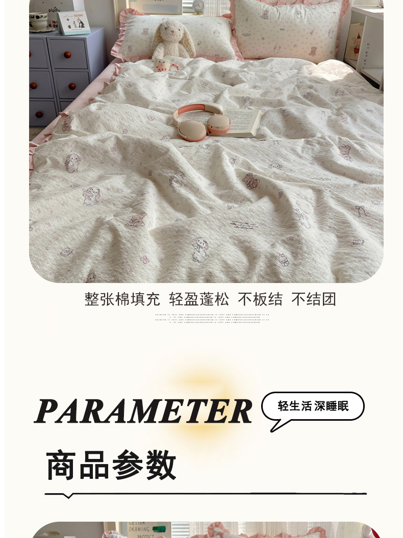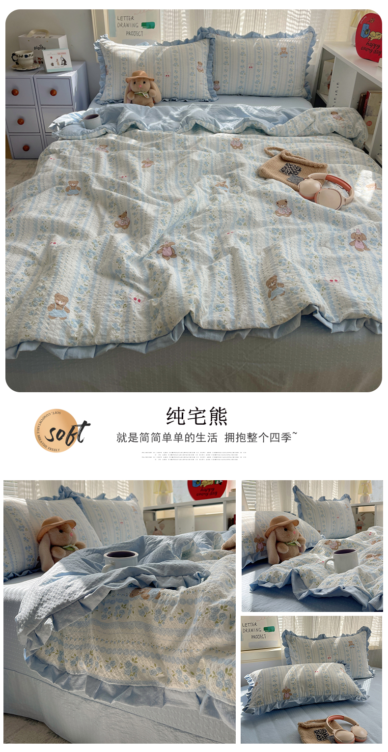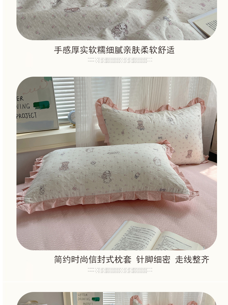 商品名称:迪梦姿家纺 2026新款泡芙纱花边款夏被四件套 悦悦小兔