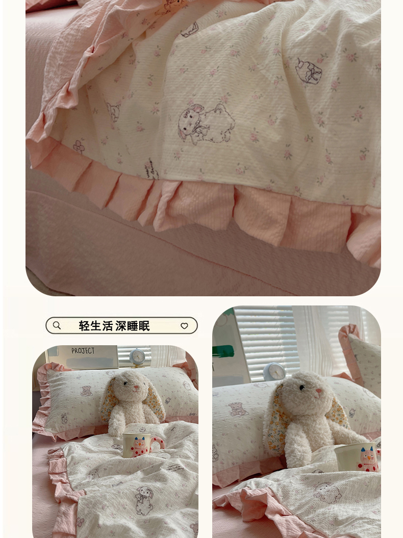 迪梦姿家纺 2026新款泡芙纱花边款夏被四件套 悦悦小兔