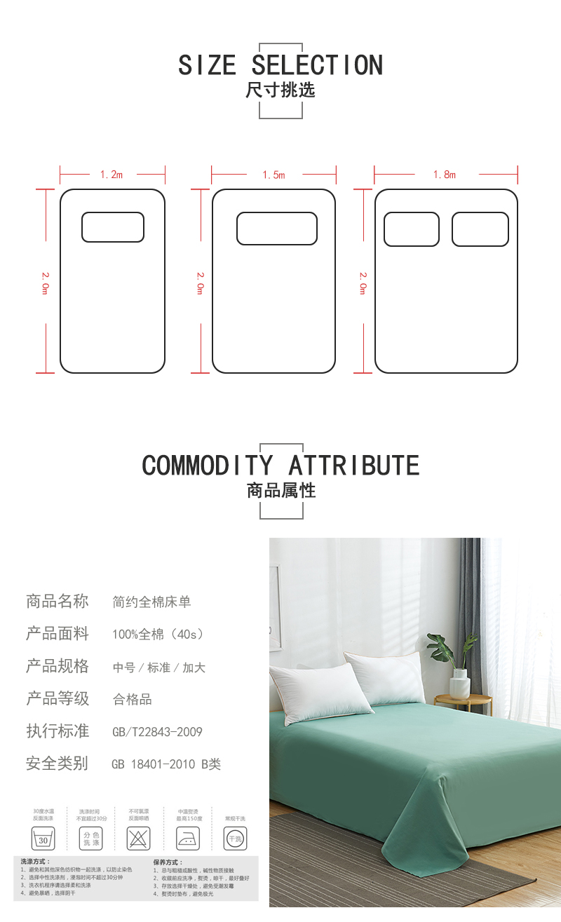 商品名称:欣喜来 2019新款40s简约全棉纯色单品床单 玛瑙绿