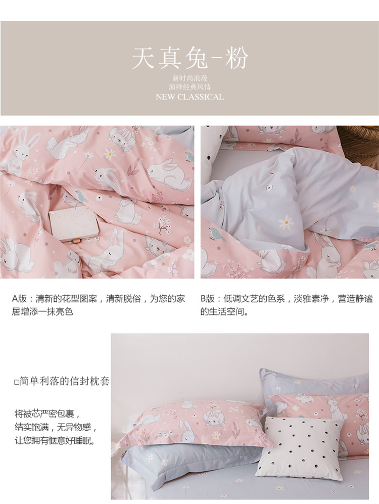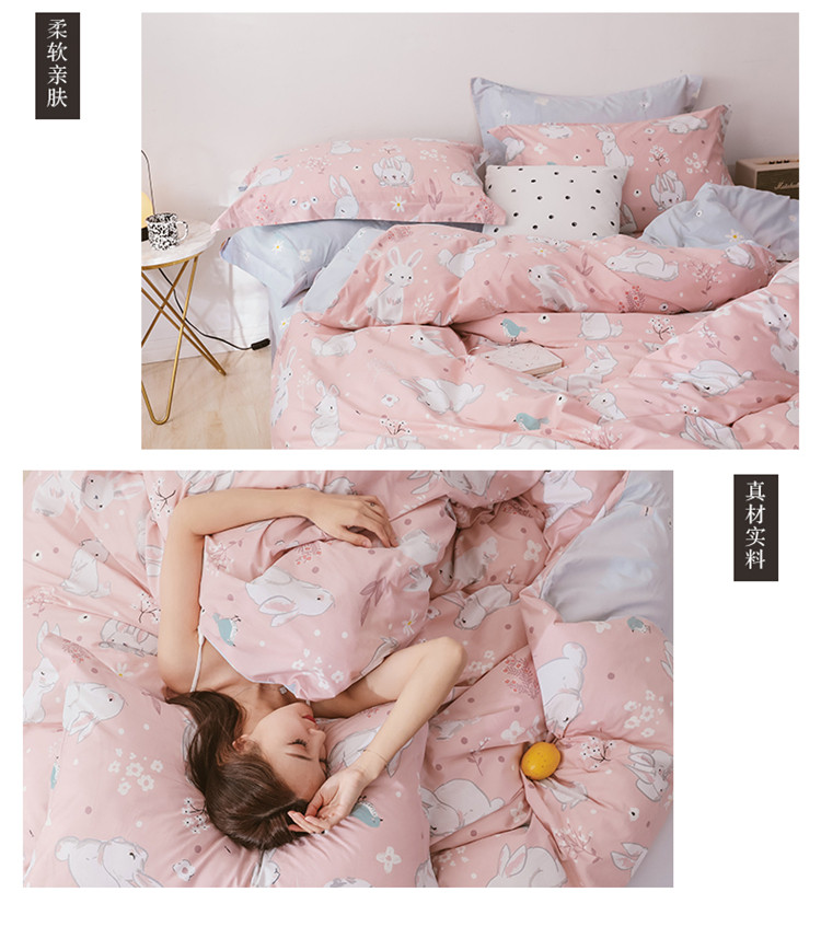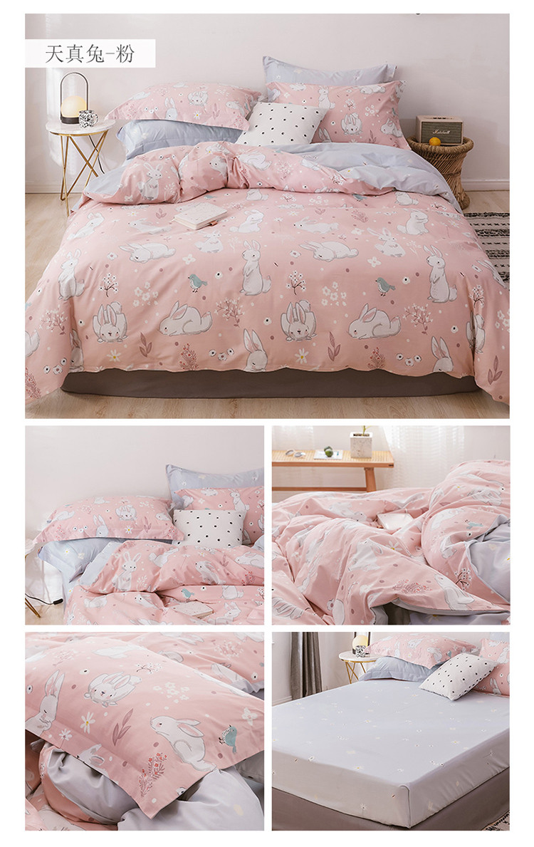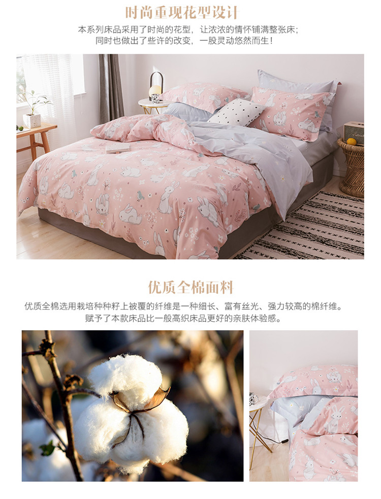 窝米 2019全棉13372卡通花卉系列四件套床单款天真兔粉