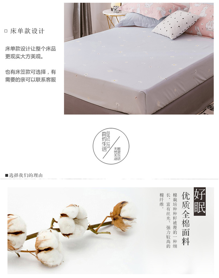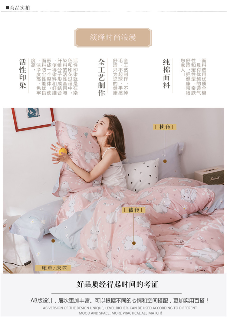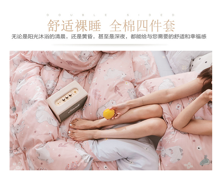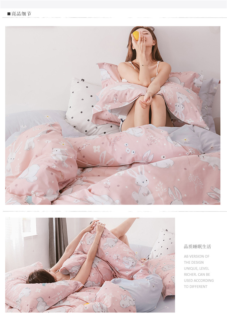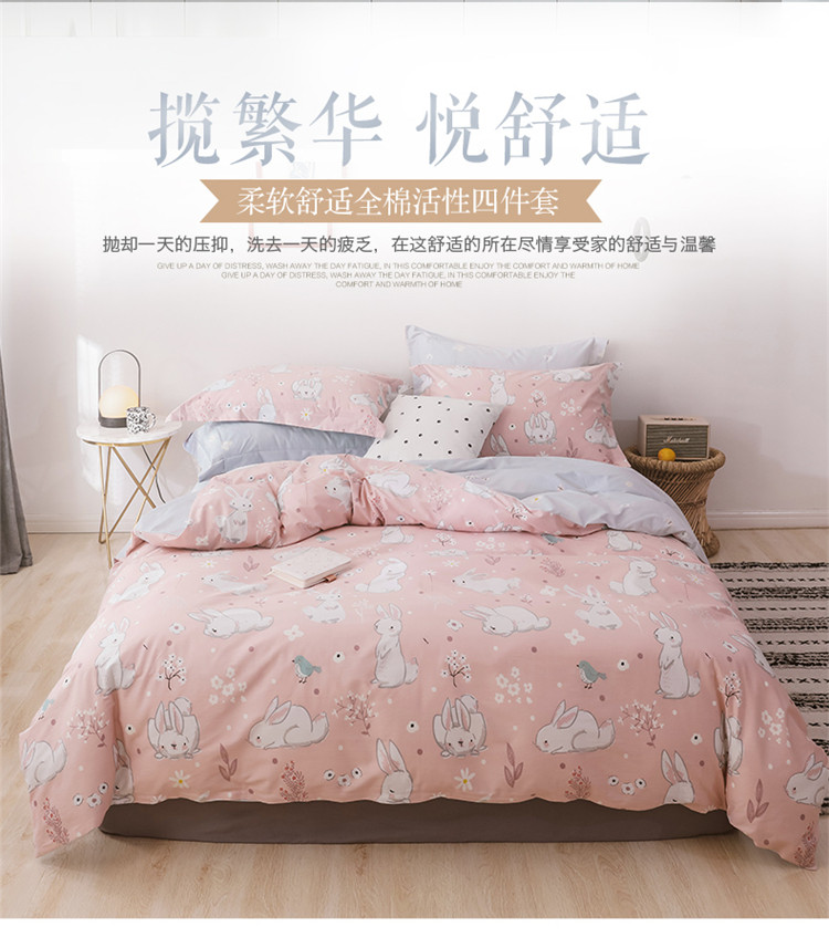 窝米 2019全棉13372卡通花卉系列四件套床单款天真兔粉