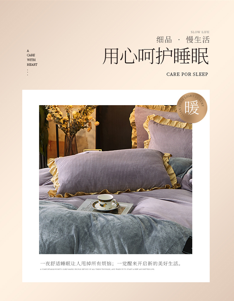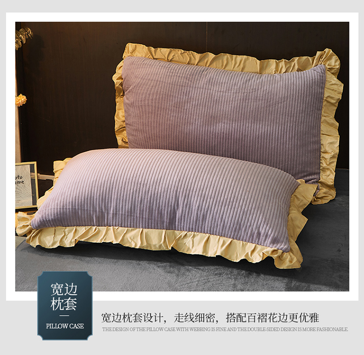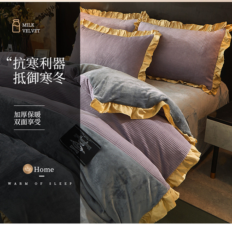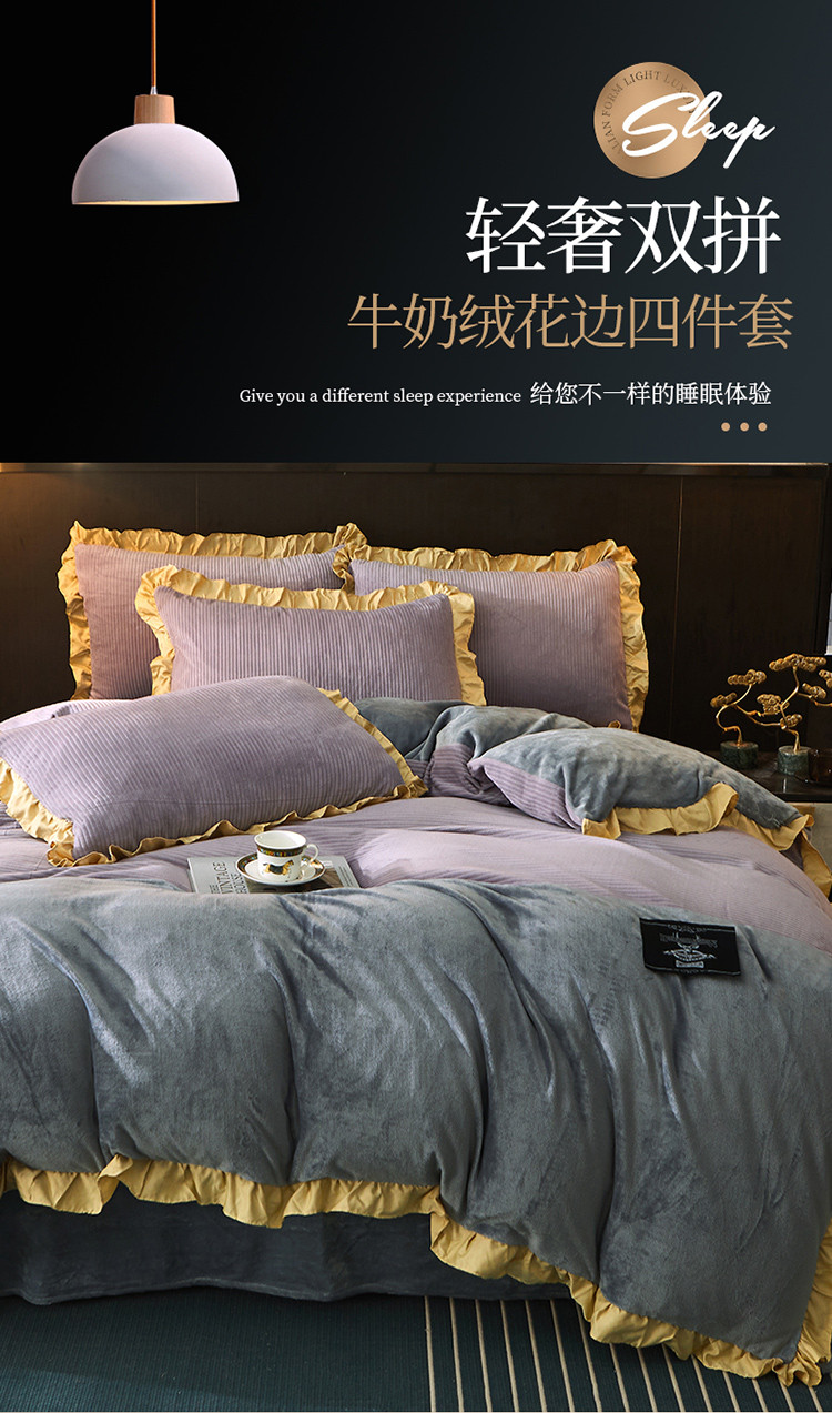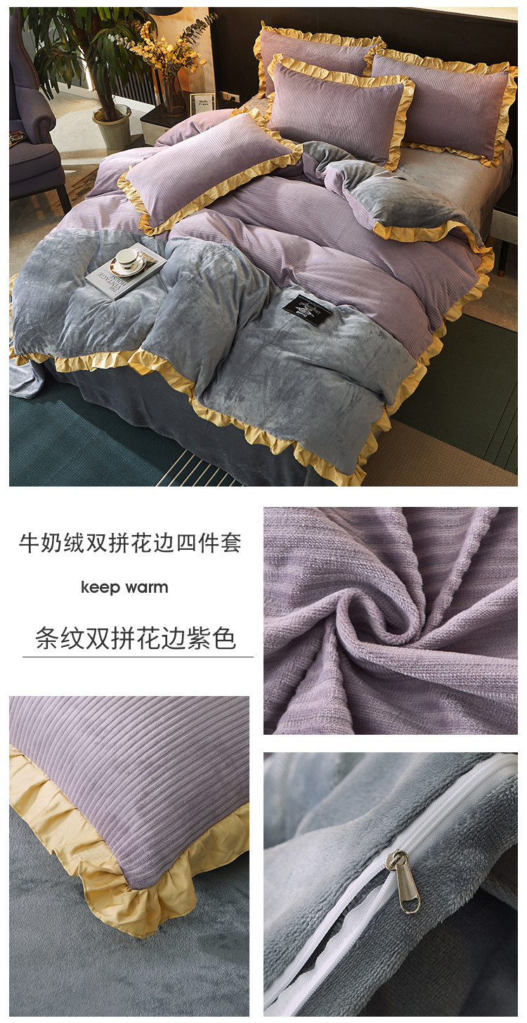 芃成家纺 2021新款牛奶绒双拼花边四件套 条纹双拼花边紫色