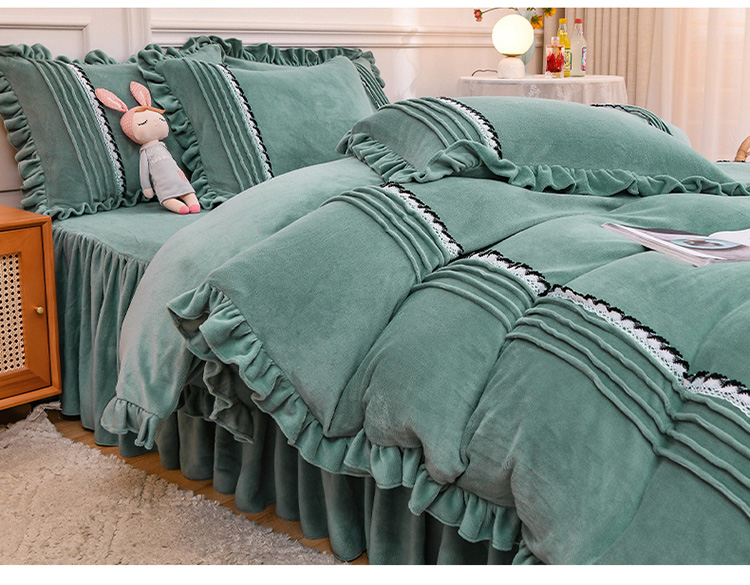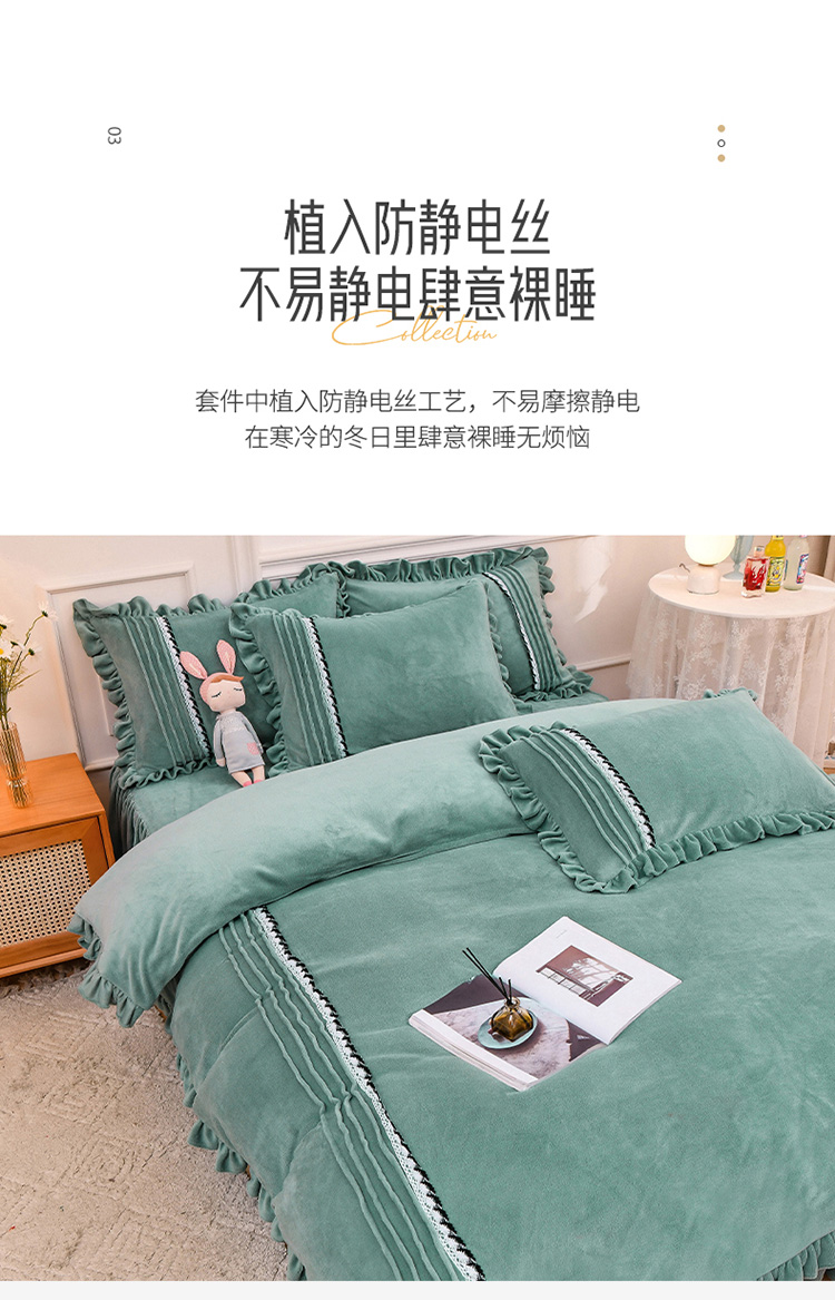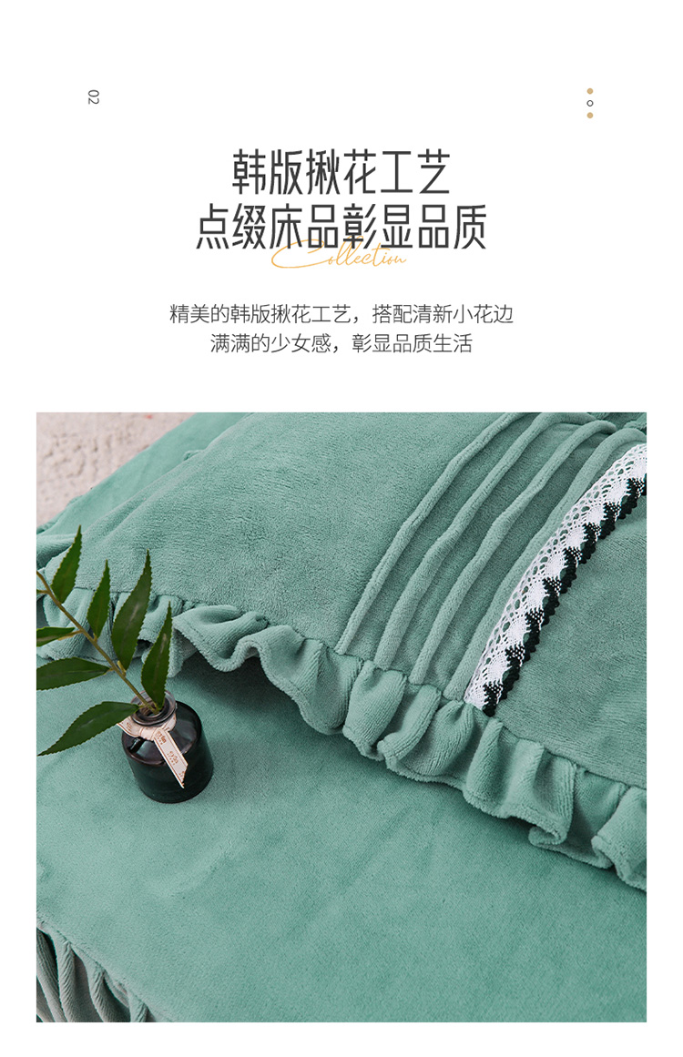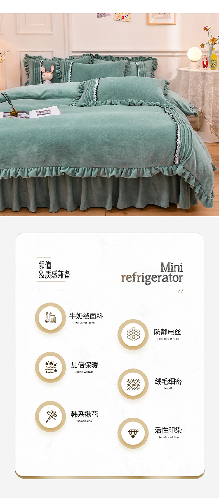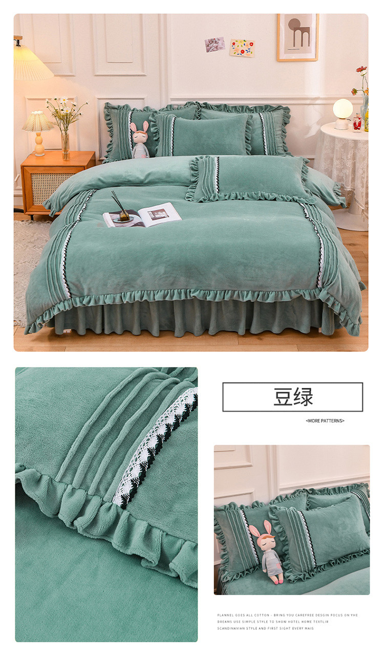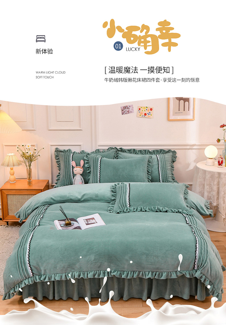 当前位置: 91家纺网 > 商品网购 > 床品套件 > 四件套 > 牛奶绒四件套 > 绒兔兔 2021牛奶绒韩版揪花床裙四件套 豆绿