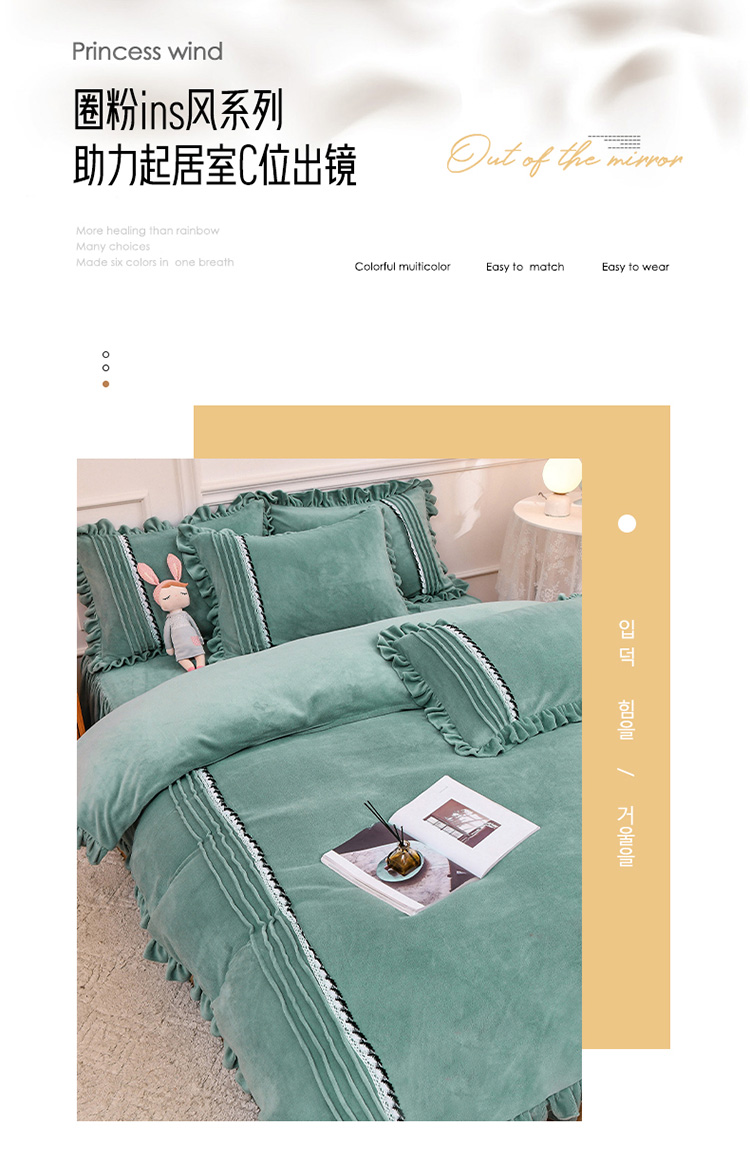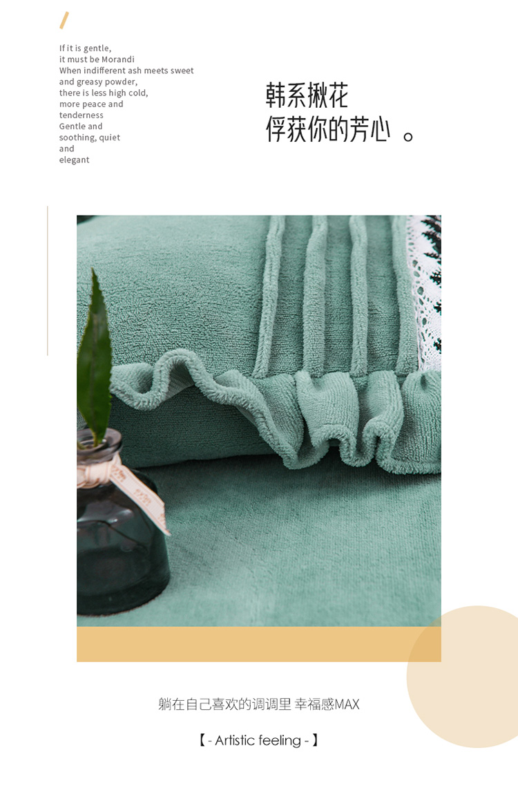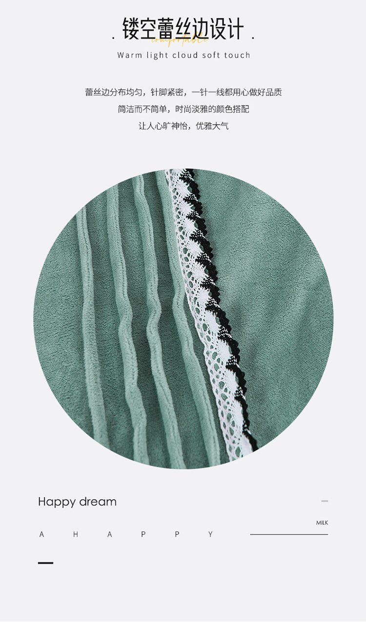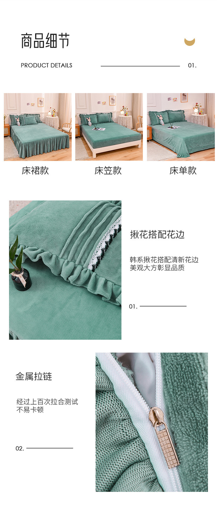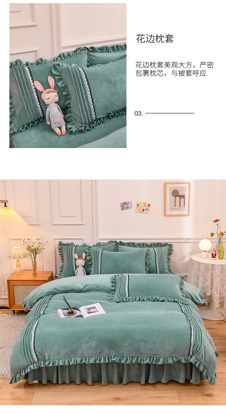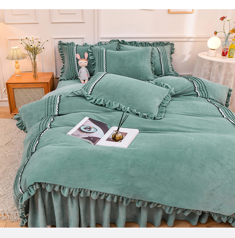 当前位置: 91家纺网 > 商品网购 > 床品套件 > 四件套 > 牛奶绒四件套 > 绒兔兔 2021牛奶绒韩版揪花床裙四件套 豆绿