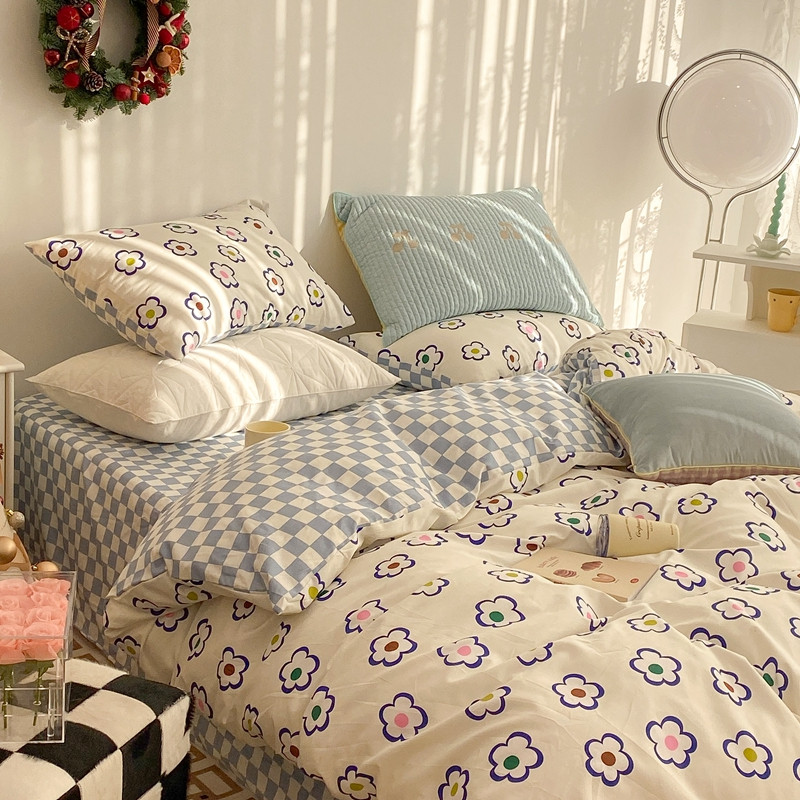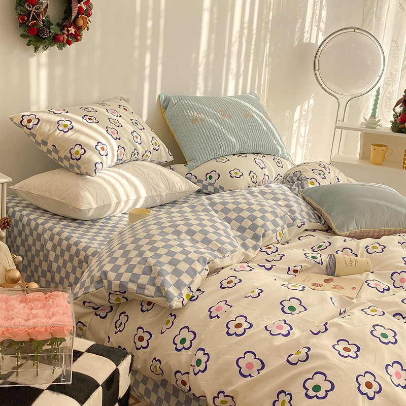 商品名称:昔可家纺 2022新款13372普通款四件套 棋盘克莱因蓝花