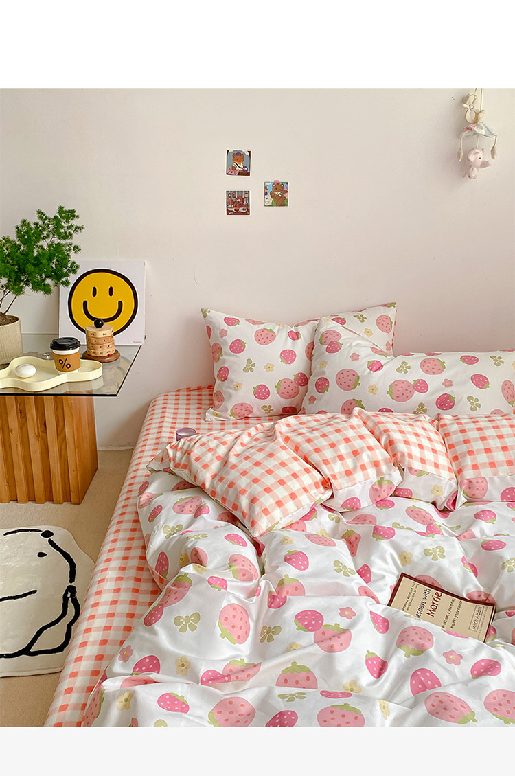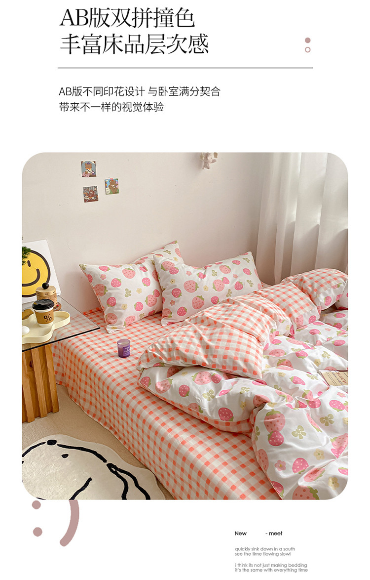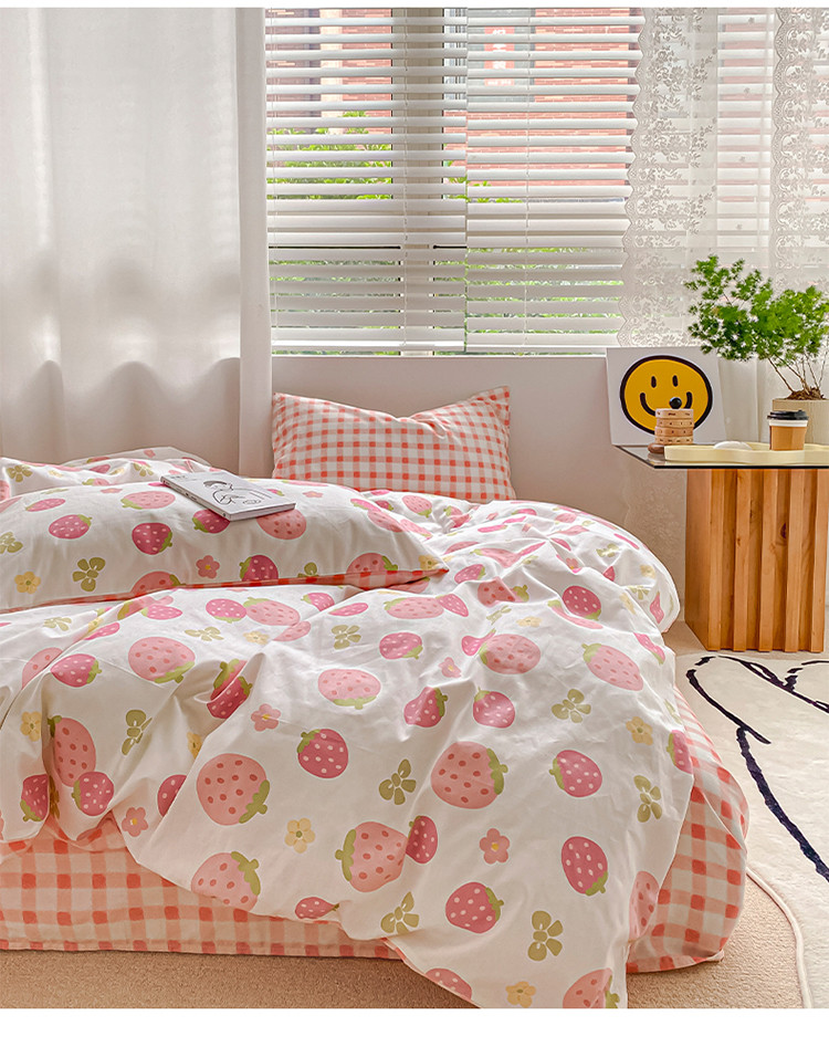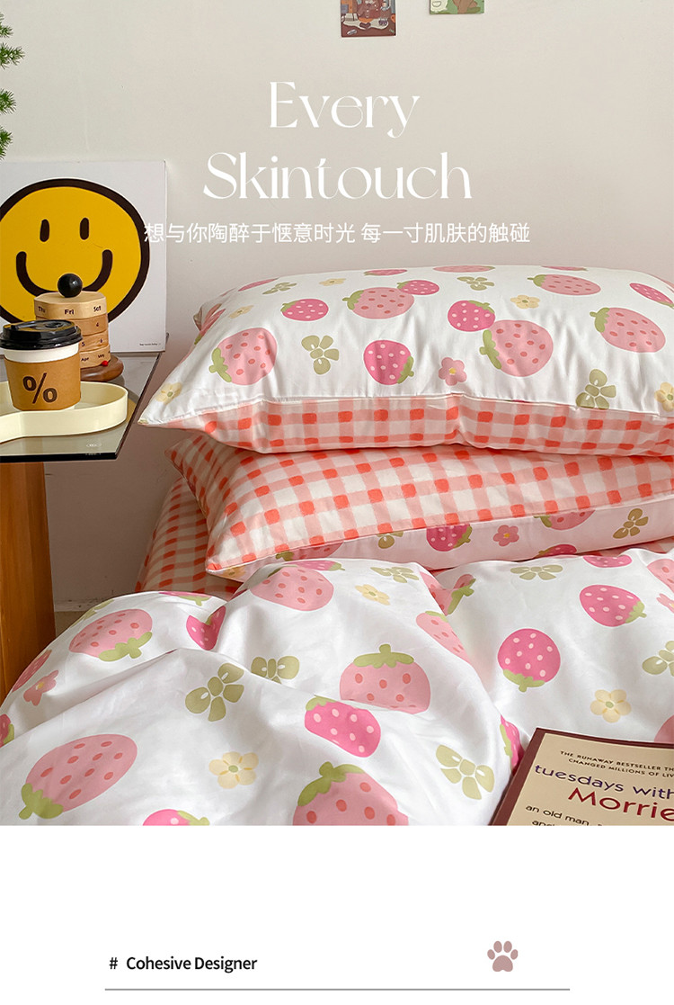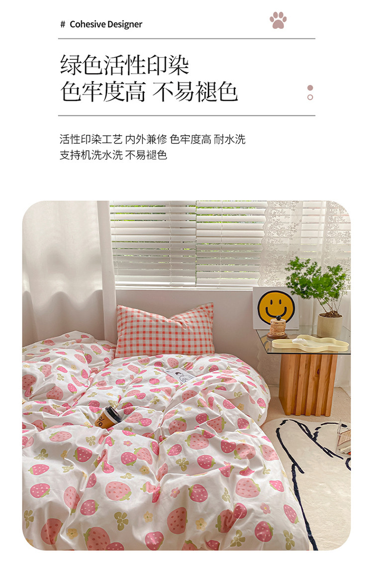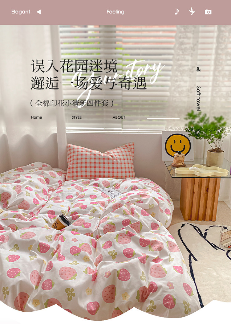 雅居纺 2022新款全棉13070印花小清新四件套 粉粉的小草莓