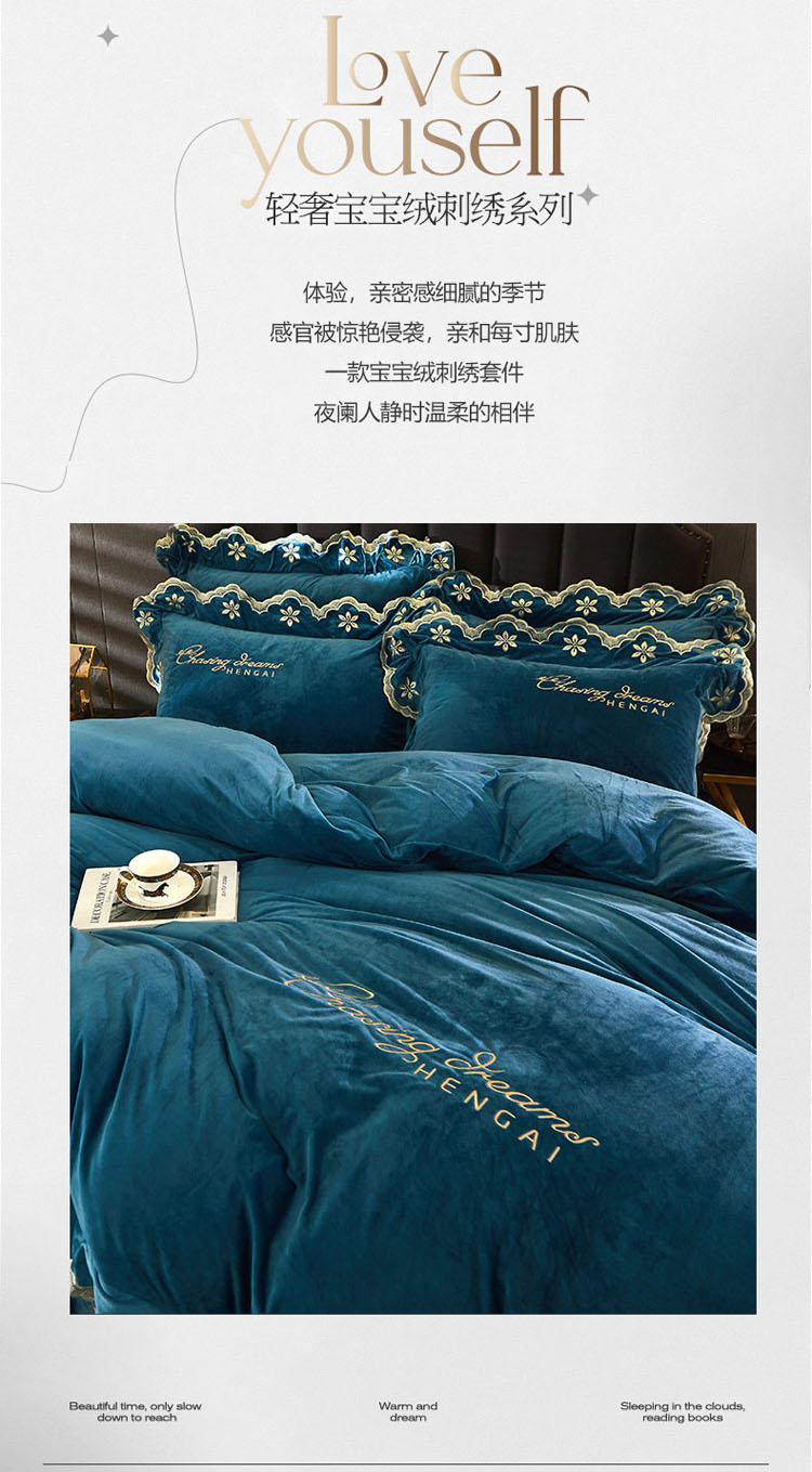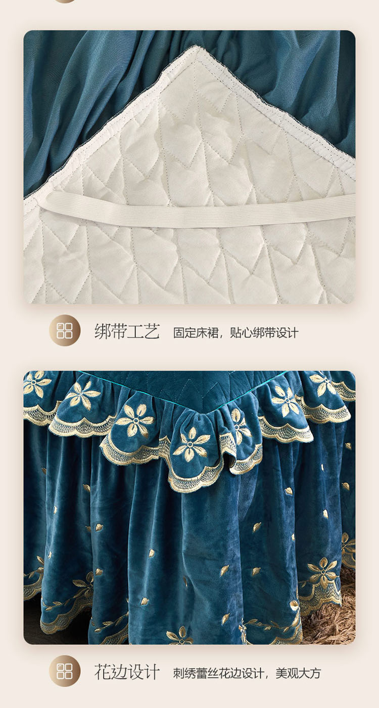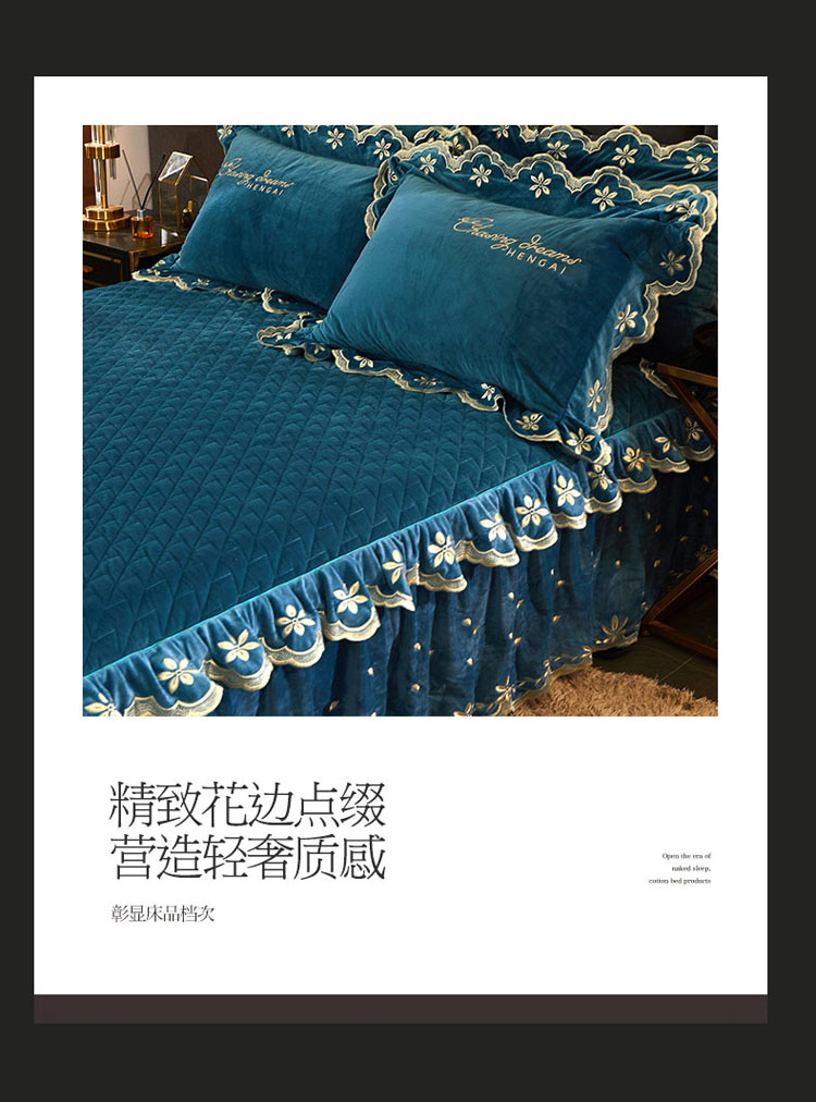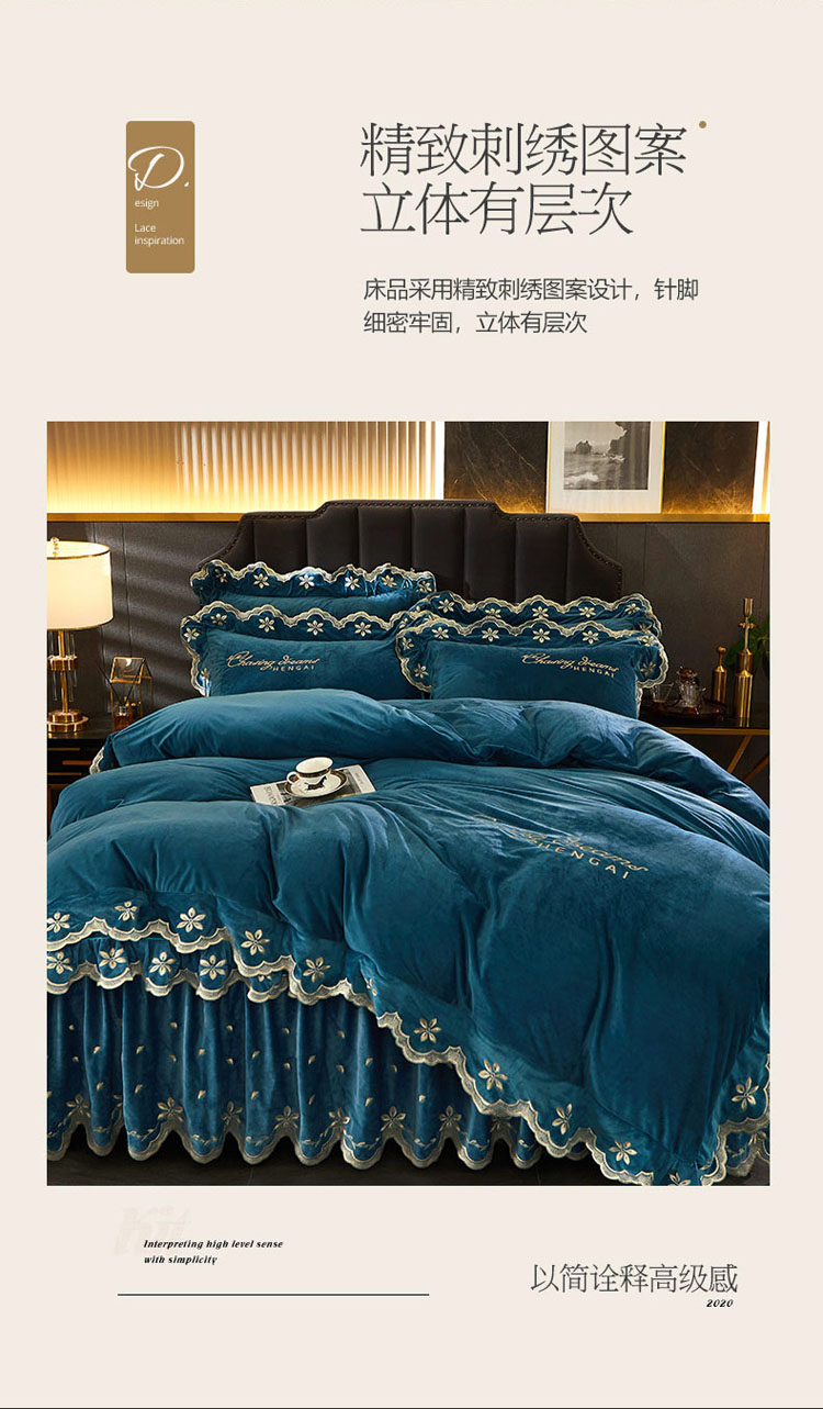 当前位置: 91家纺网 > 商品网购 > 床品套件 > 四件套 > 宝宝绒四件套 > 恒爱 2022新款秋冬轻奢宝宝绒刺绣床裙款四件套 宾利蓝