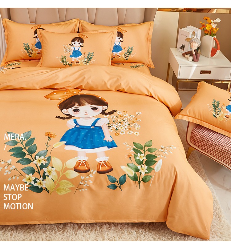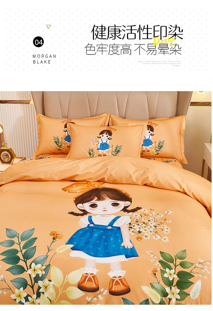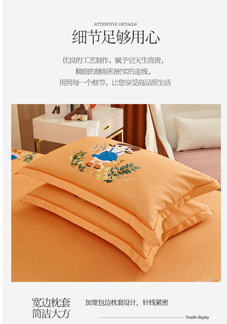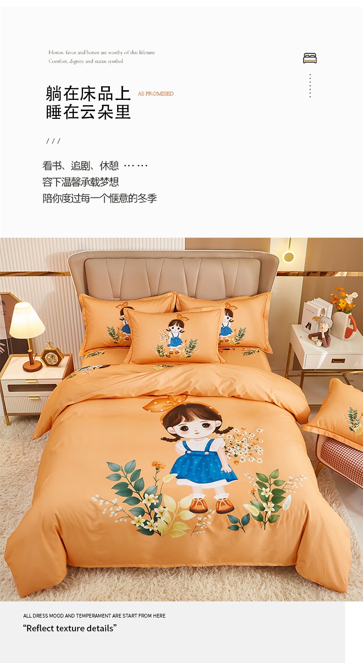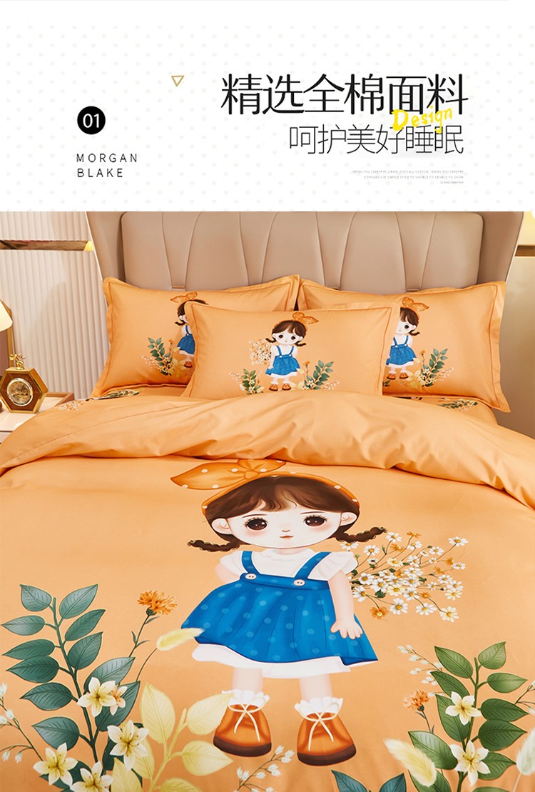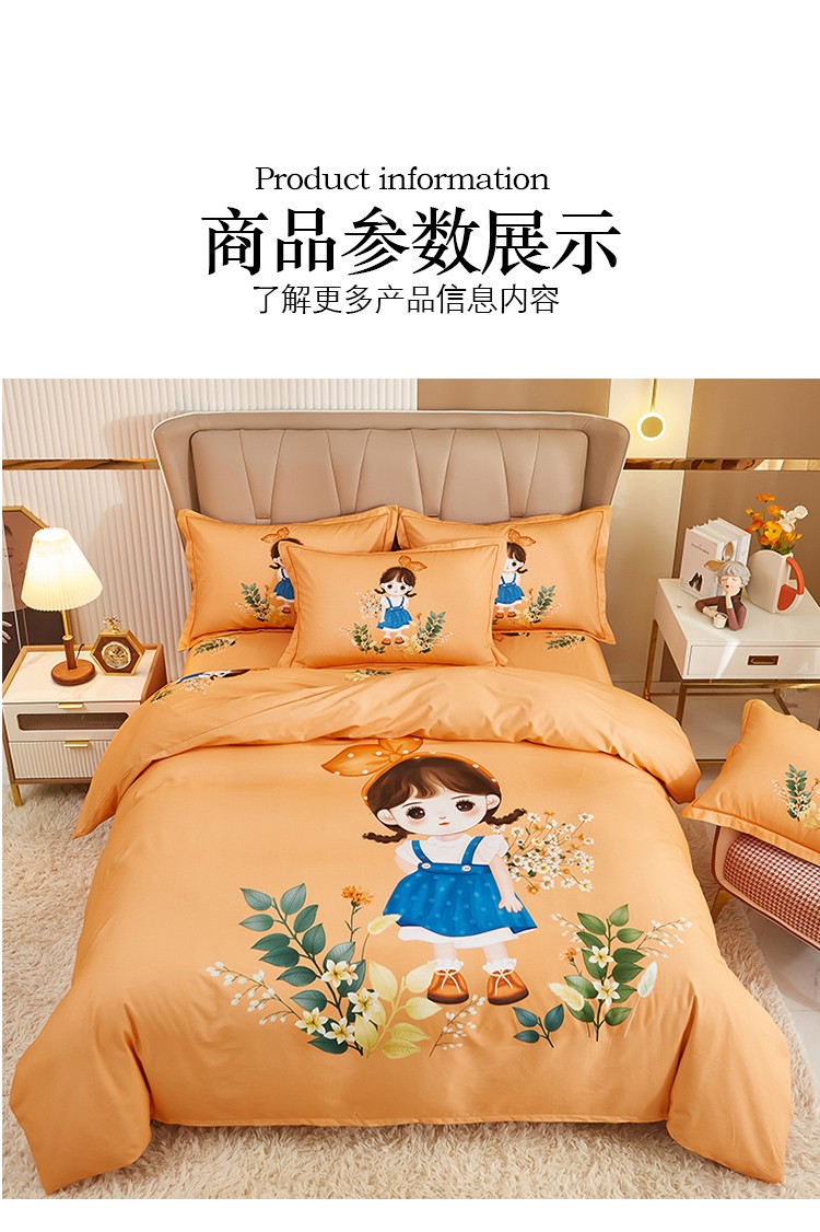 商品名称:雲归梦 2022年新款加厚全棉大版四件套第二批-格条卡通 甜丫丫-桔