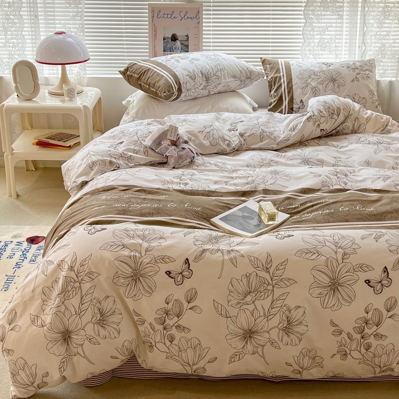 昔可家纺 2022新款法式田园花卉系列全棉四件套 蝴蝶花咖