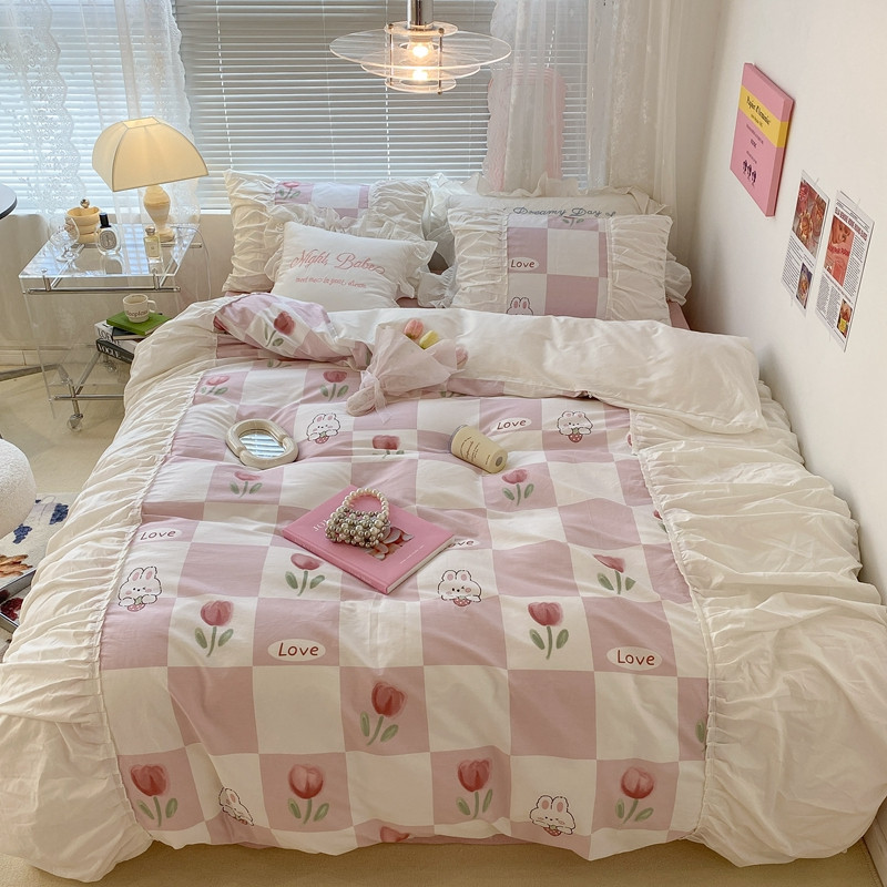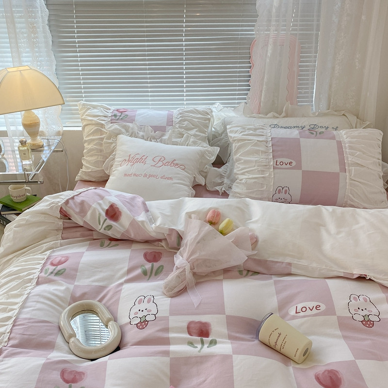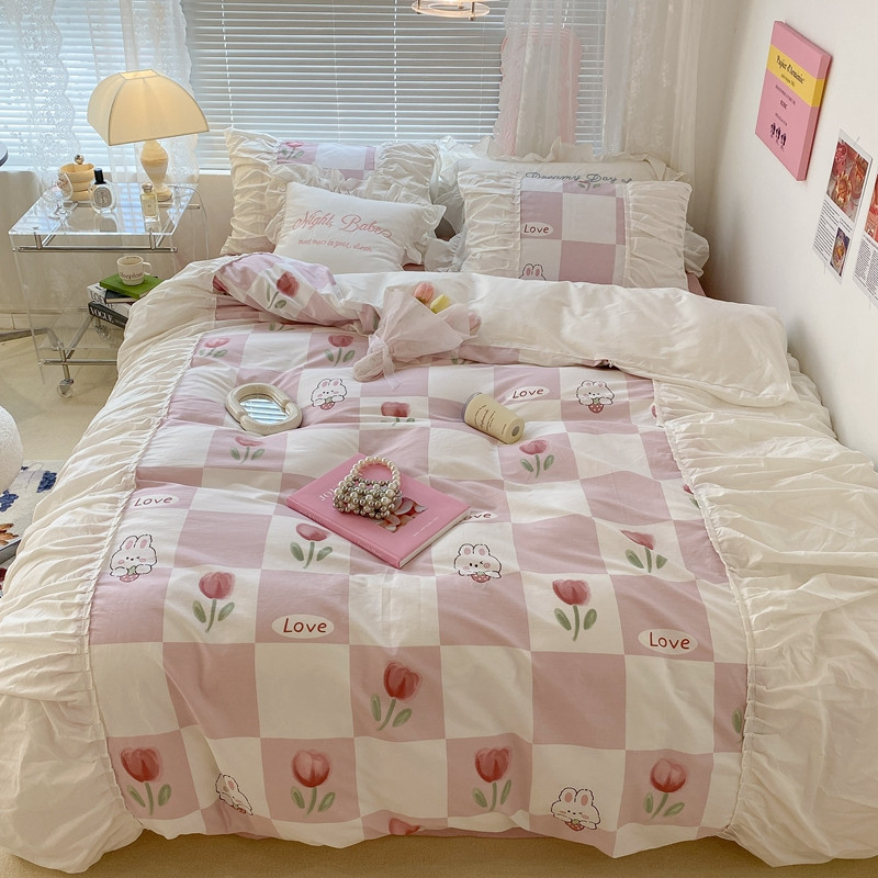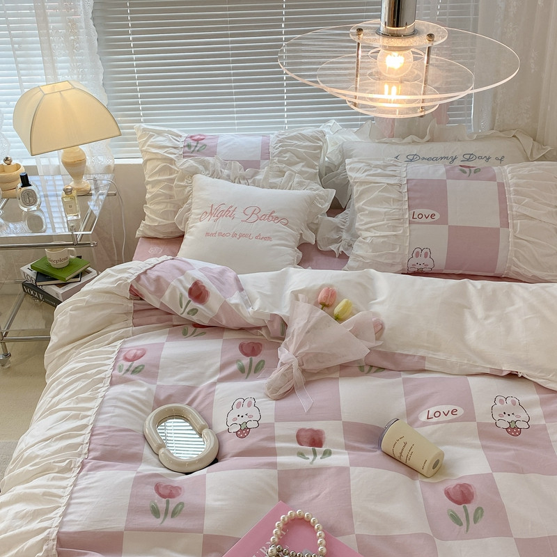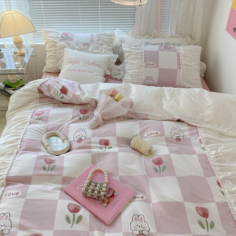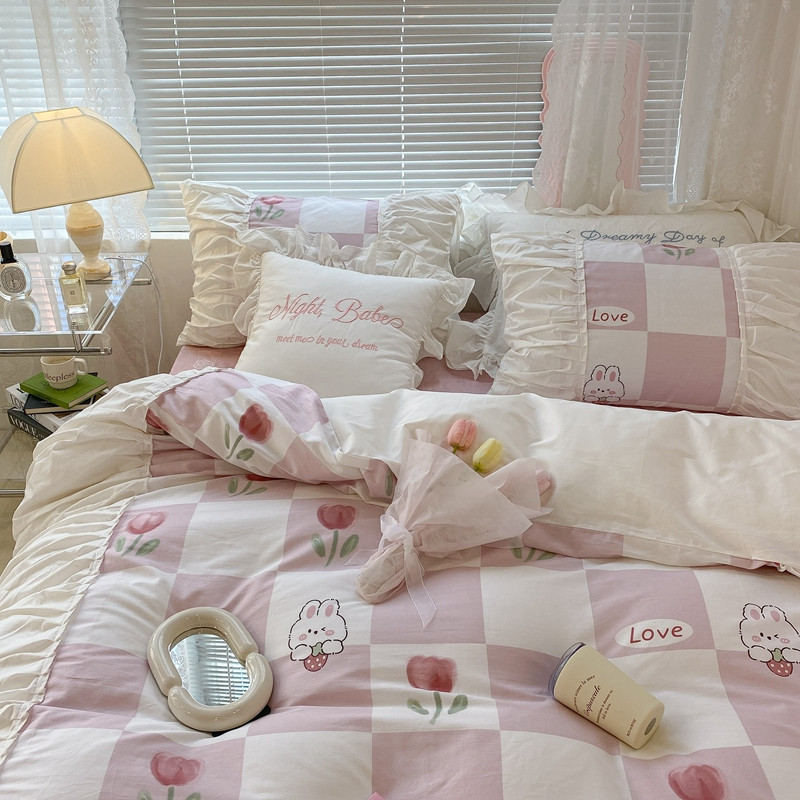 昔可 2022新款韩版花边系列四件套 粉格兔