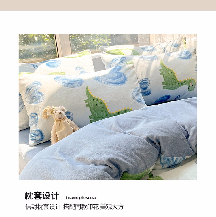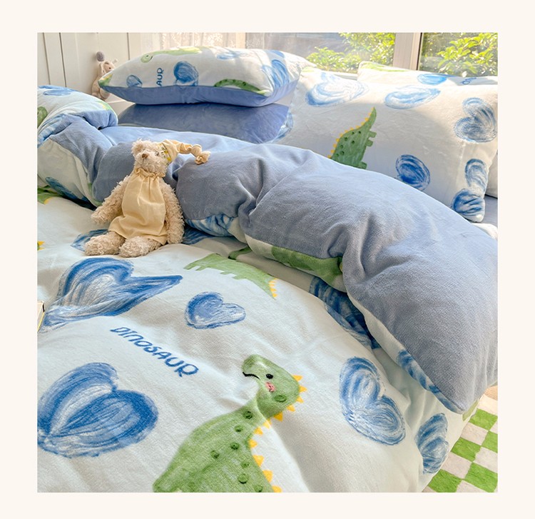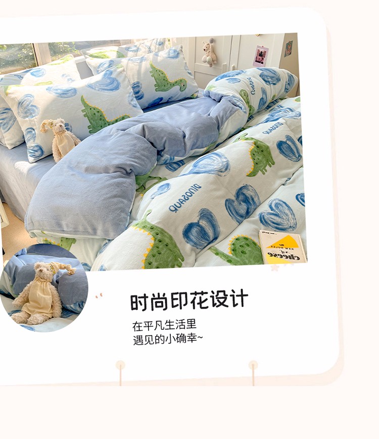 商品名称:雅居纺 2022新款牛奶绒印花四件套 爱心恐龙