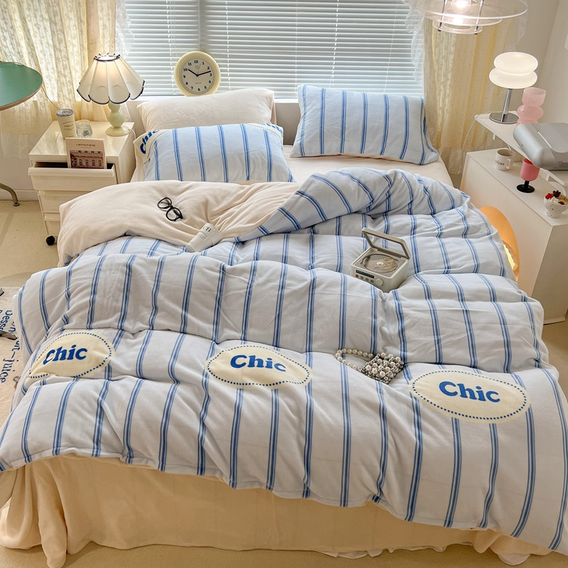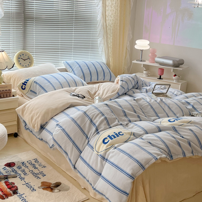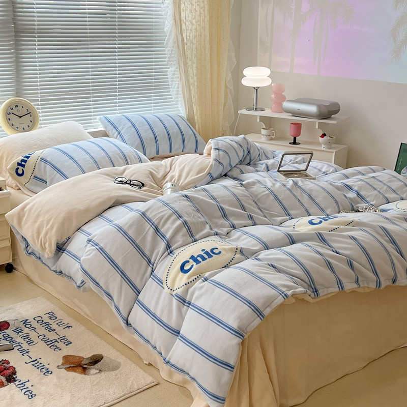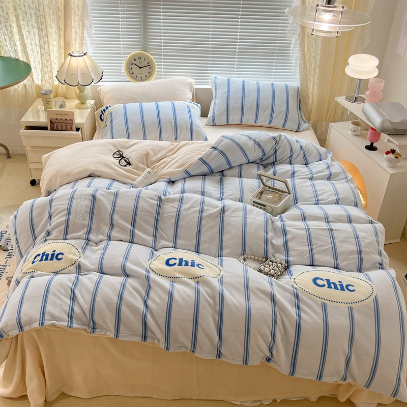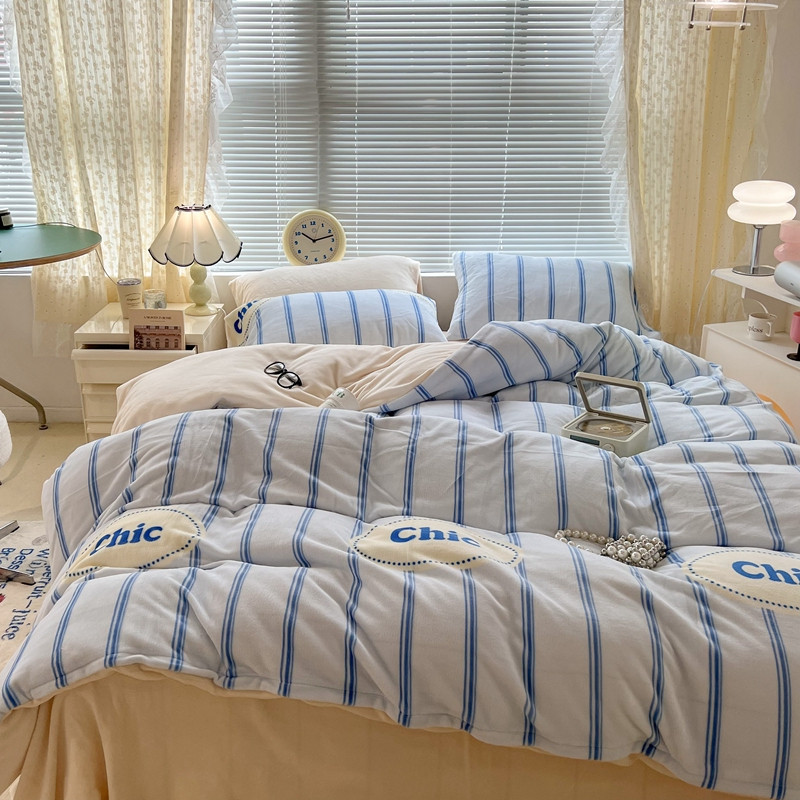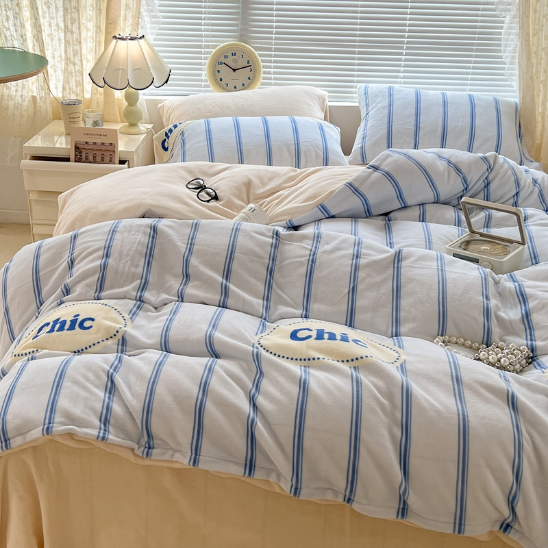 昔可 2022新款牛奶绒简约系列四件套 chic条纹蓝