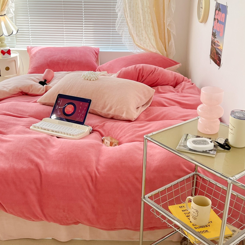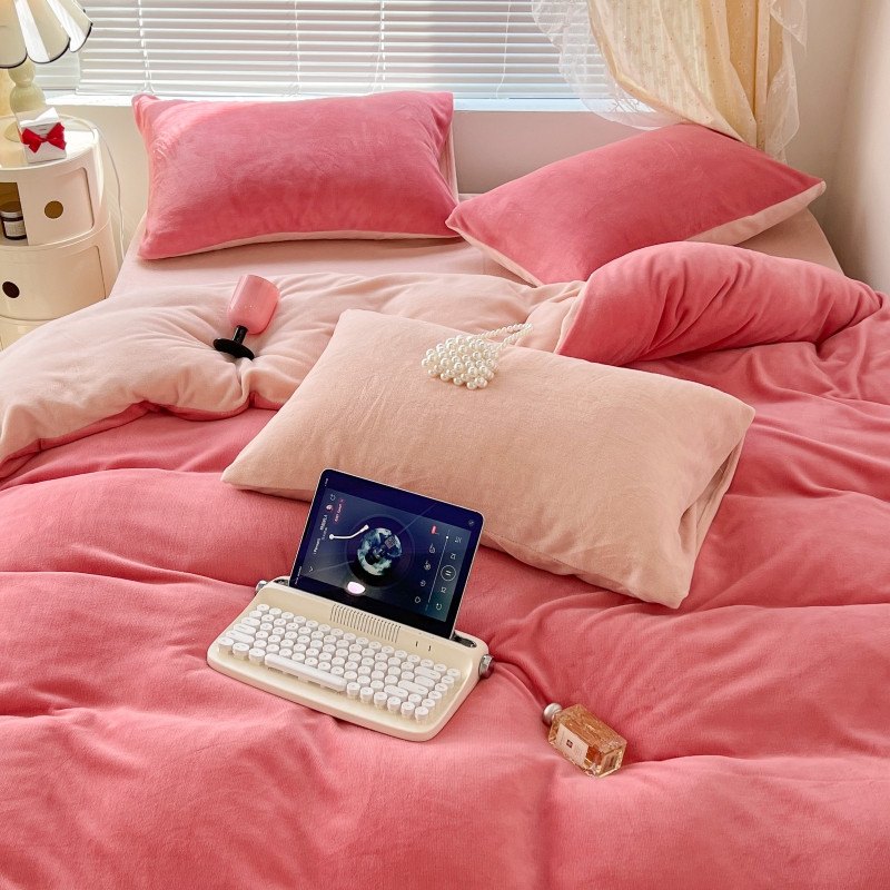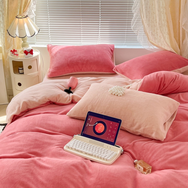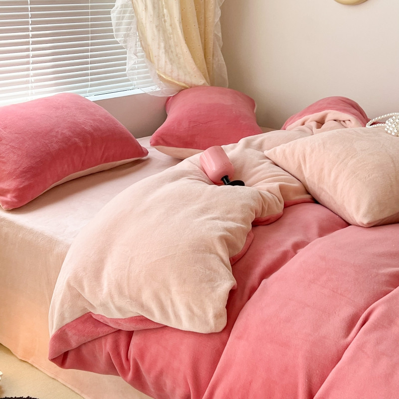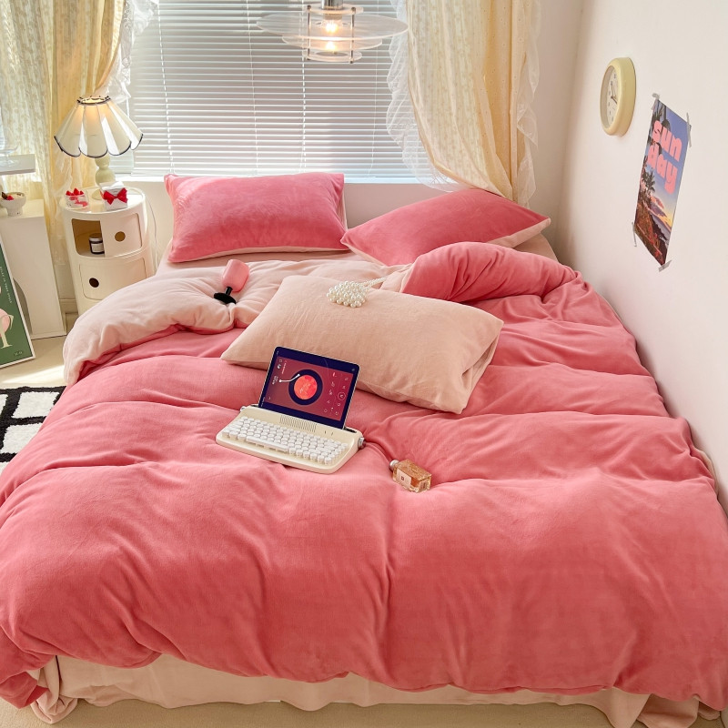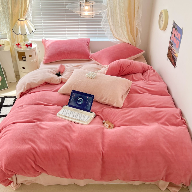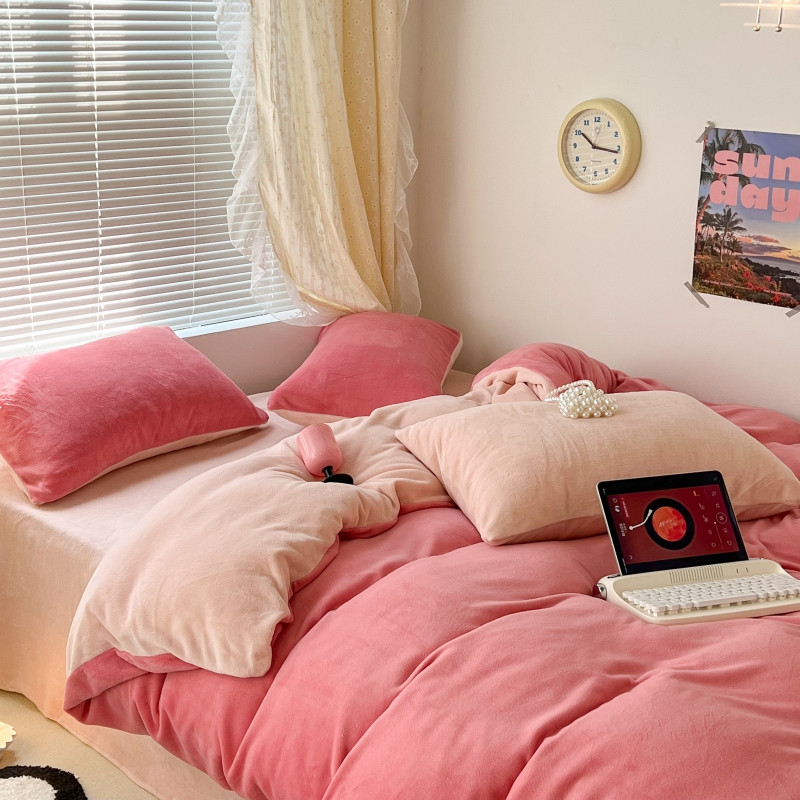 昔可 2022新款奶油双拼系列牛奶绒四件套 树莓红拼粉