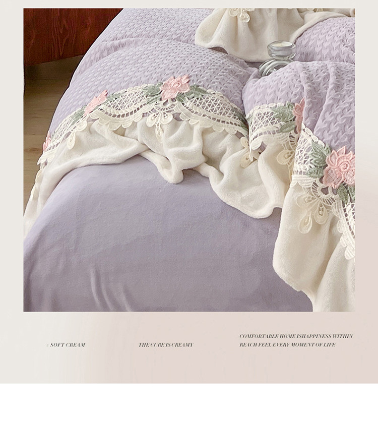 商品名称:玛奇朵 高定蕾丝边全消光云芙暖绒四件套-唯 一(场景1) 唯一(紫)