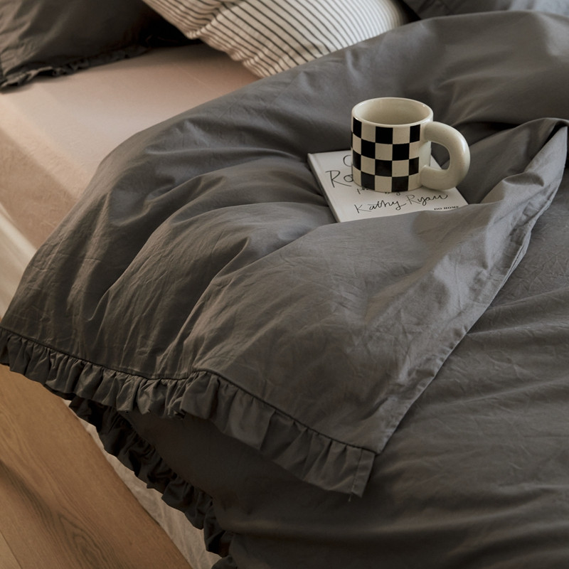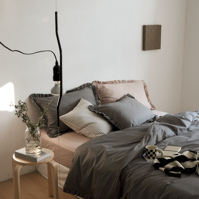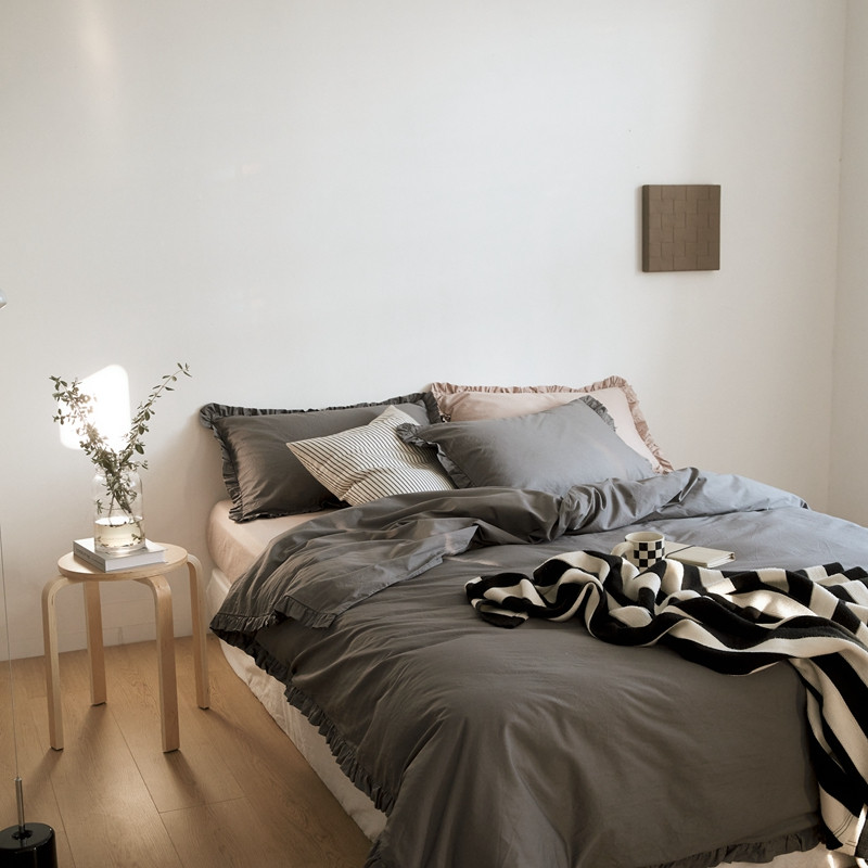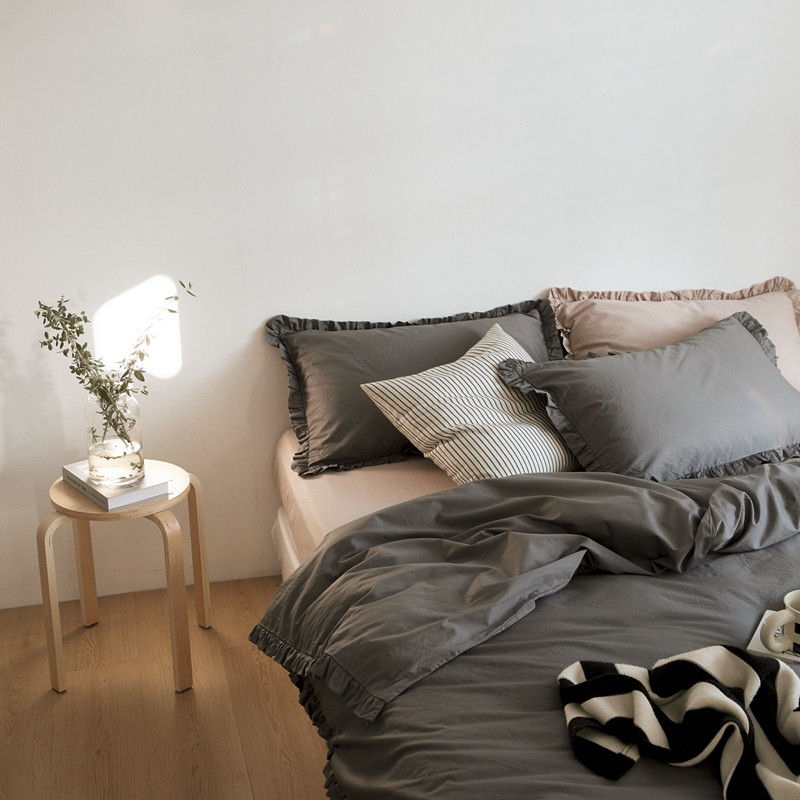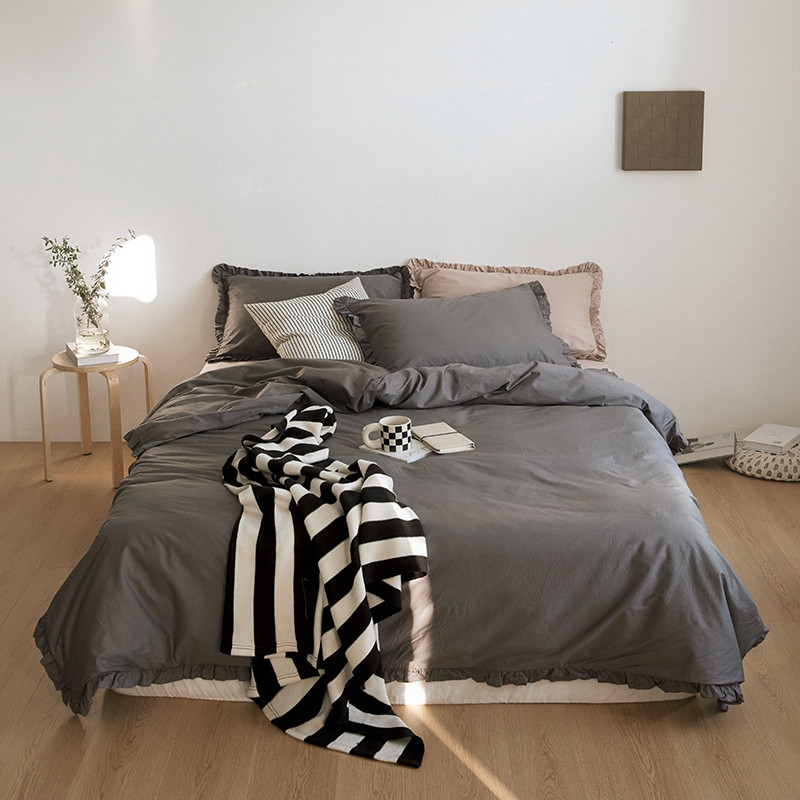当前位置: 91家纺网 > 商品网购 > 床品套件 > 四件套 > 全棉普通四件套 > 新款13372全棉日系褶皱边四件套 深灰色
