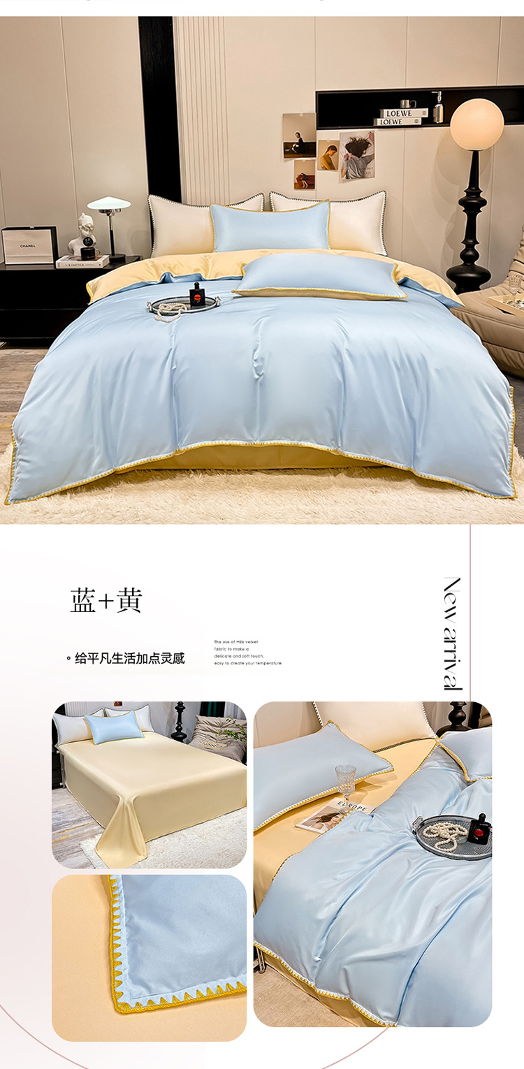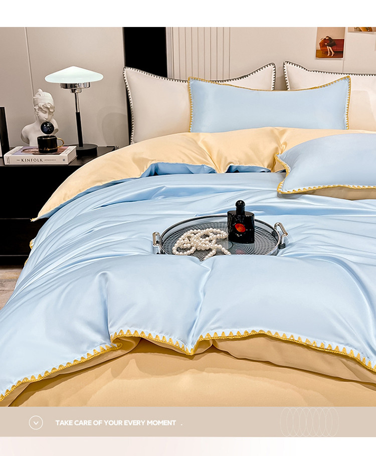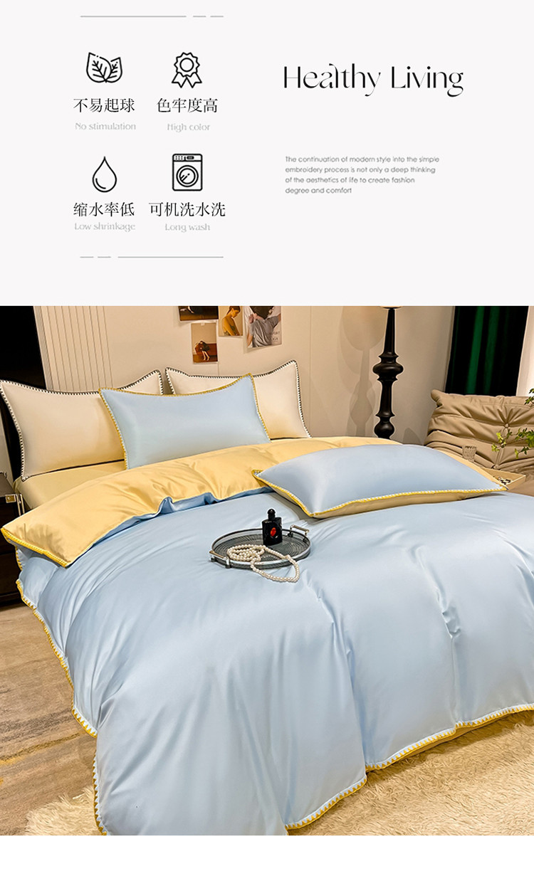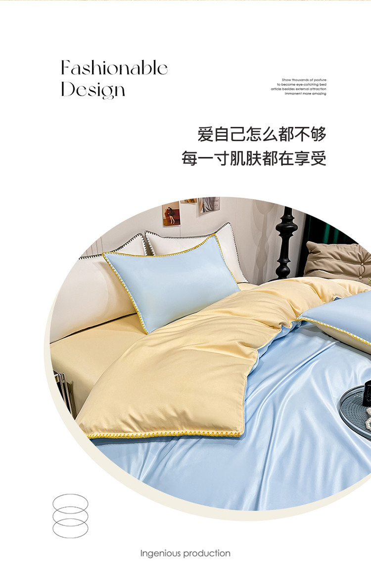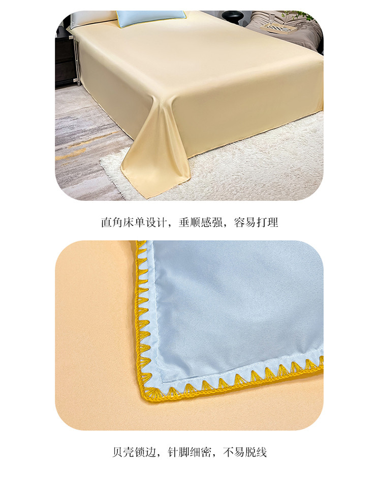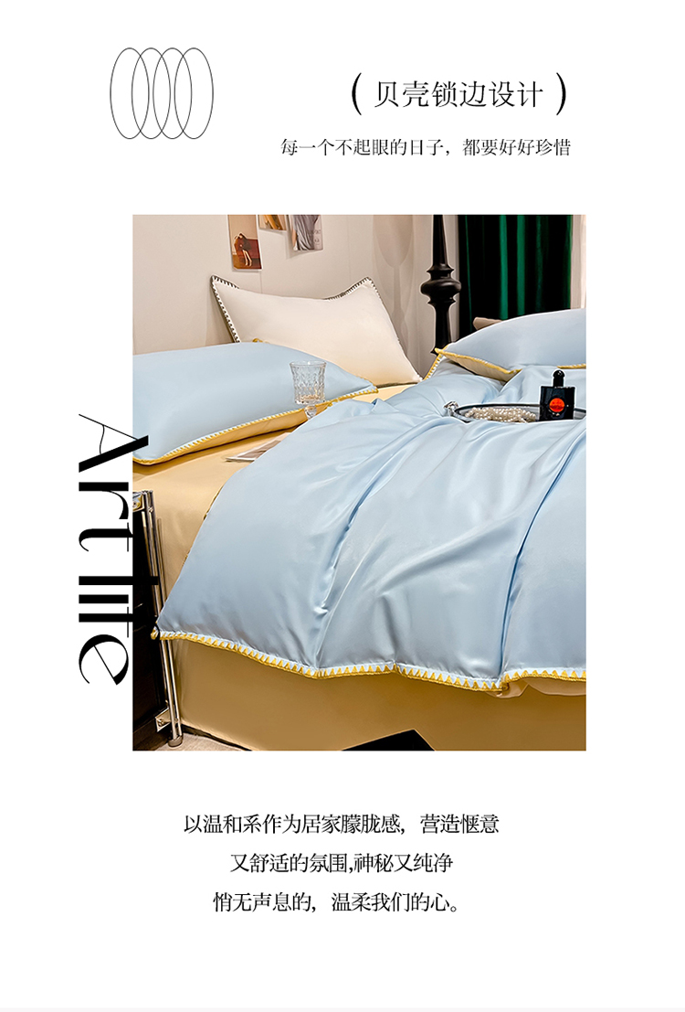 艾米家居 2025新款水洗真丝贝壳边系列四件套 蓝+黄