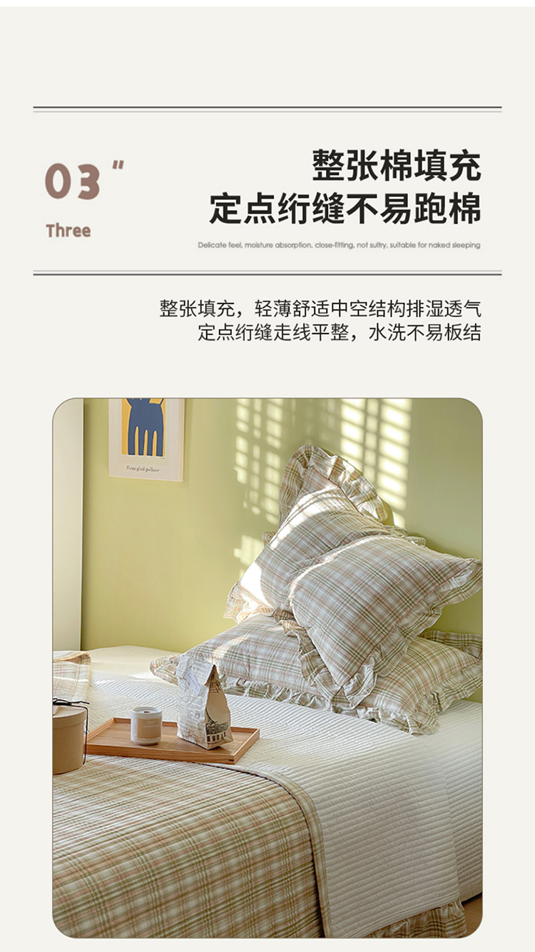2022新款40S纯棉水洗棉全棉荷叶边夹棉床盖三件套青草绿,青草绿
