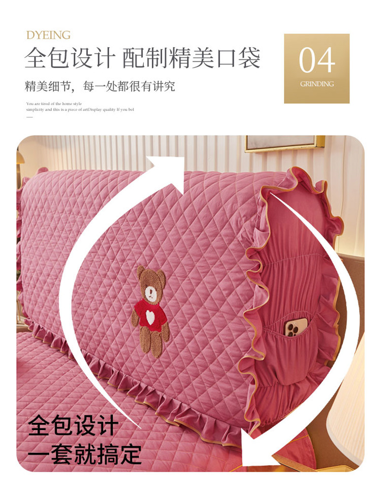 (总)屹成家纺2025新款水晶绒夹棉绗缝蕾丝床裙三件套(塞纳河畔)床裙单件起售价不低于105元,大红,豆沙,翡翠绿,粉玉,橄榄绿,蔚蓝,银灰