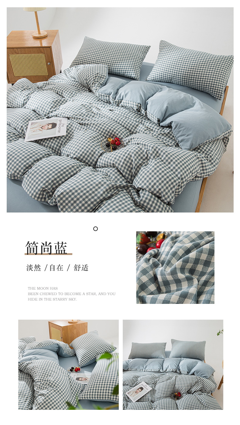 当前位置: 91家纺网 > 商品网购 > 床品套件 > 四件套 > 水洗棉四件套 > 宏源家纺 2023年4月新款水洗棉麻简约格子四件套 简尚蓝
