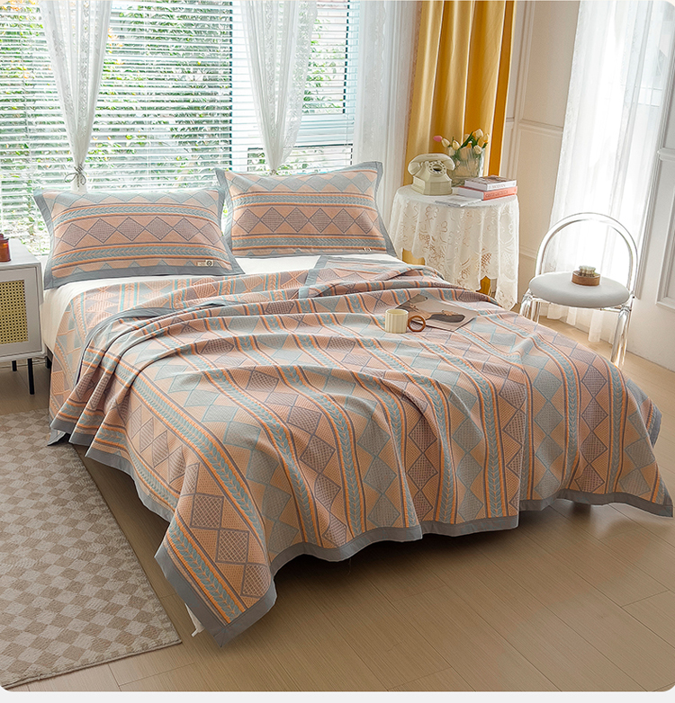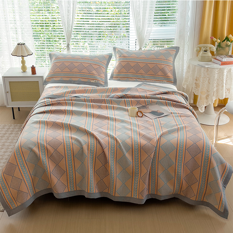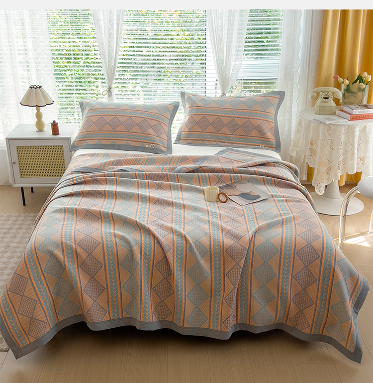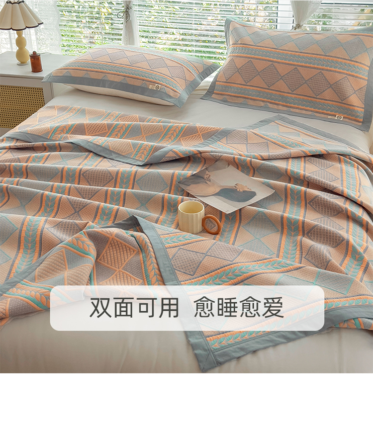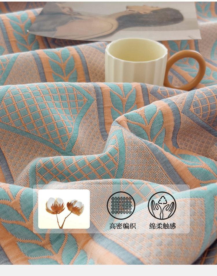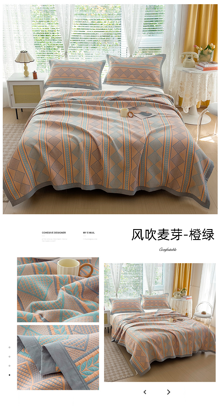 全棉三层细纱色织提花毛巾被盖毯大床盖夏被空调被毛巾毯 风吹麦芽 橙绿