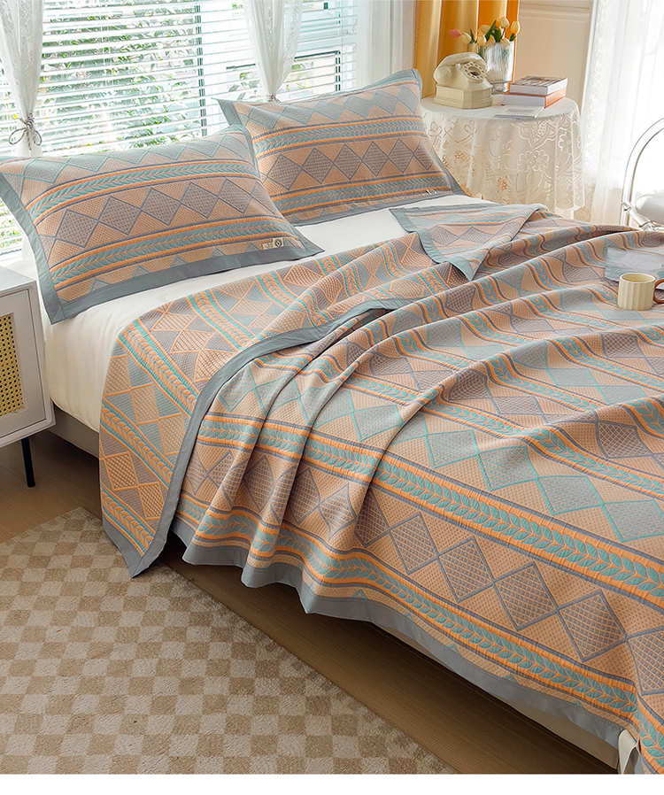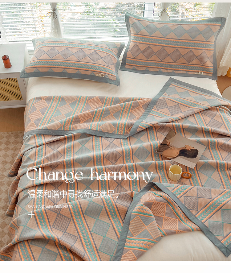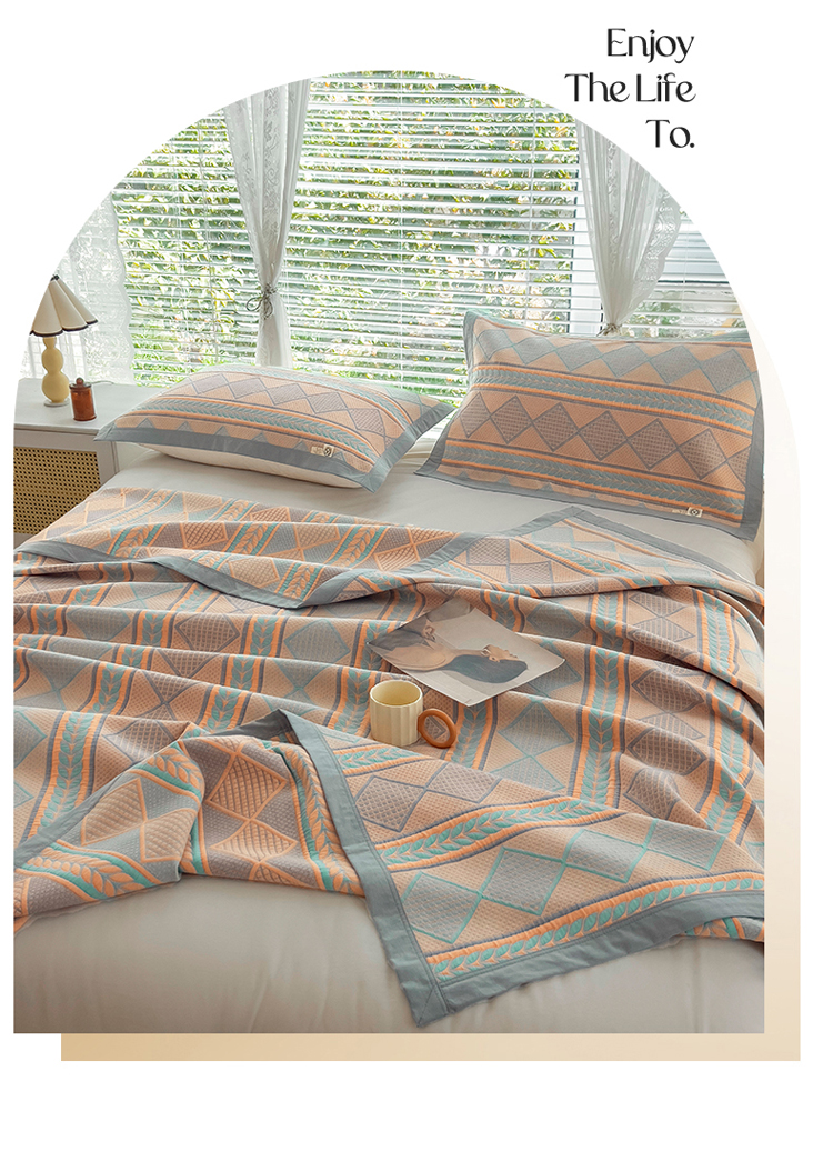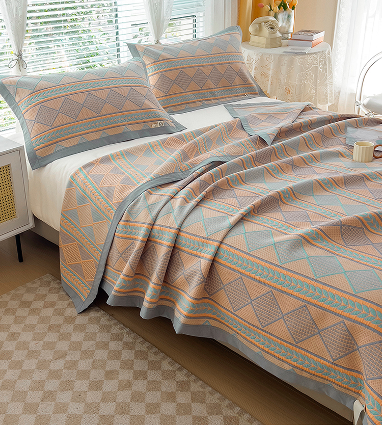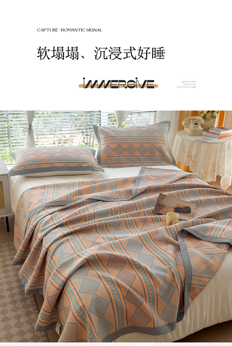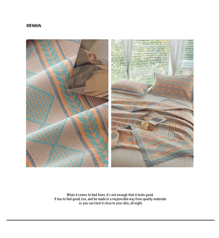 全棉三层细纱色织提花毛巾被盖毯大床盖夏被空调被毛巾毯 风吹麦芽 橙绿