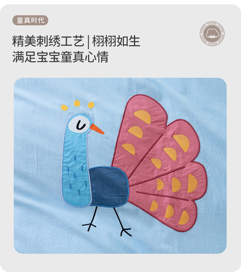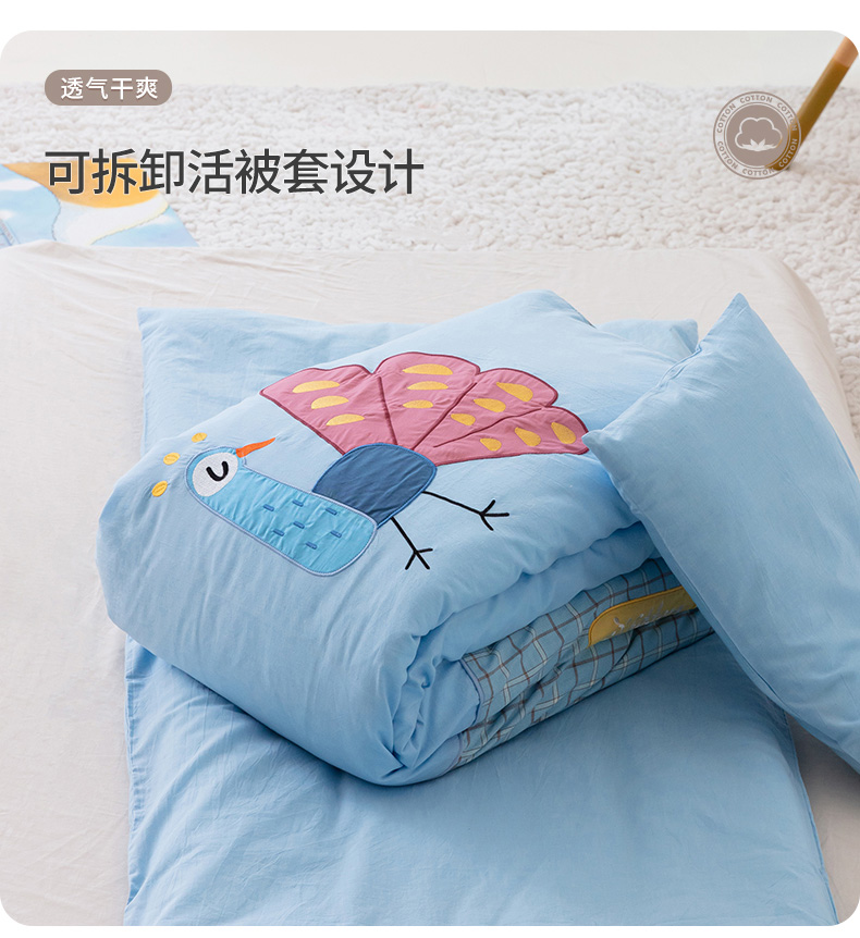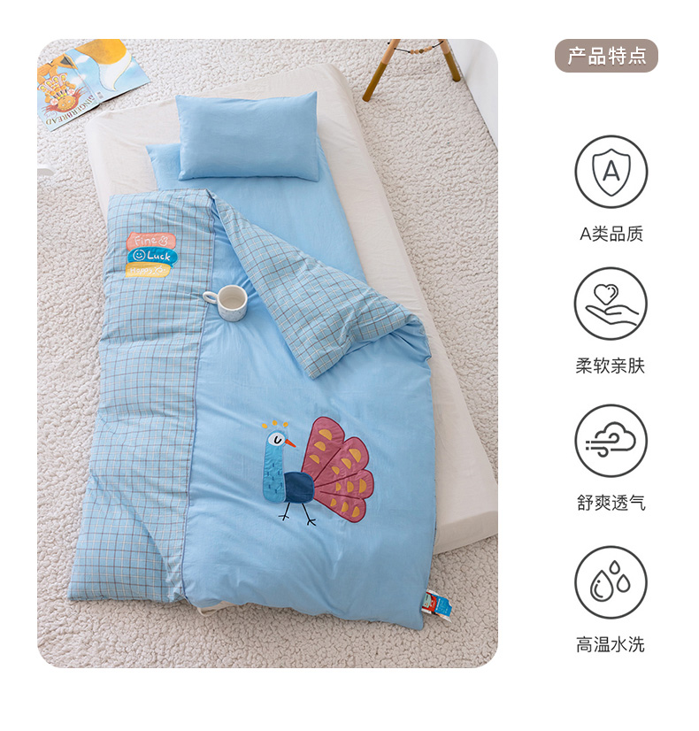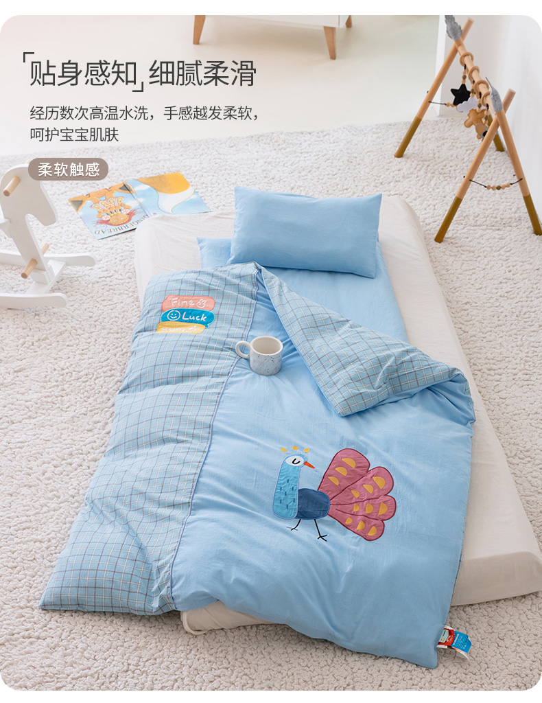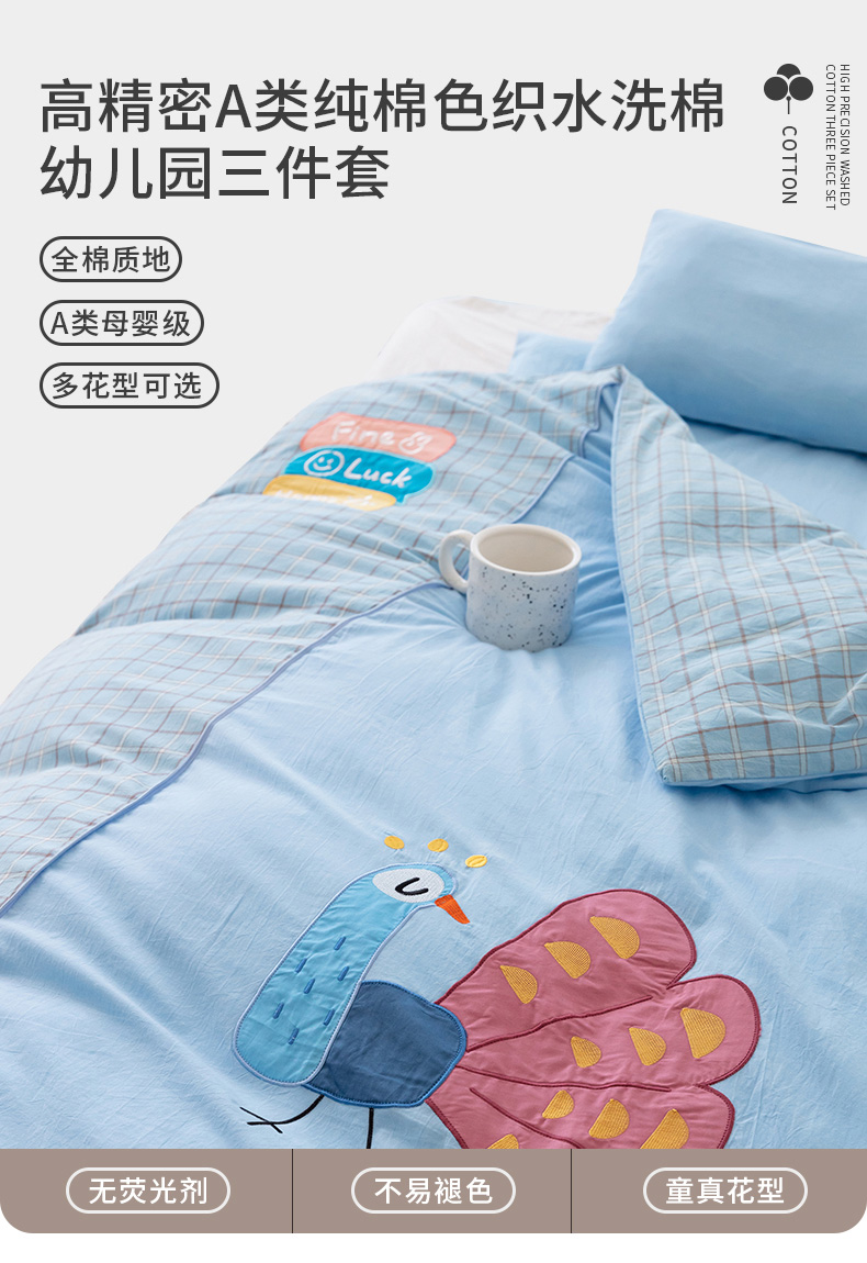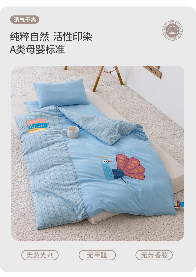 当前位置: 91家纺网 > 商品网购 > 床品套件 > 三件套 > 喜多兔儿童家纺 2023新款小心动幼儿园三件套 蓝色心动小孔雀