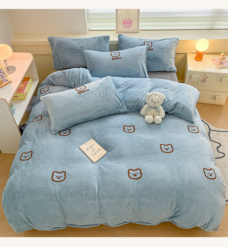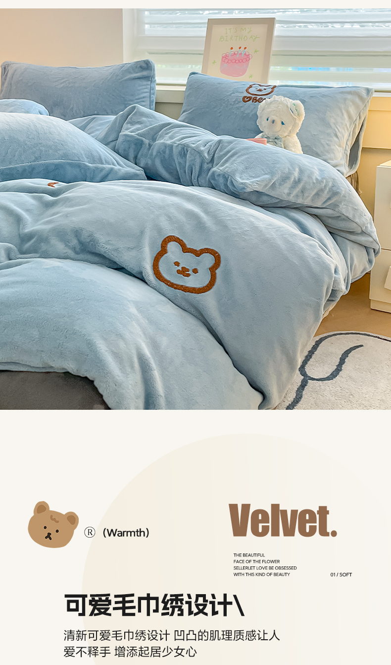雅居纺 2023新款200克毛巾绣牛奶绒四件套-小熊米奇系列 小熊-蓝灰