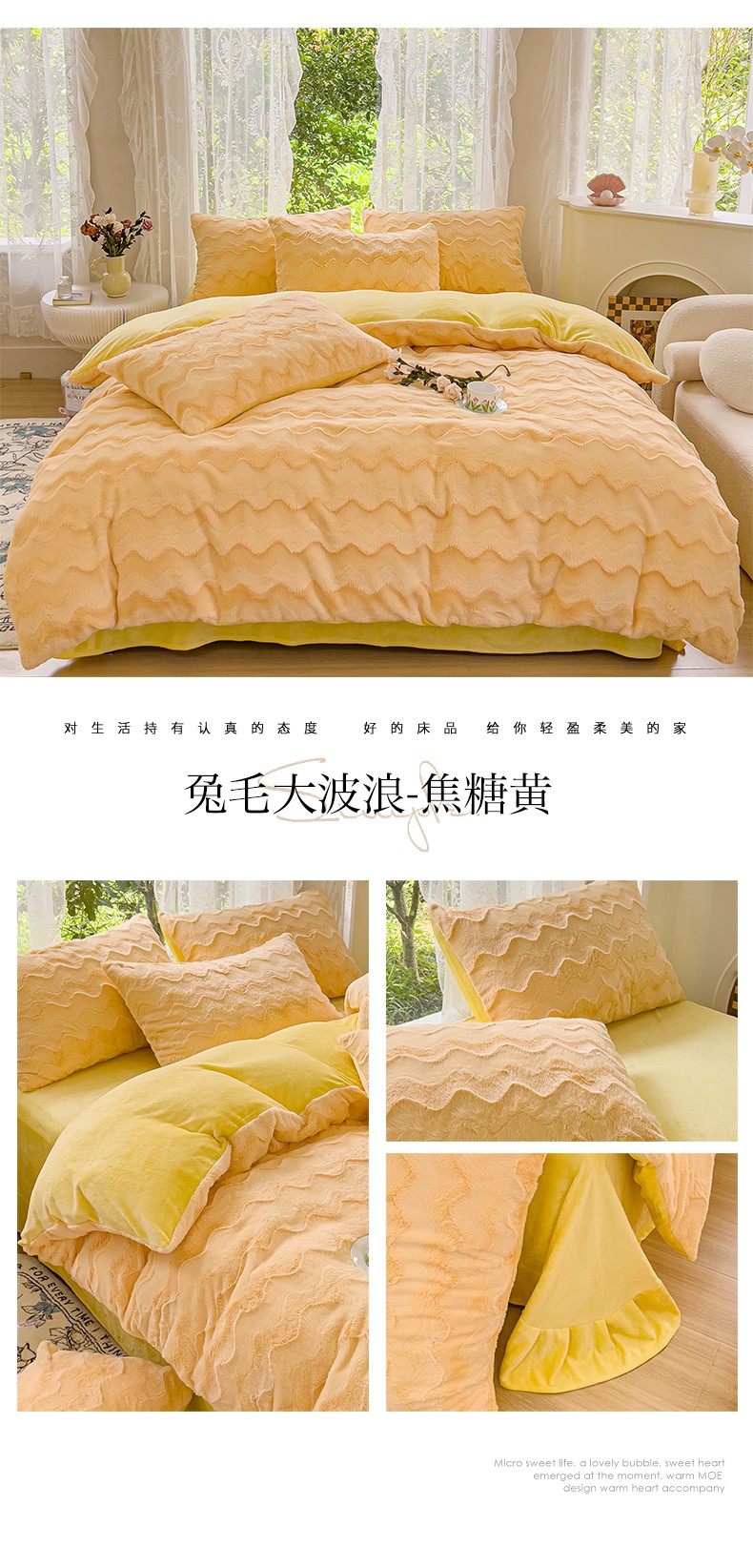商品名称:铠畅 2023爆款320克A类獭兔毛立体剪花纯色牛奶绒四件套-大波浪 大波浪款-焦糖黄