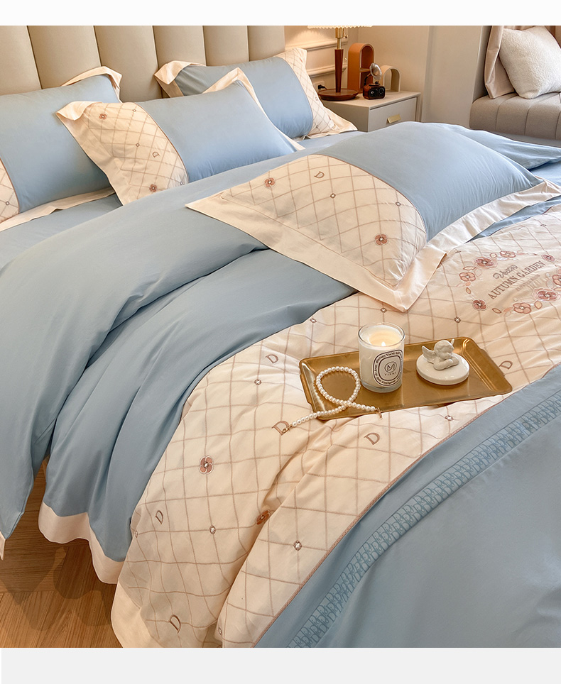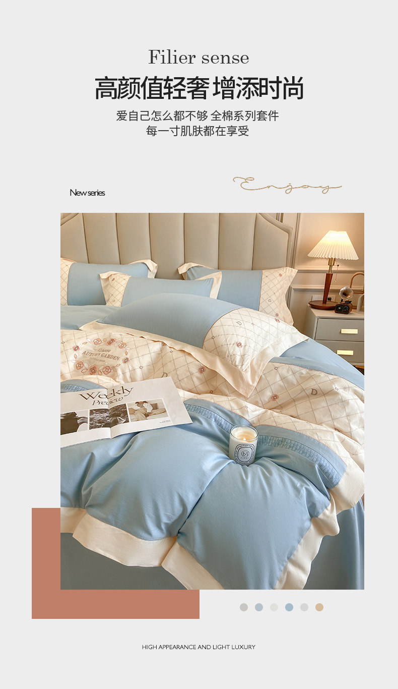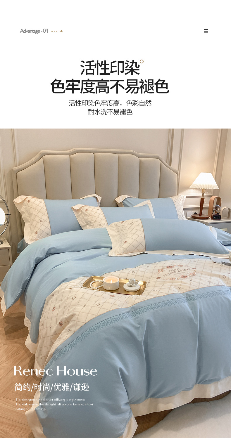 商品名称:丝印良品 2023秋冬保暖60S全棉刺绣拼接菲曼系列四件套 菲曼-纯净蓝