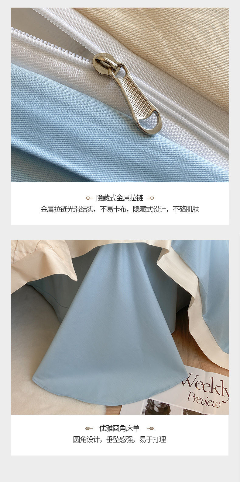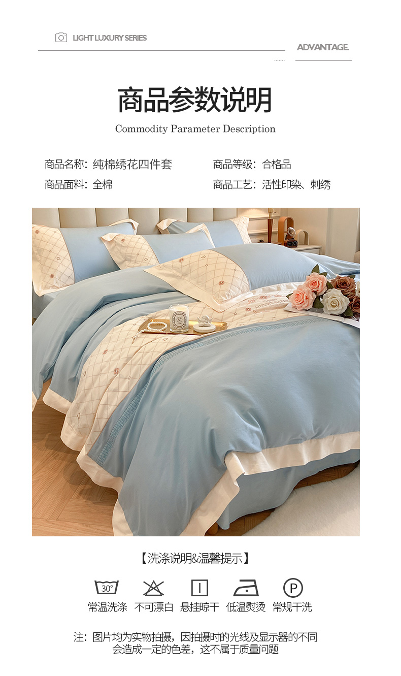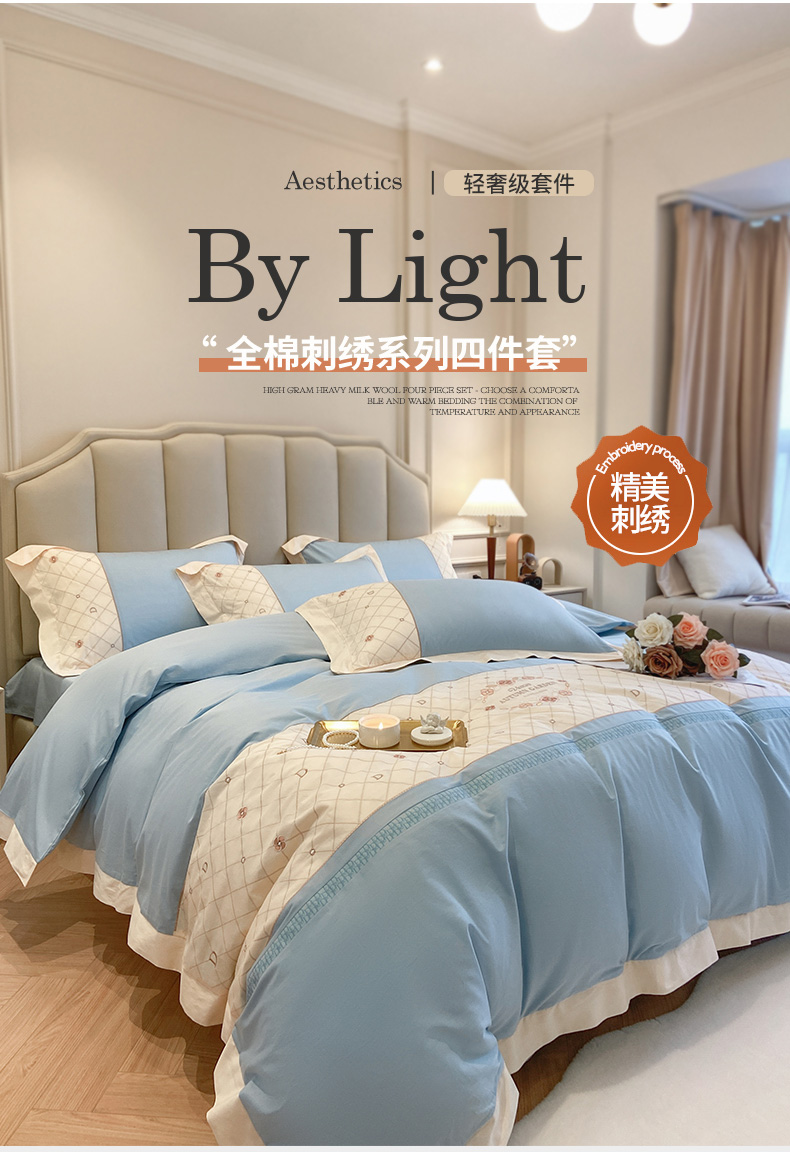 商品名称:丝印良品 2023秋冬保暖60S全棉刺绣拼接菲曼系列四件套 菲曼-纯净蓝
