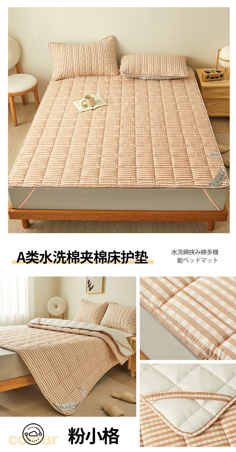 (总)满羽家纺 2023新款加厚水洗棉夹棉床护垫床垫,咖小格,粉大格,粉小格,绿小格,蓝大格,蓝小格