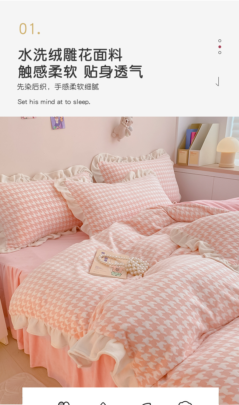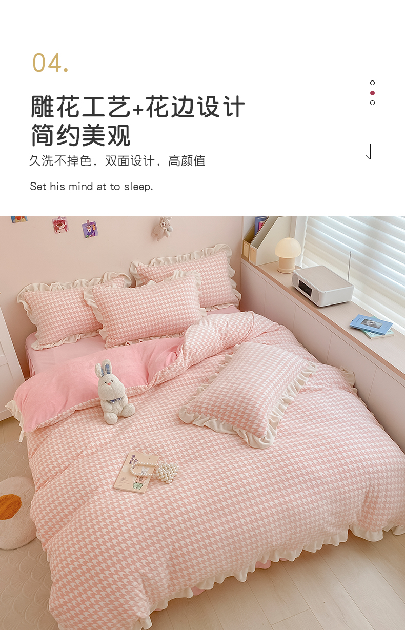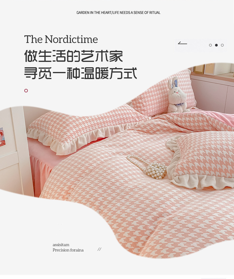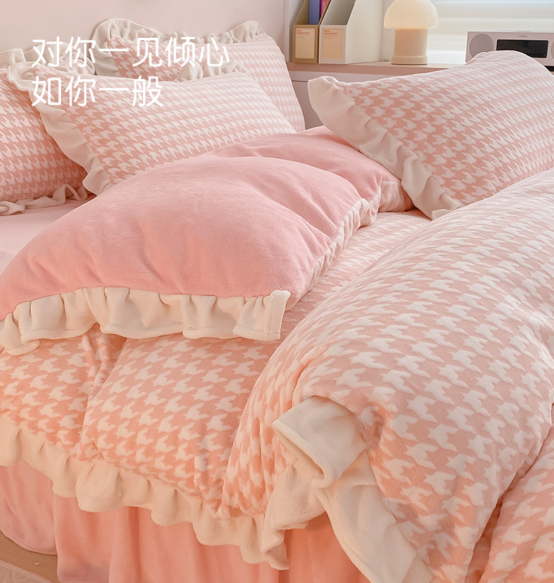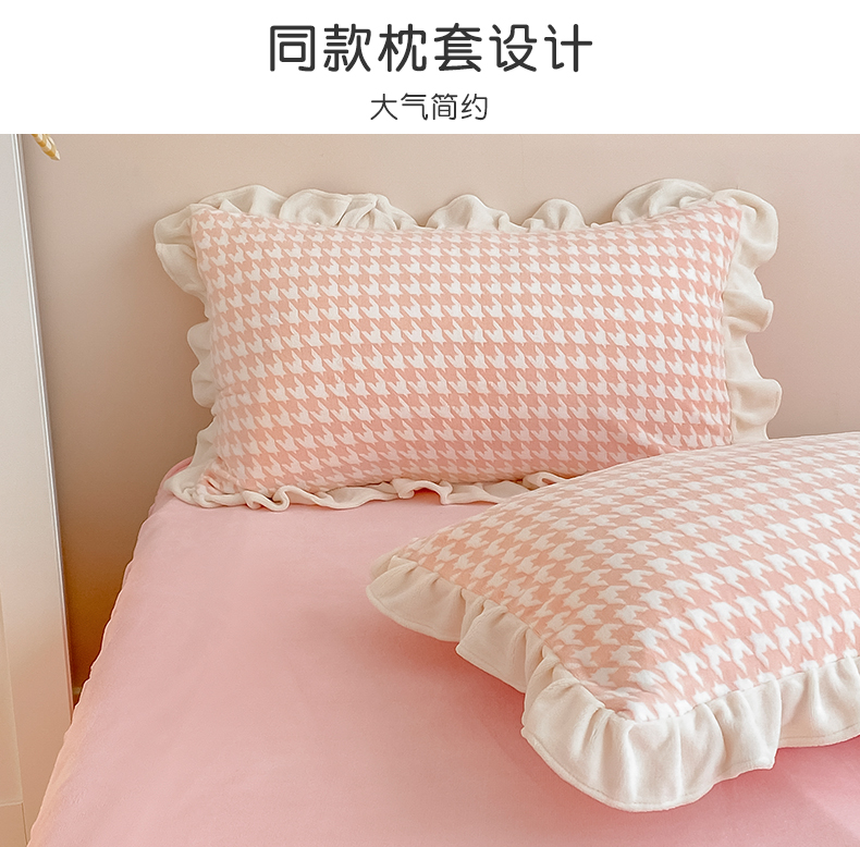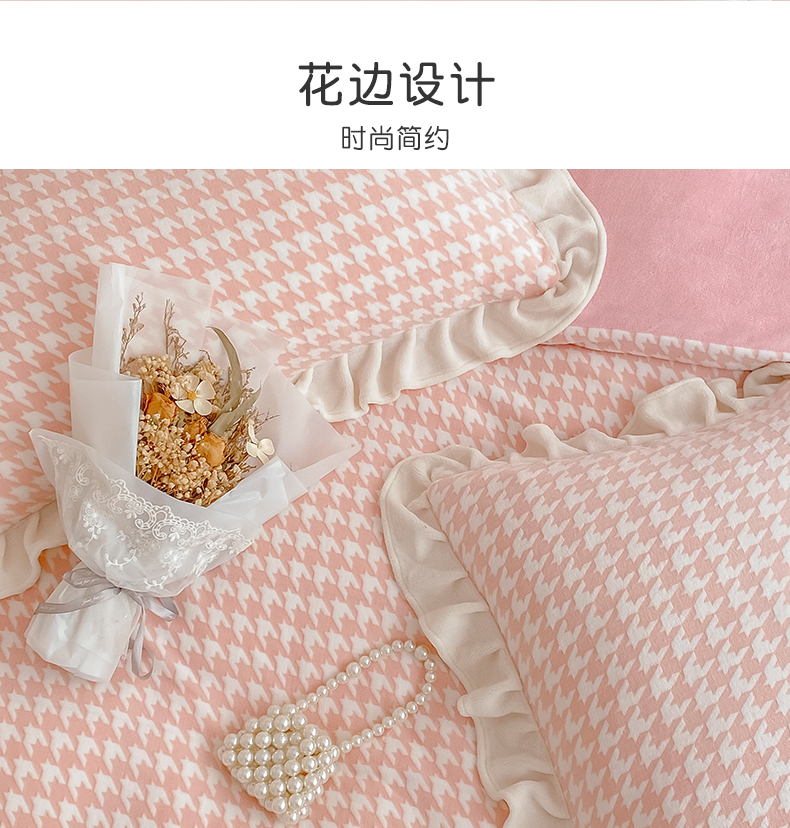 静家居 2024牛奶绒韩版花边提花四件套 绒千鸟格粉