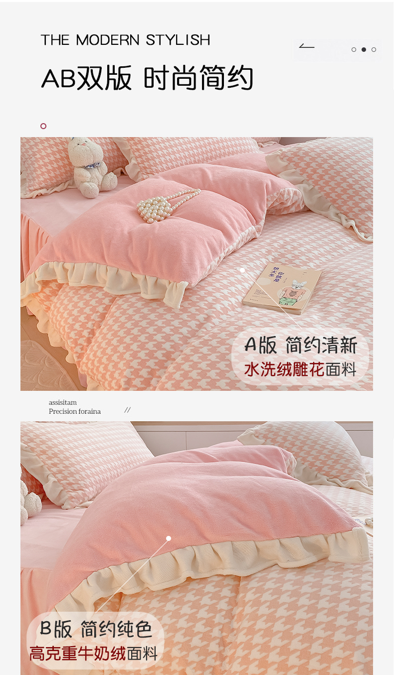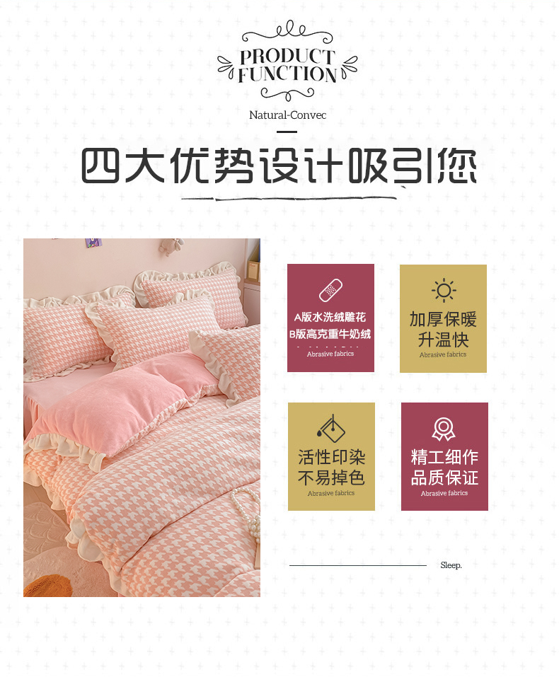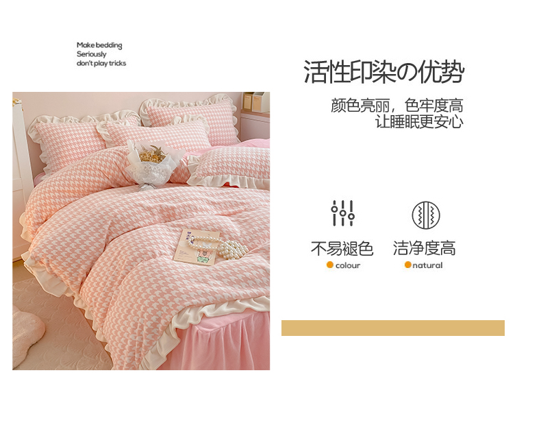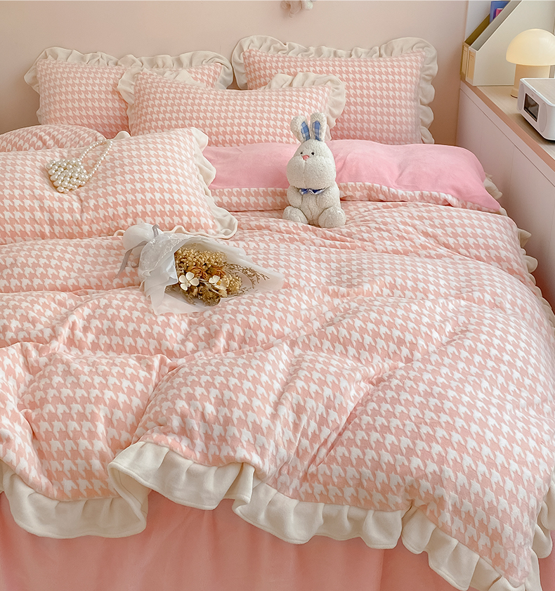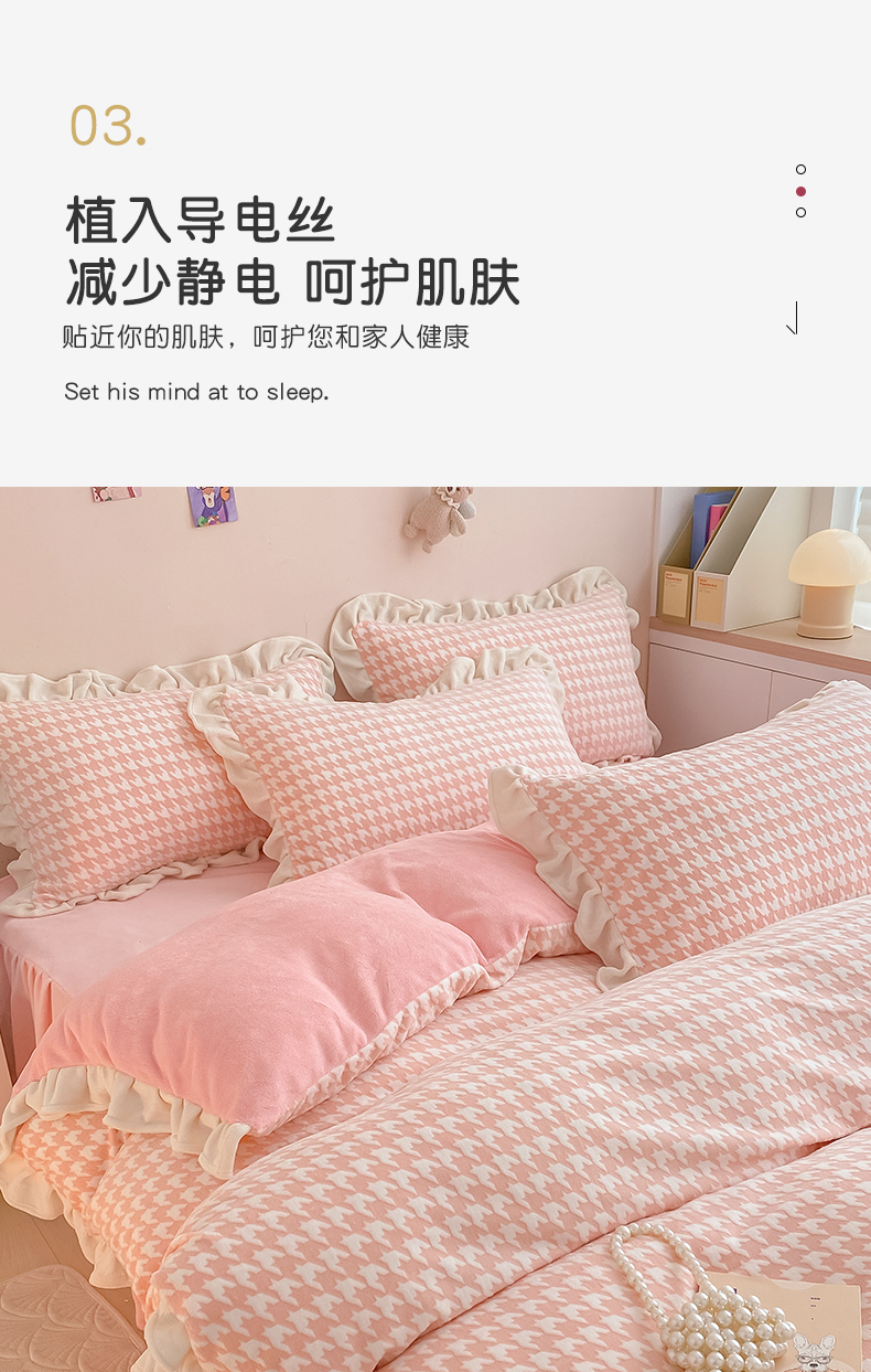 静家居 2024牛奶绒韩版花边提花四件套 绒千鸟格粉