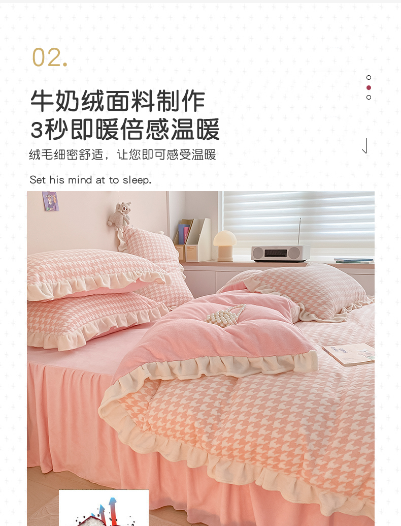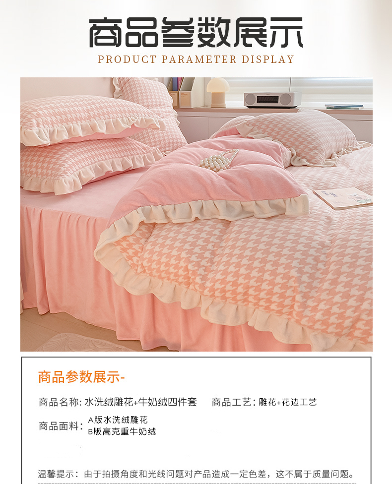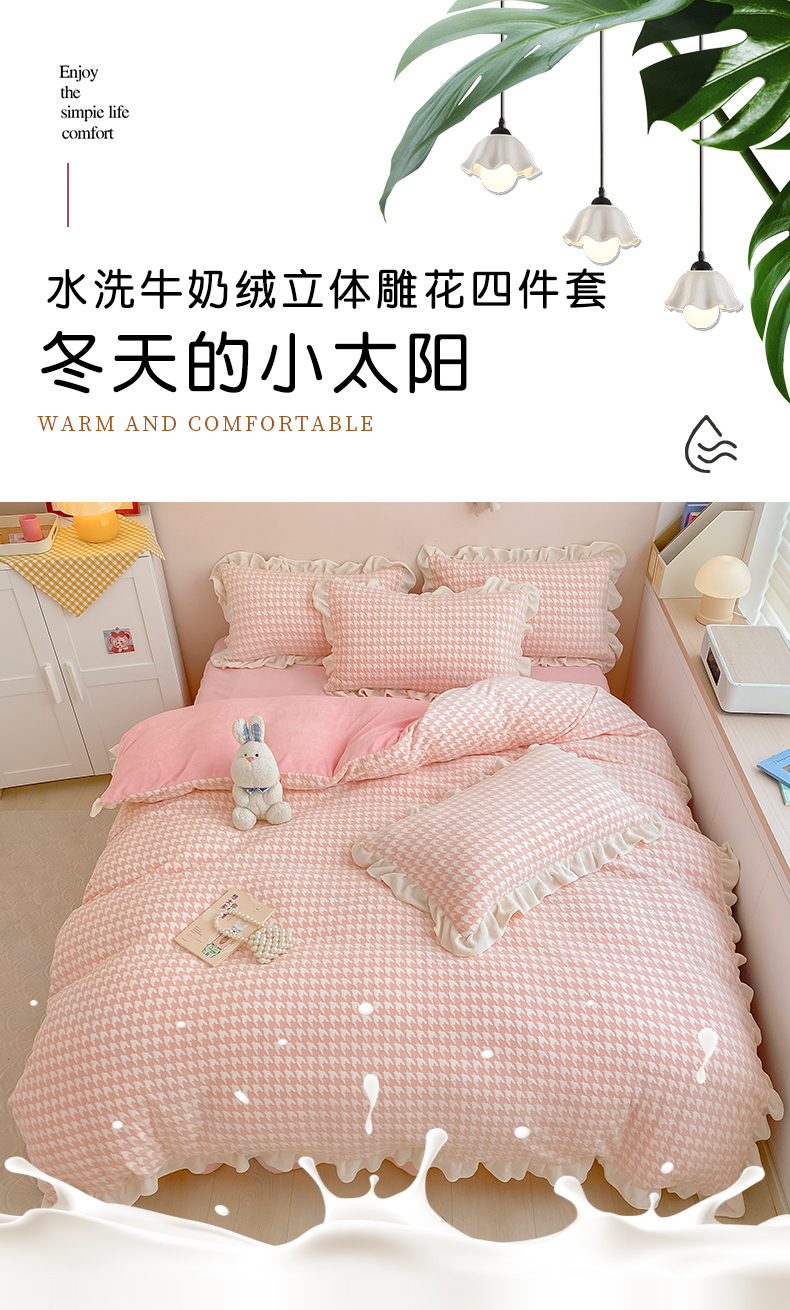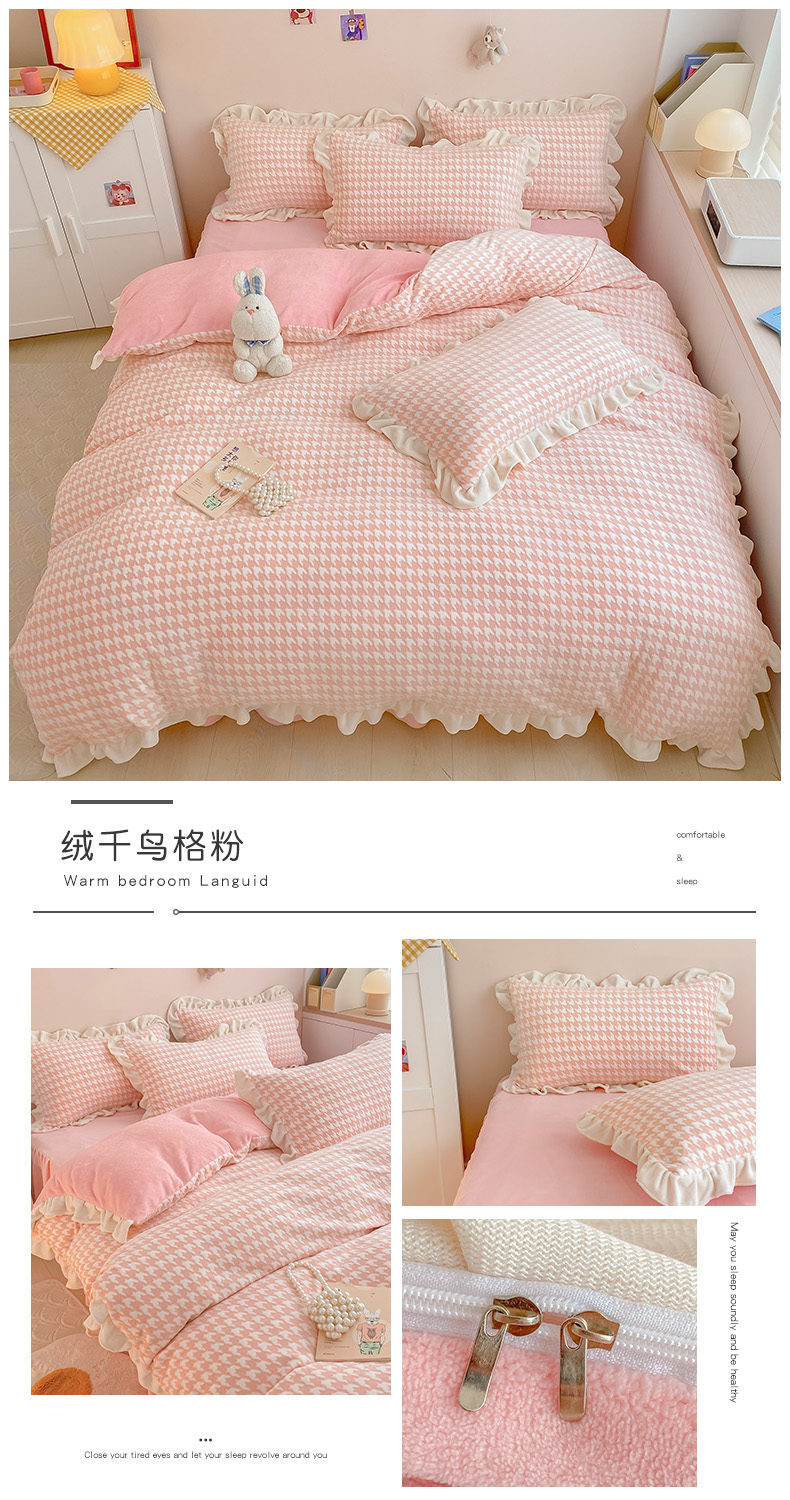商品名称:静家居 2024牛奶绒韩版花边提花四件套 绒千鸟格粉
