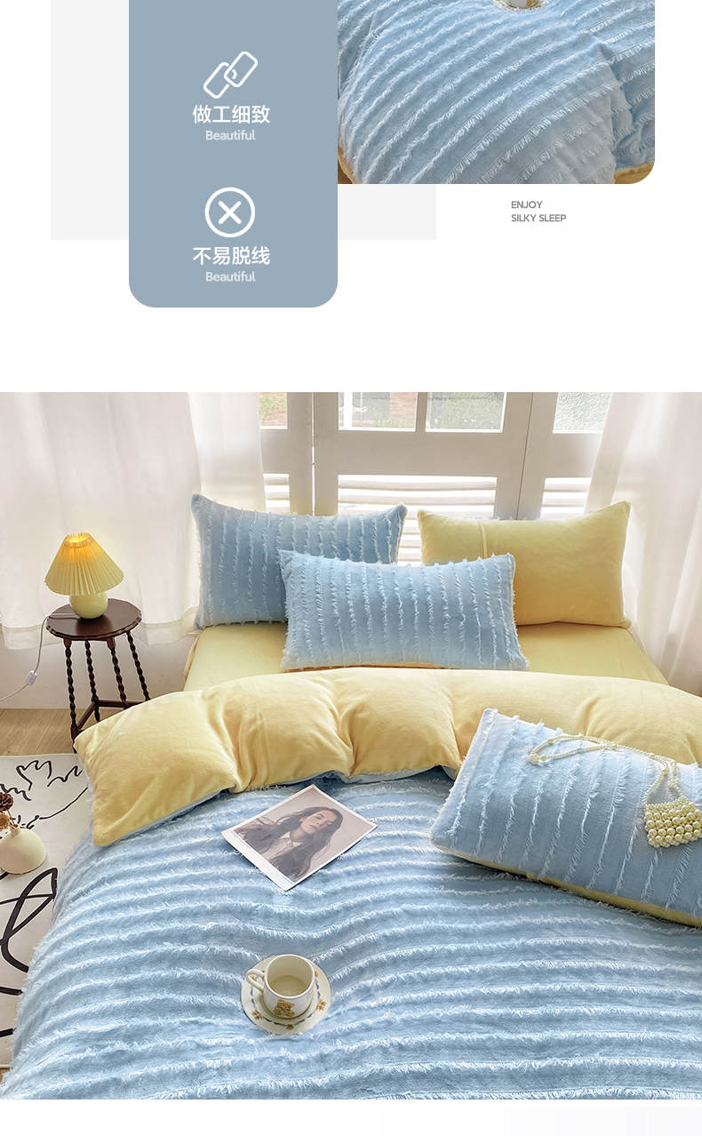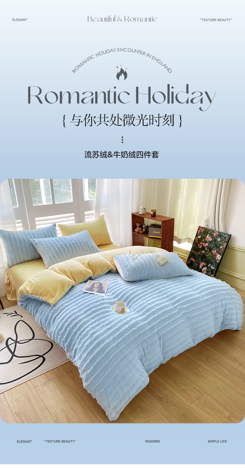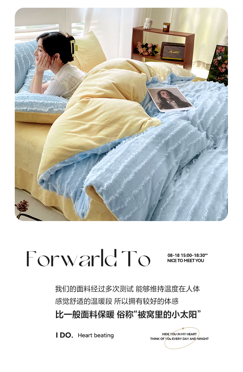 当前位置: 91家纺网 > 商品网购 > 床品套件 > 四件套 > 牛奶绒四件套 > 吾诺家居 2023新款保暖流苏绒牛奶绒四件套 流苏浅蓝