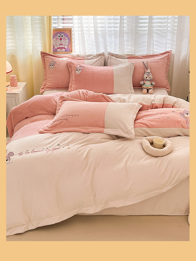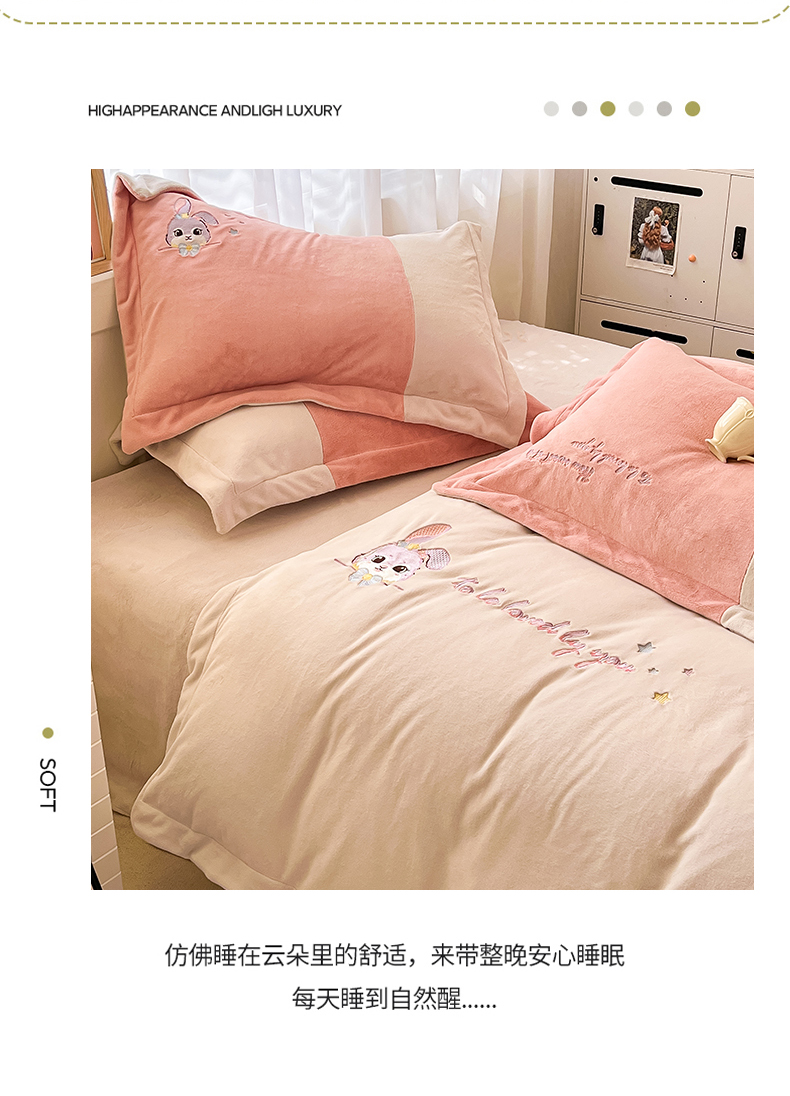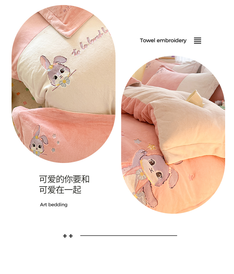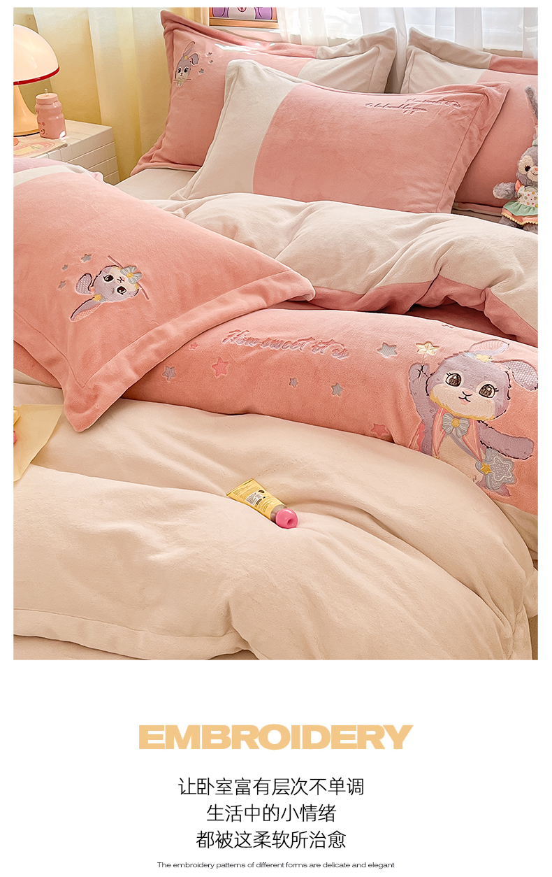 当前位置: 91家纺网 > 商品网购 > 床品套件 > 四件套 > 牛奶绒四件套 > 爱上家居 2023新款保暖加厚卡通刺绣牛奶绒四件套 兔眠-卡其拼粉