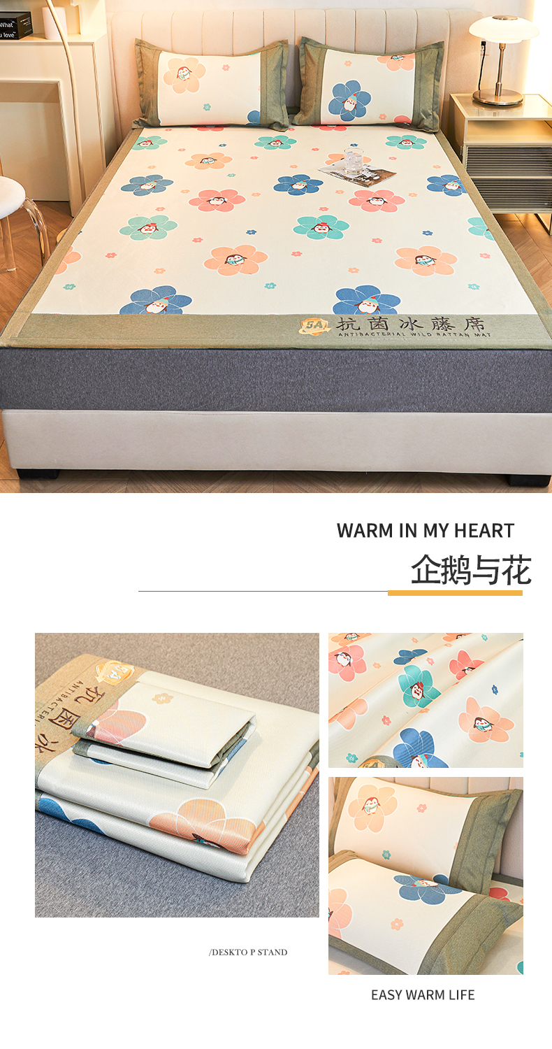 商品名称:鑫姿席业 2025新款A类抗菌冰藤席 企鹅与花-1