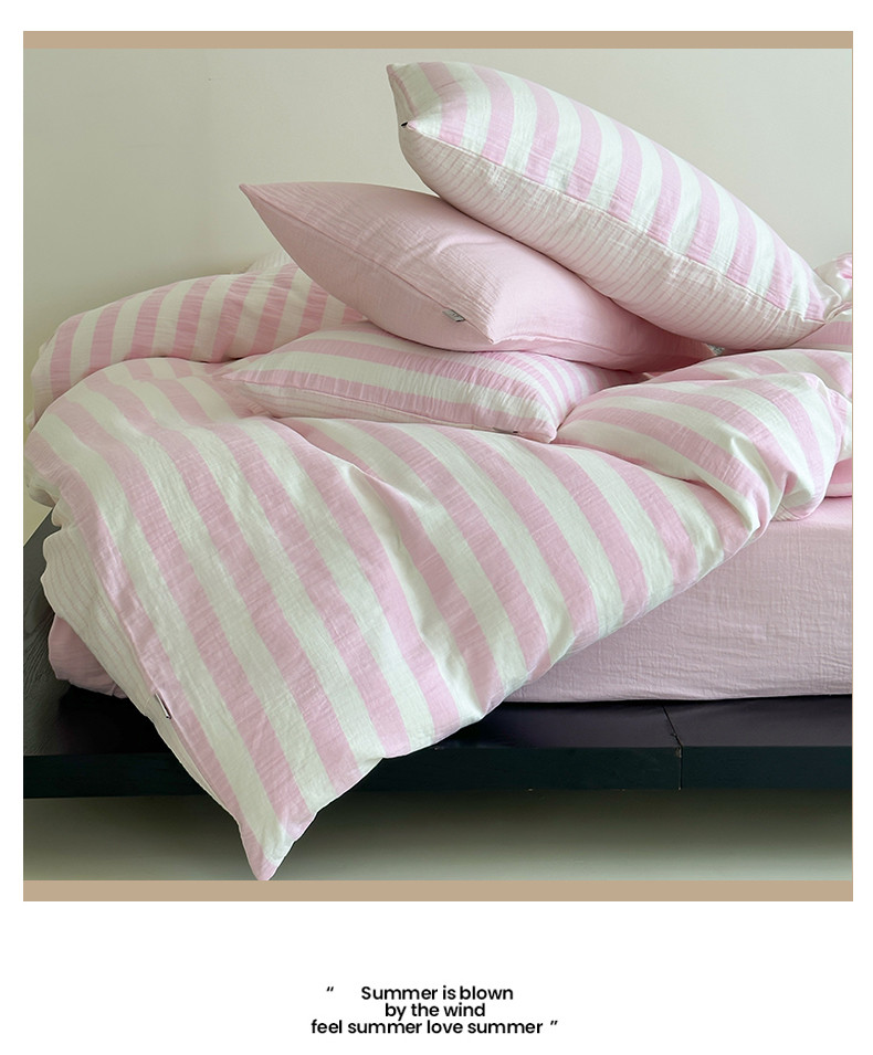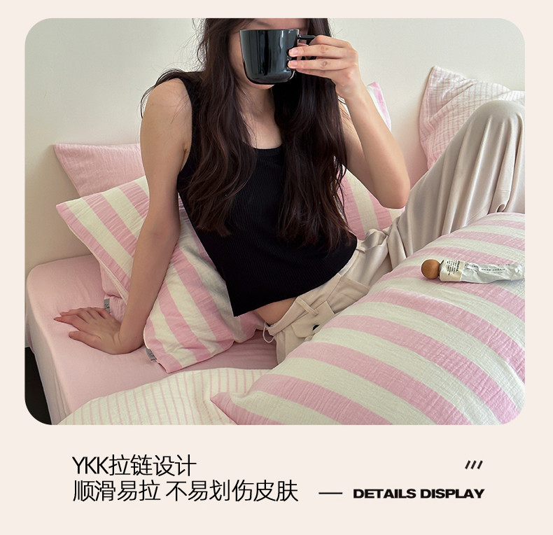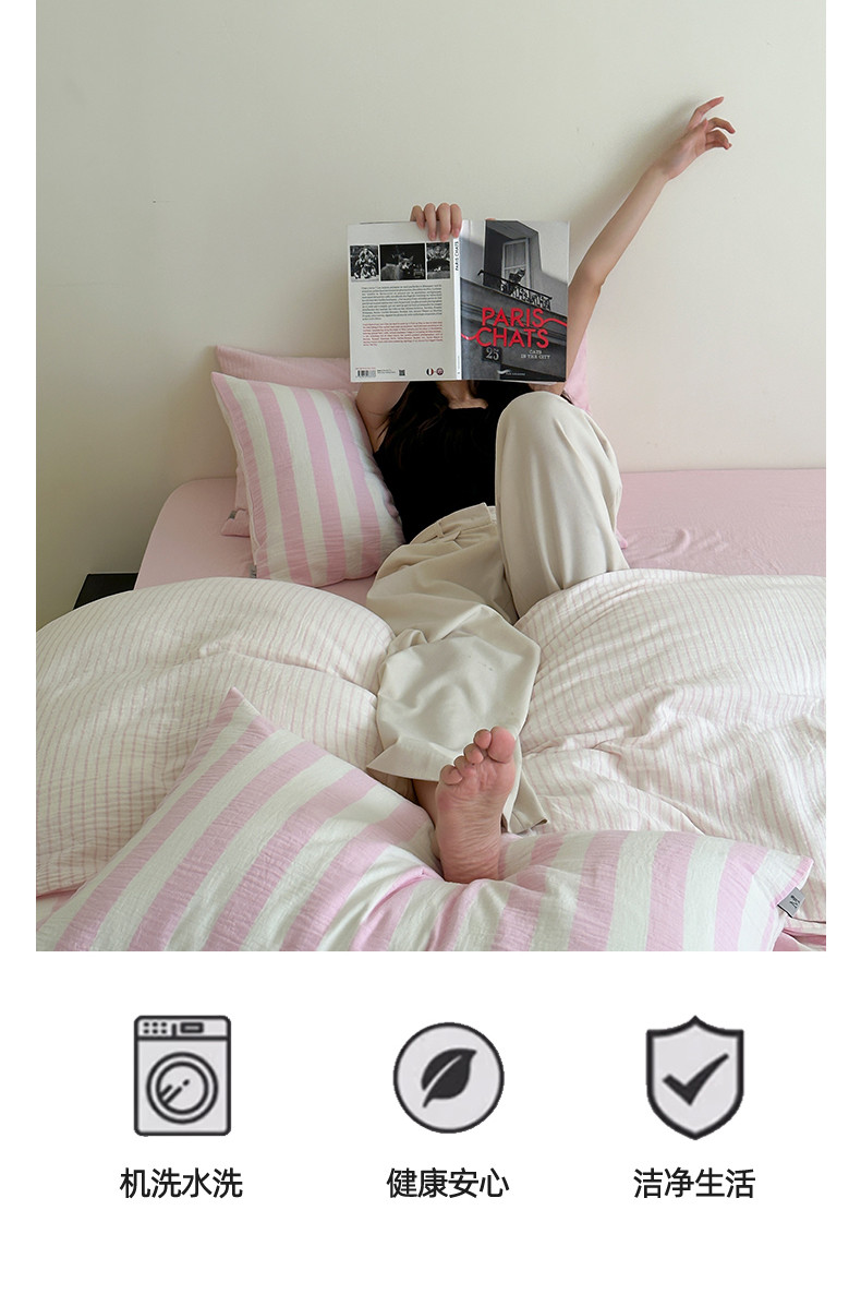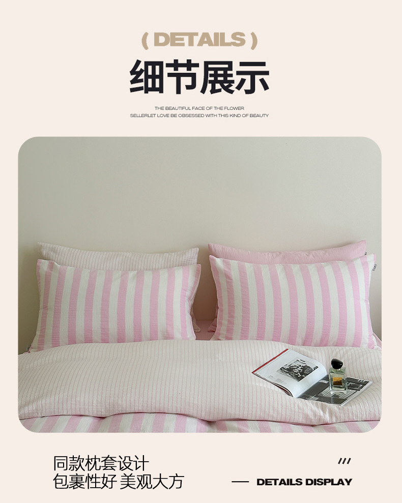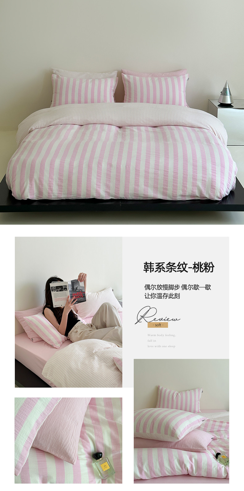 商品名称:玛奇朵 2023新款色织双层皱纱-韩系条纹四件套 韩系条纹-桃粉